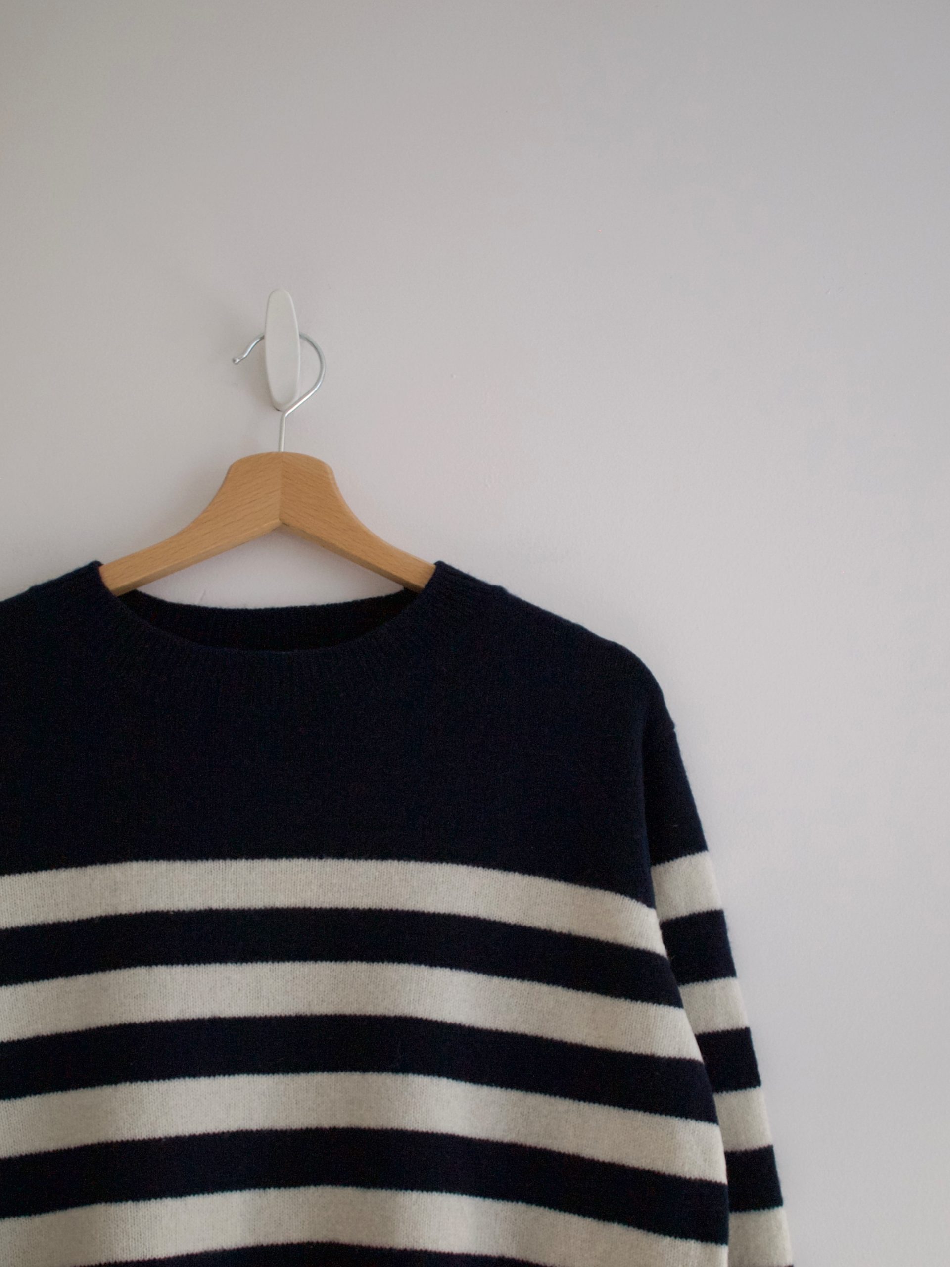 Minimalistyczny kaszmirowy sweter o pudełkowym kroju. Sweter bardzo miękki i przyjemny, ma dwie małe zacerowane dziurki, nie widoczne w noszeniu, poza tym brak mankamentów. Wymiary poniżej.