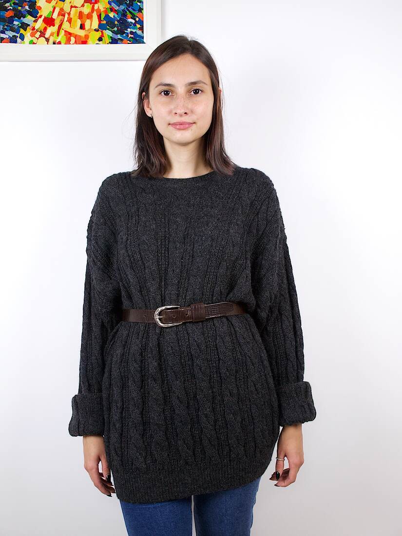 Obszerny sweter w warkocze marki Clark Ross, w 100% wykonany z alpaki. Brak metki z rozmiarem, polecam jako oversize. Idealny stan.