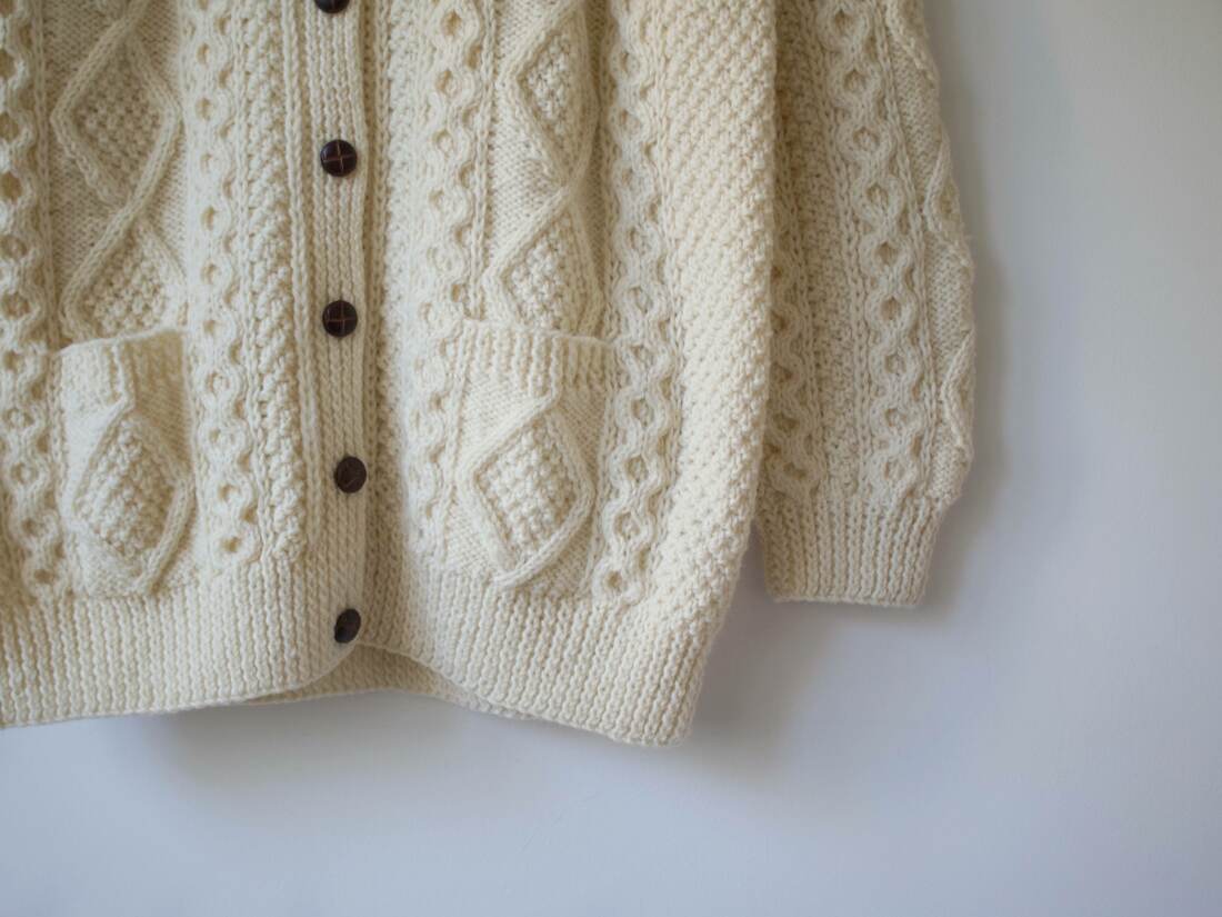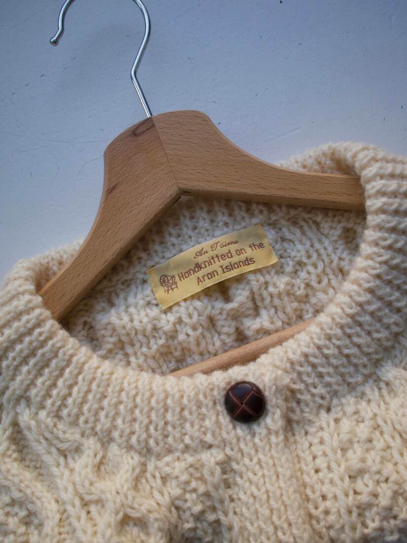 Bardzo gruby wełniany sweter. Ręcznie robiony na wyspach Aran w pracowni An Tuirne. Dostępny do zamówienia na stronie pracowni w cenie 295 euro, czyli za ponad 1300 zł.