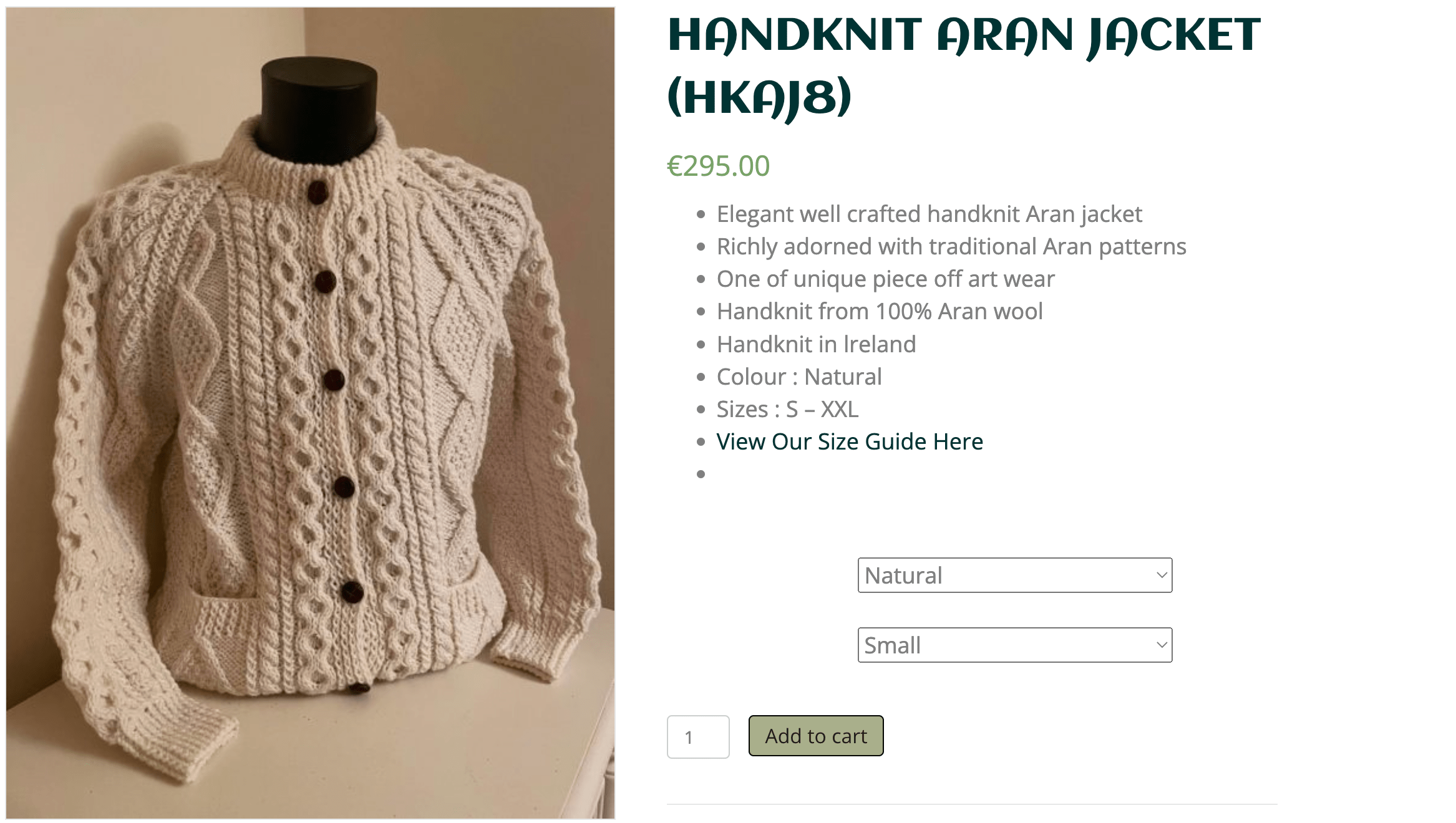 Swetry aran są robione z nieprzetworzonej wełny owczej, taka wełna zawiera naturalną lanolinę i ma właściwości wodoodporne. Cery wrażliwe może gryźć.