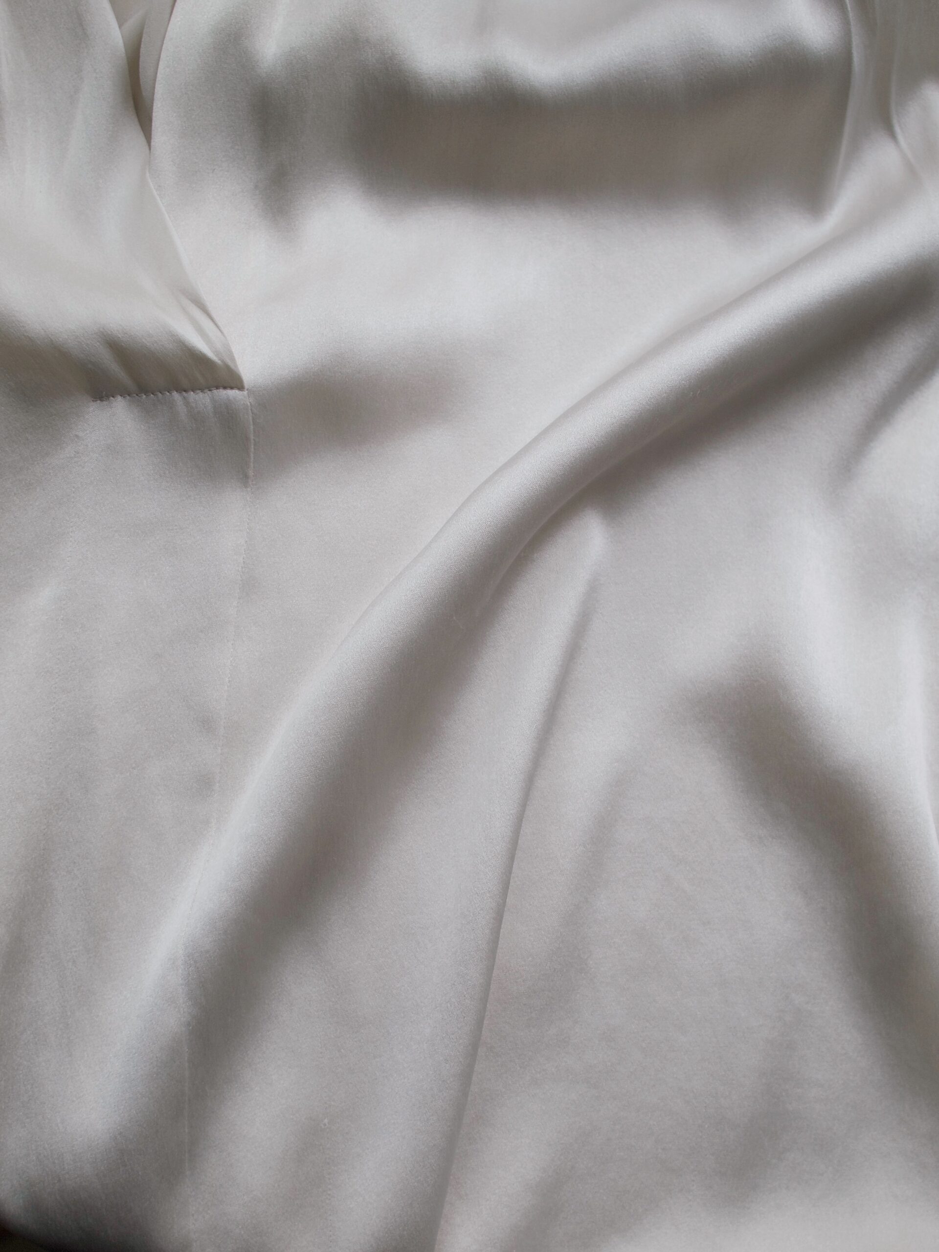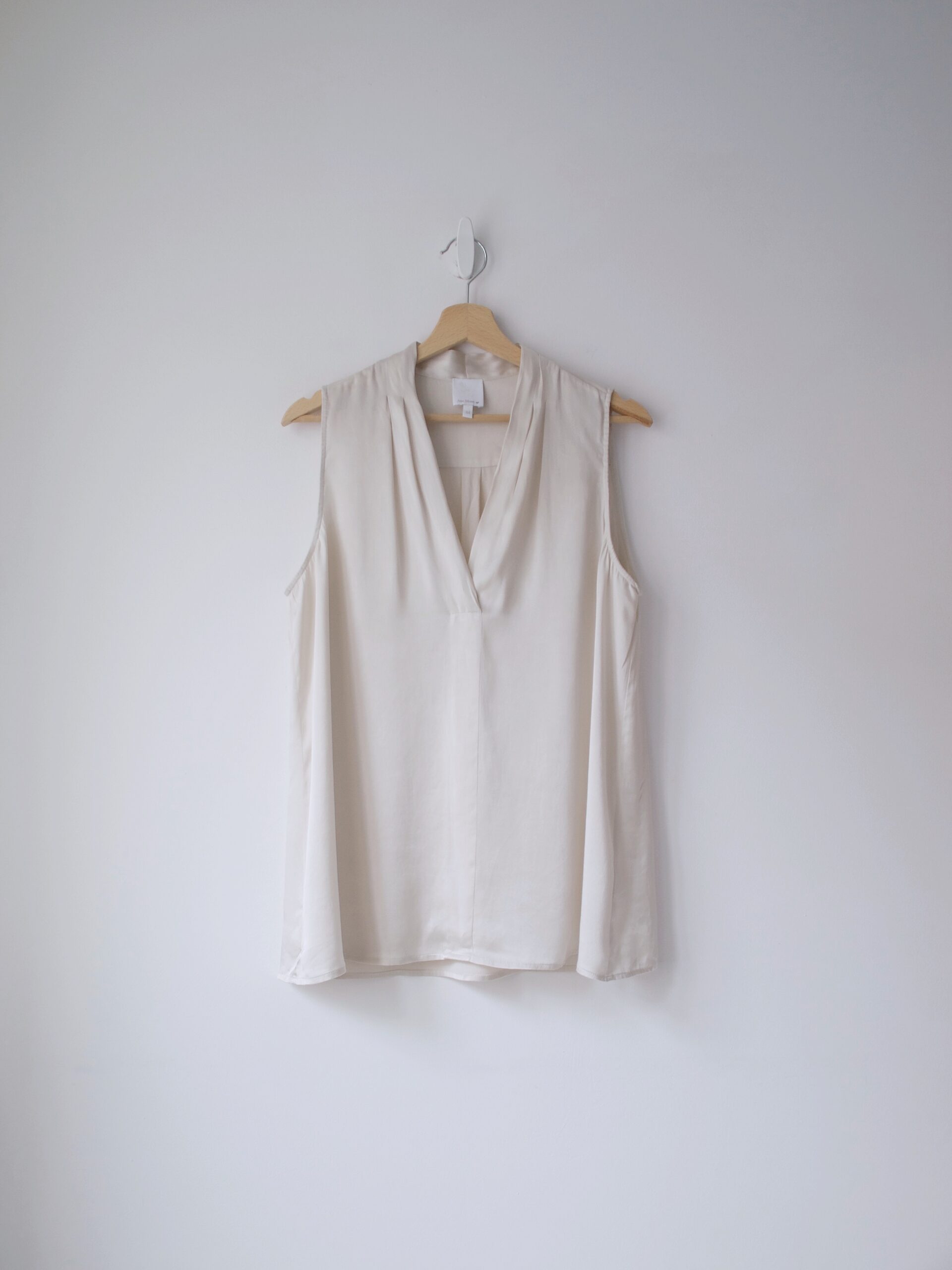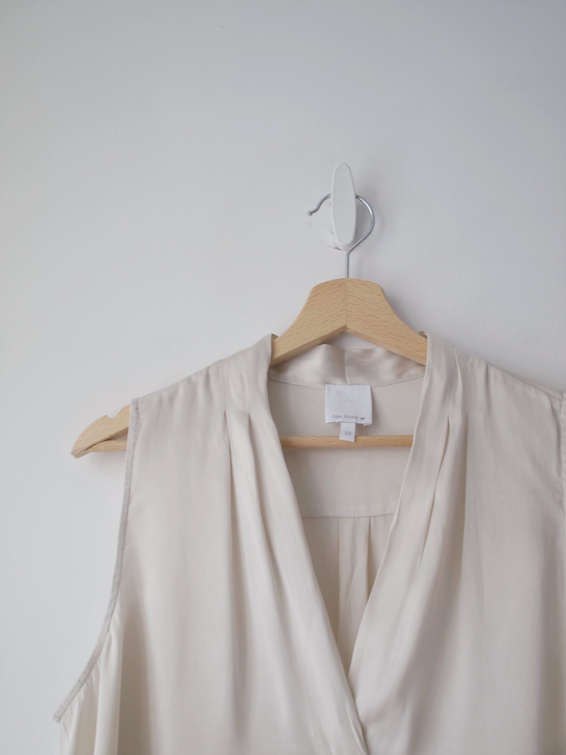 Jedwabna bluzka w kolorze szampańskiem, norweska marka Ane Mone. Rozmiar z metki: 44 Skład: 95% jedwab, 5% elastan Stan: bez wad Szerokość w klatce 55 cm Długośćcałkowita 70 cm
