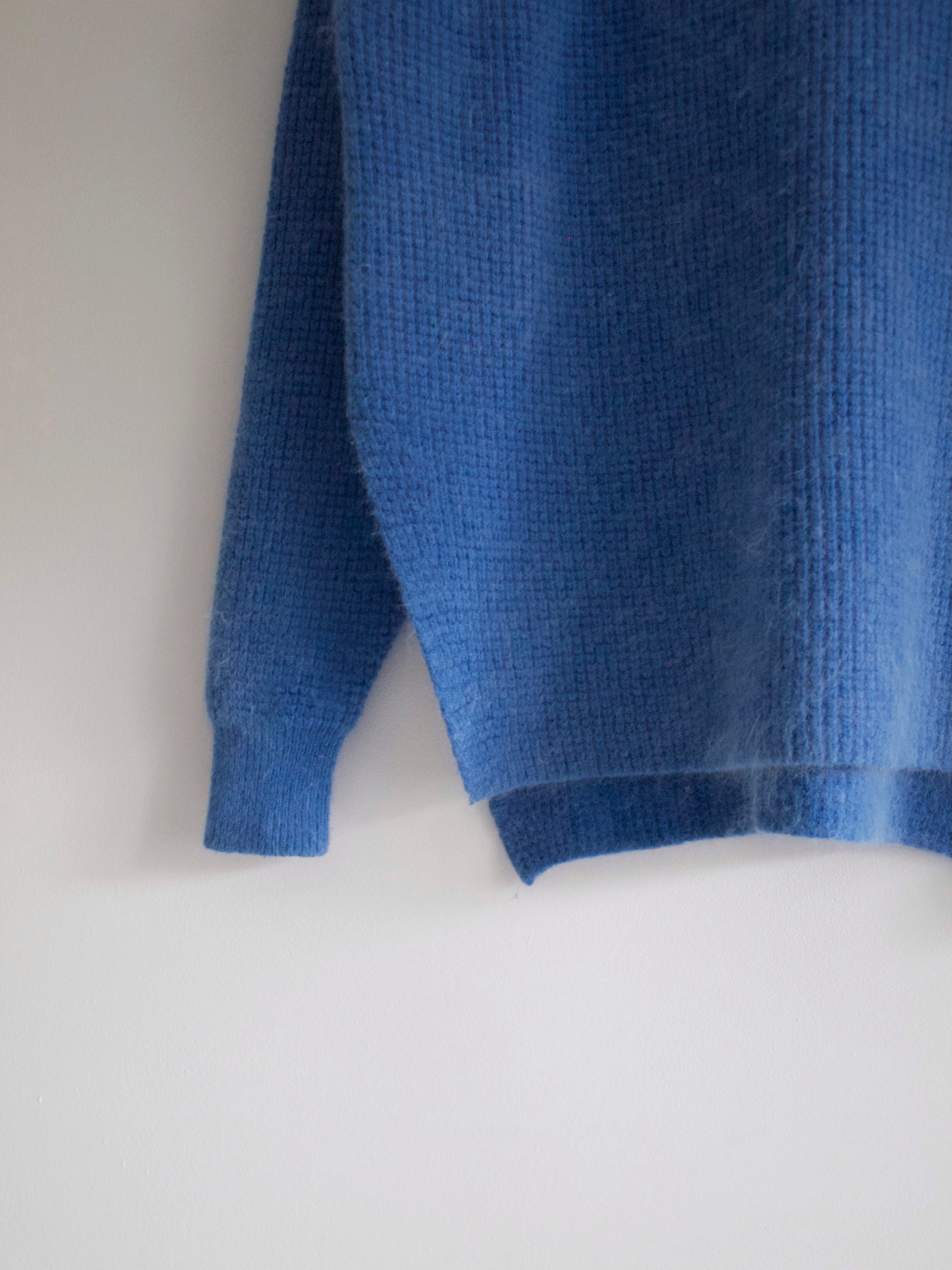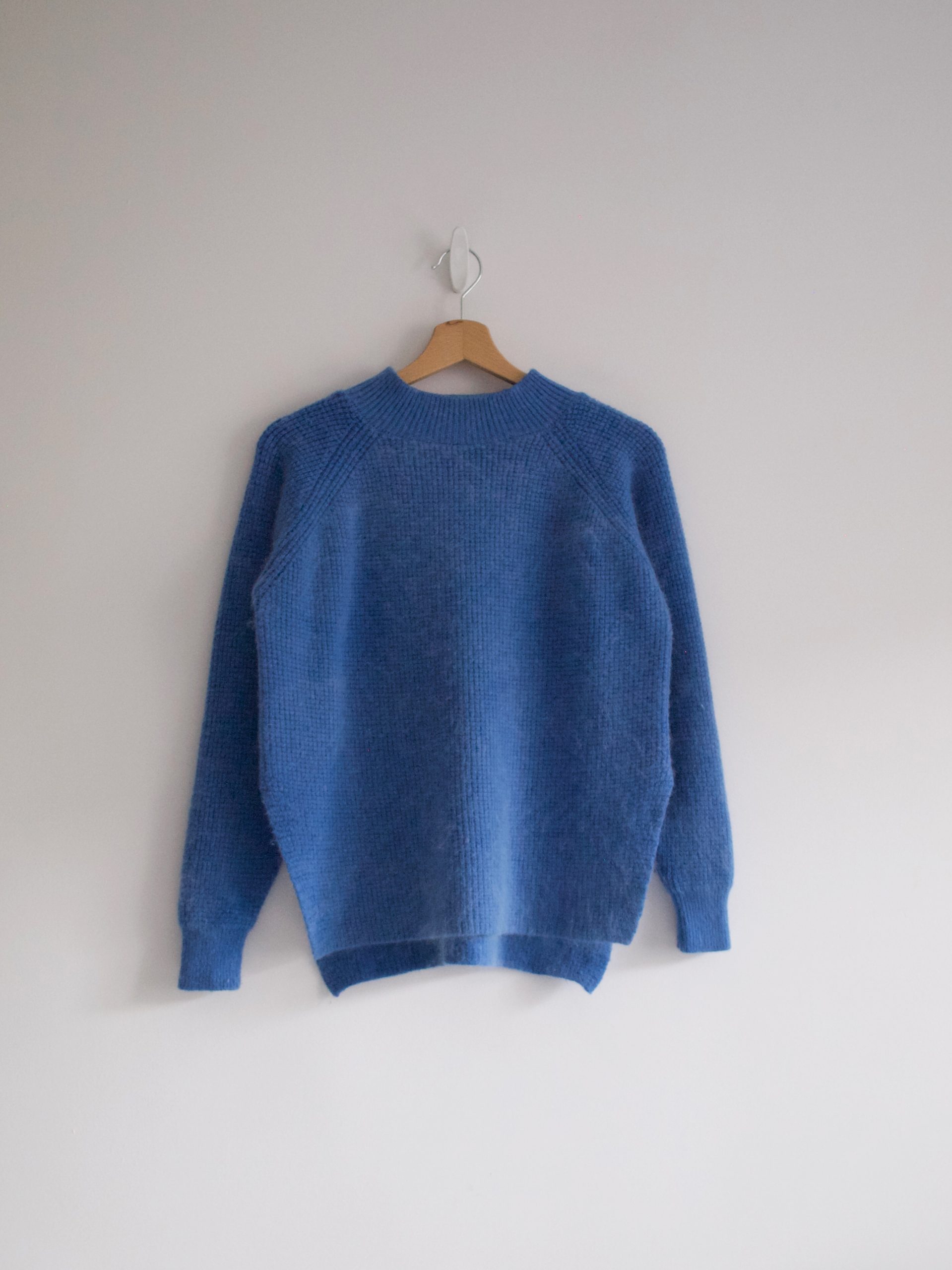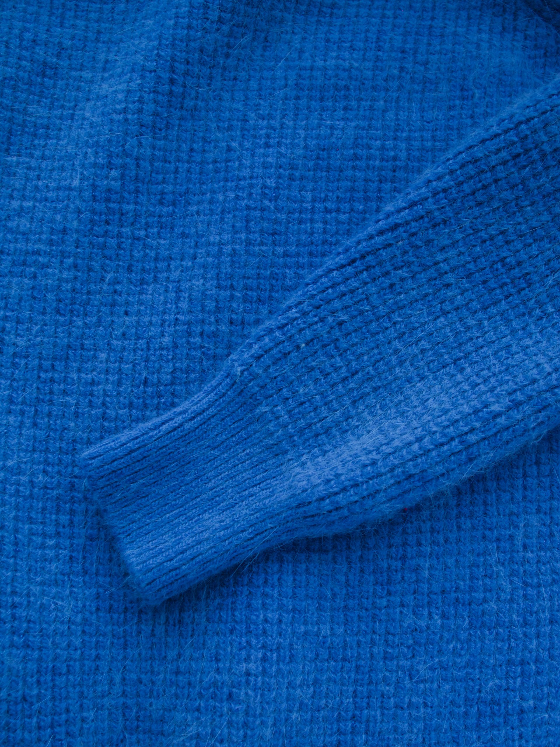Bardzo puszysty sweter w pięknym odcieniu niebieskiego. Rozmiar z metki: brak Skład: brak metki, wełna+angora Stan: bez wad Szerokość w klatce 51 cm Długośćcałkowita 53-58 cm