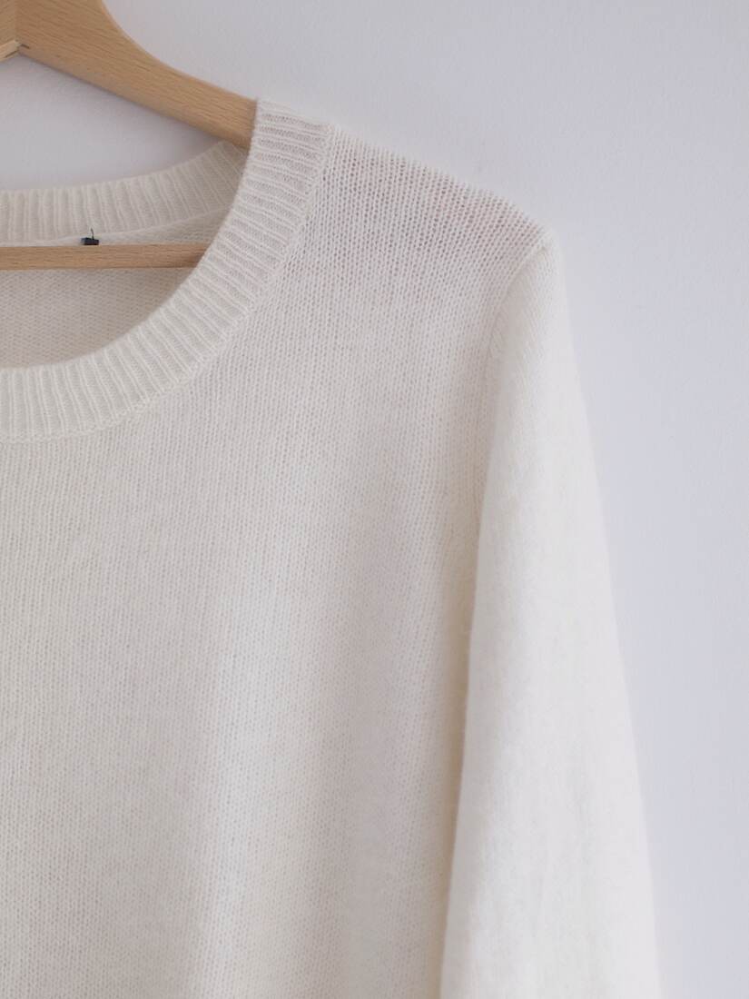 Puszysty sweter z materiału z dużym dodatkiem angory. Brak metki z rozmiarem, docelowo będzie pasować na M, na mniejsze jako oversize. Bez wad.