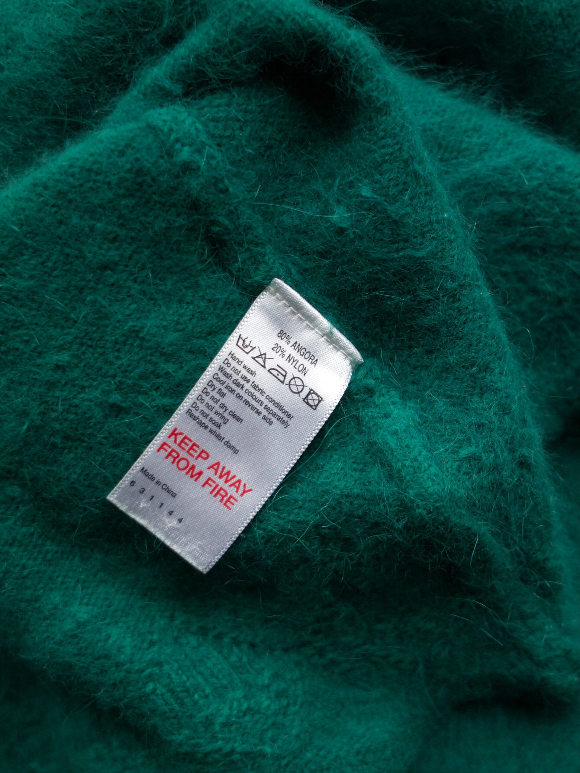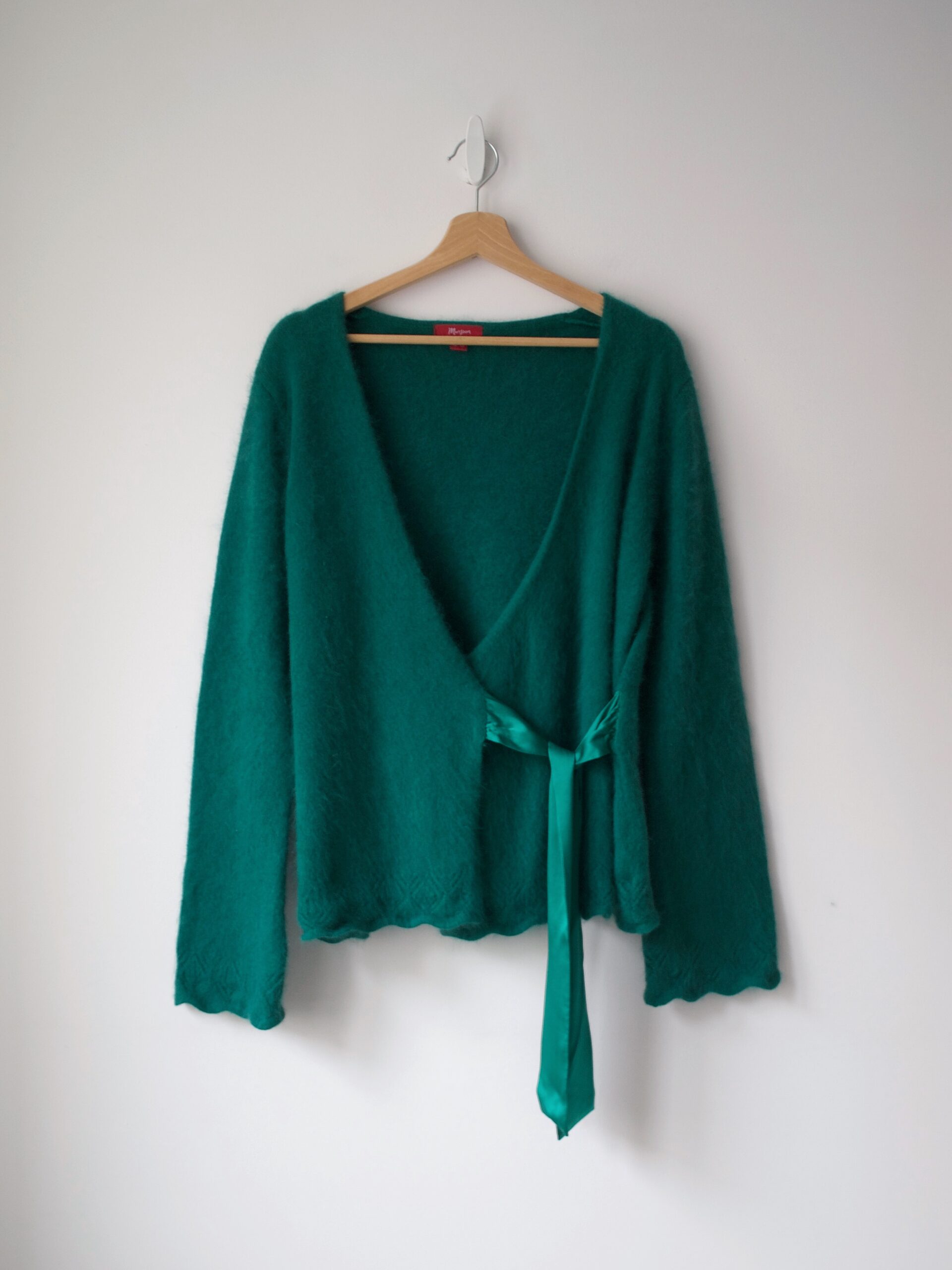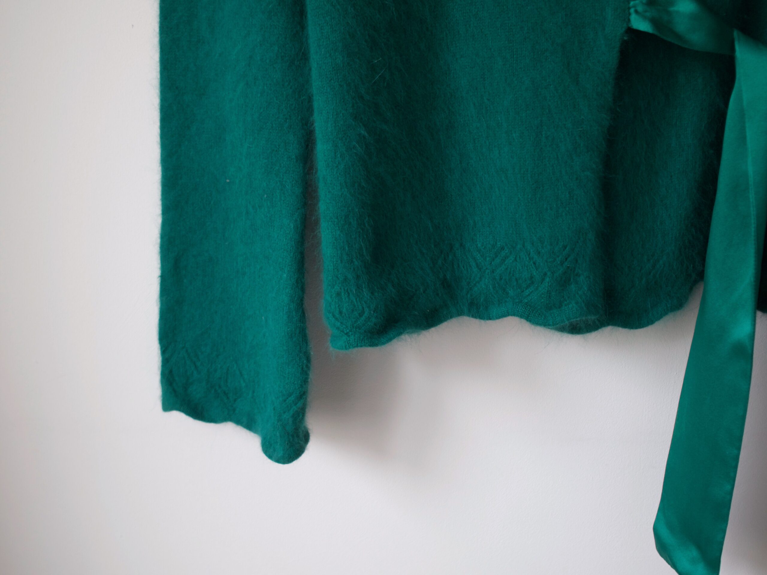 Bardzo puszysty sweter o kopertowym fasonie, wiązania wykonane z jedwabiu. Rozmiar: 48 Skład: 80% angora, 20% nylon Stan: bez wad Szerokość w klatce 52,5 cm Długośćcałkowita 65 cm