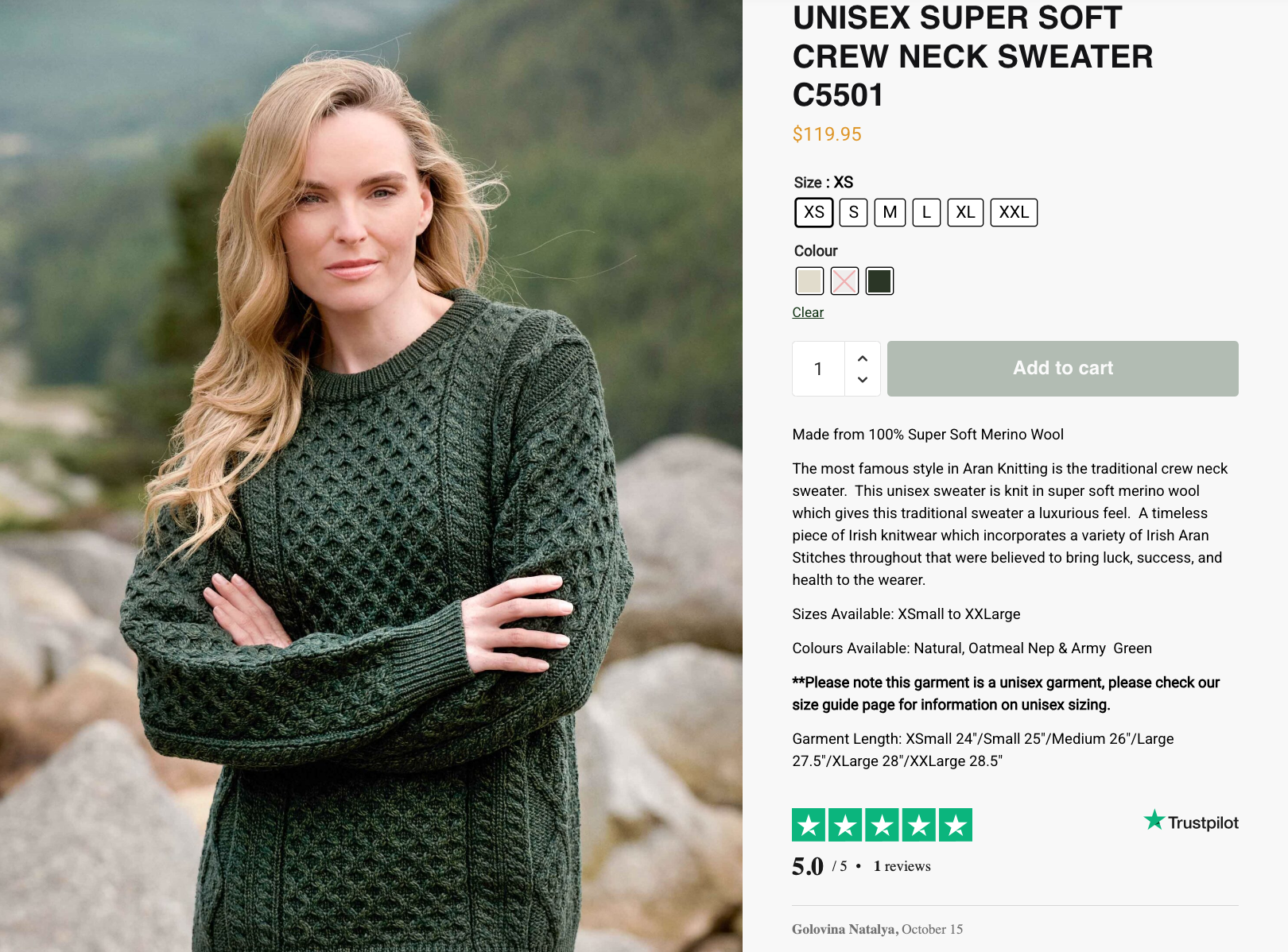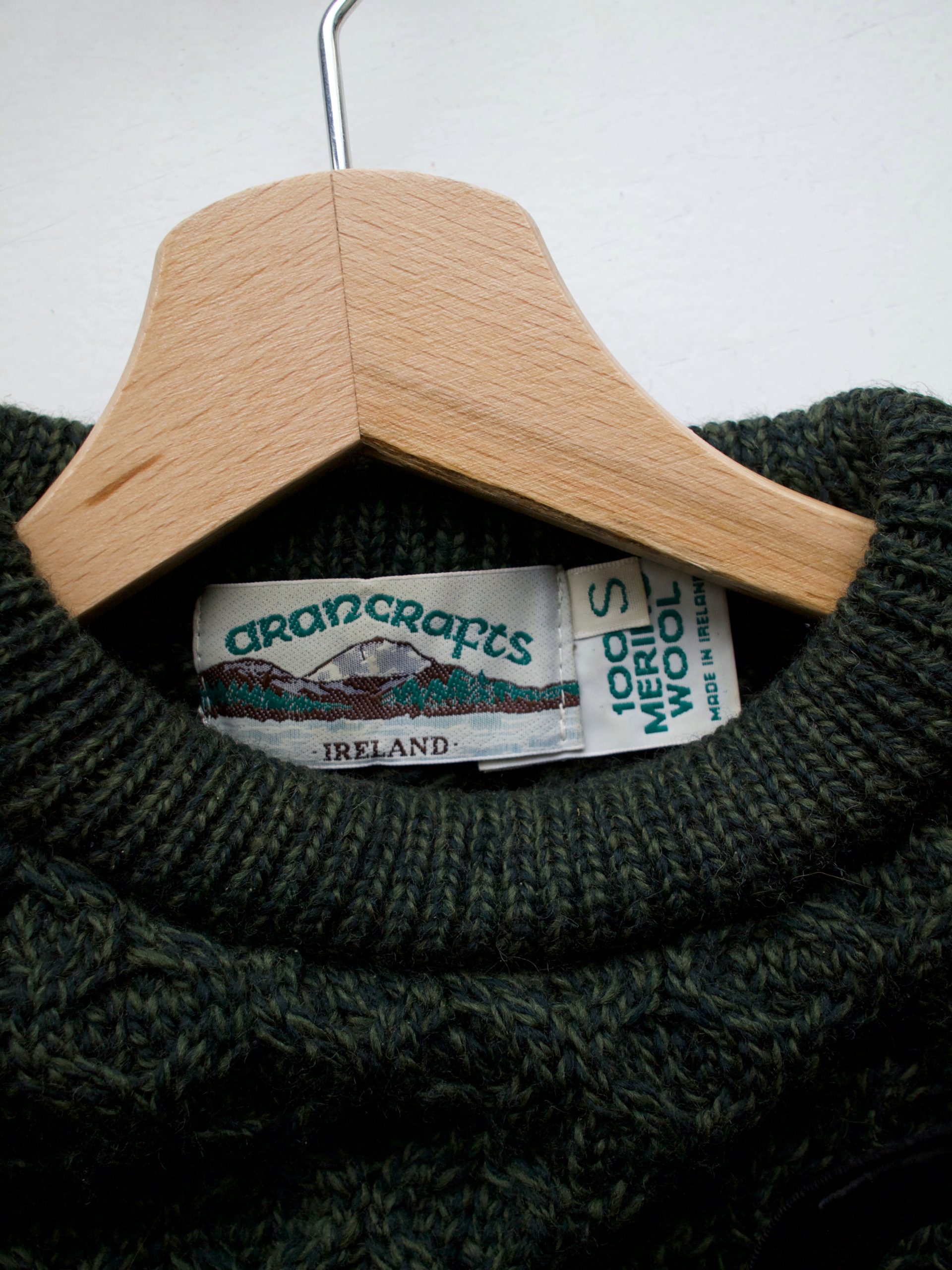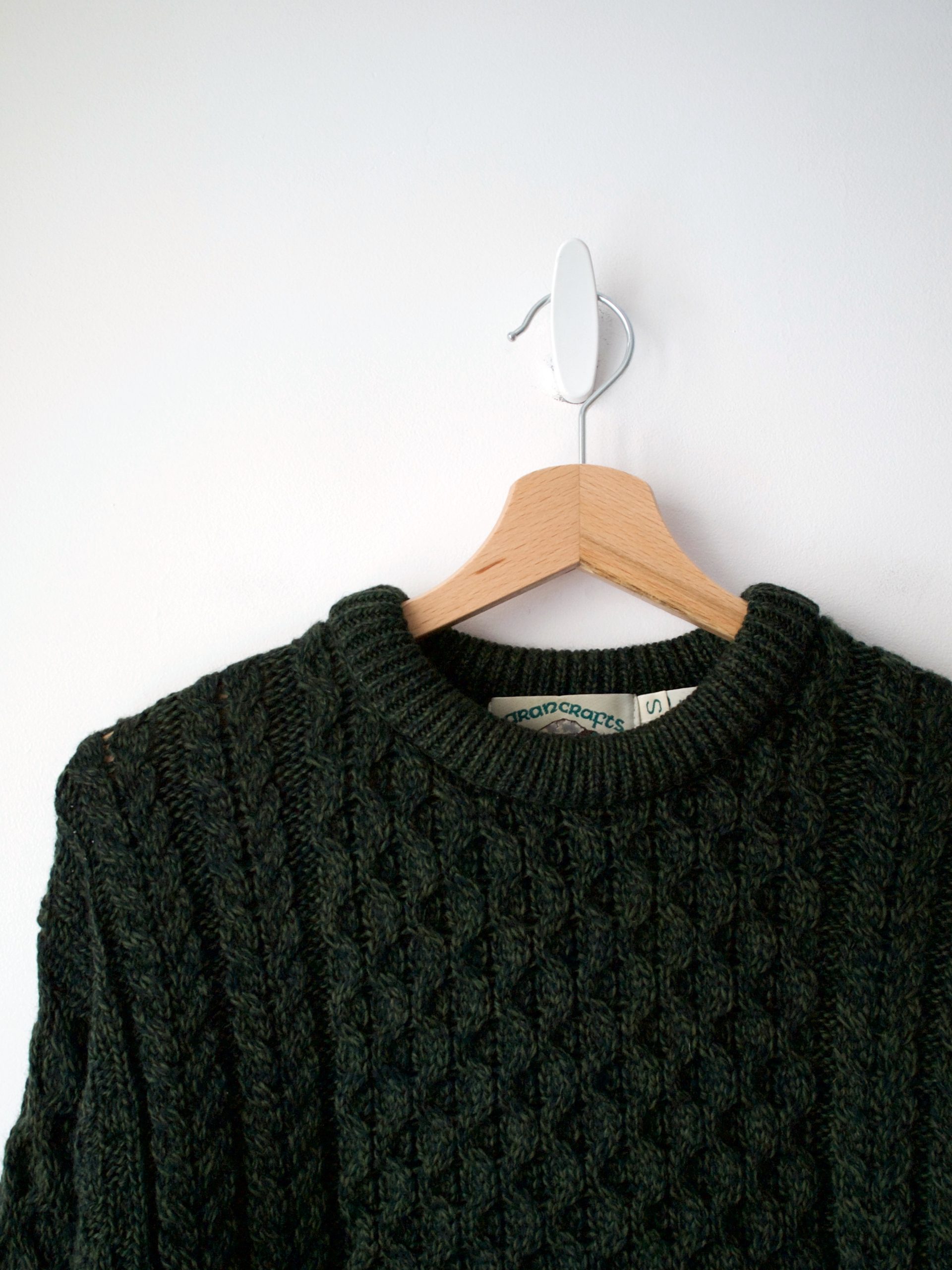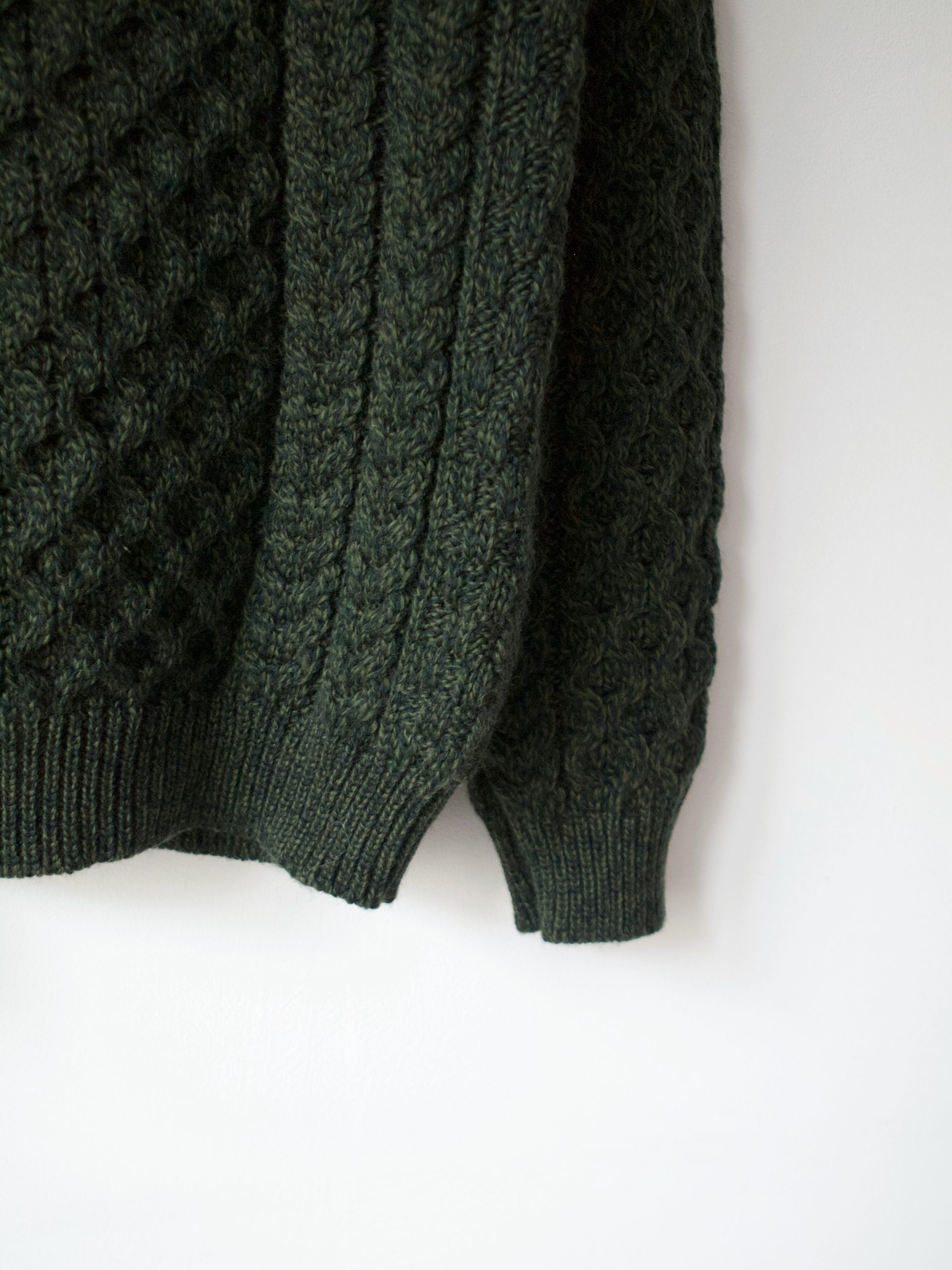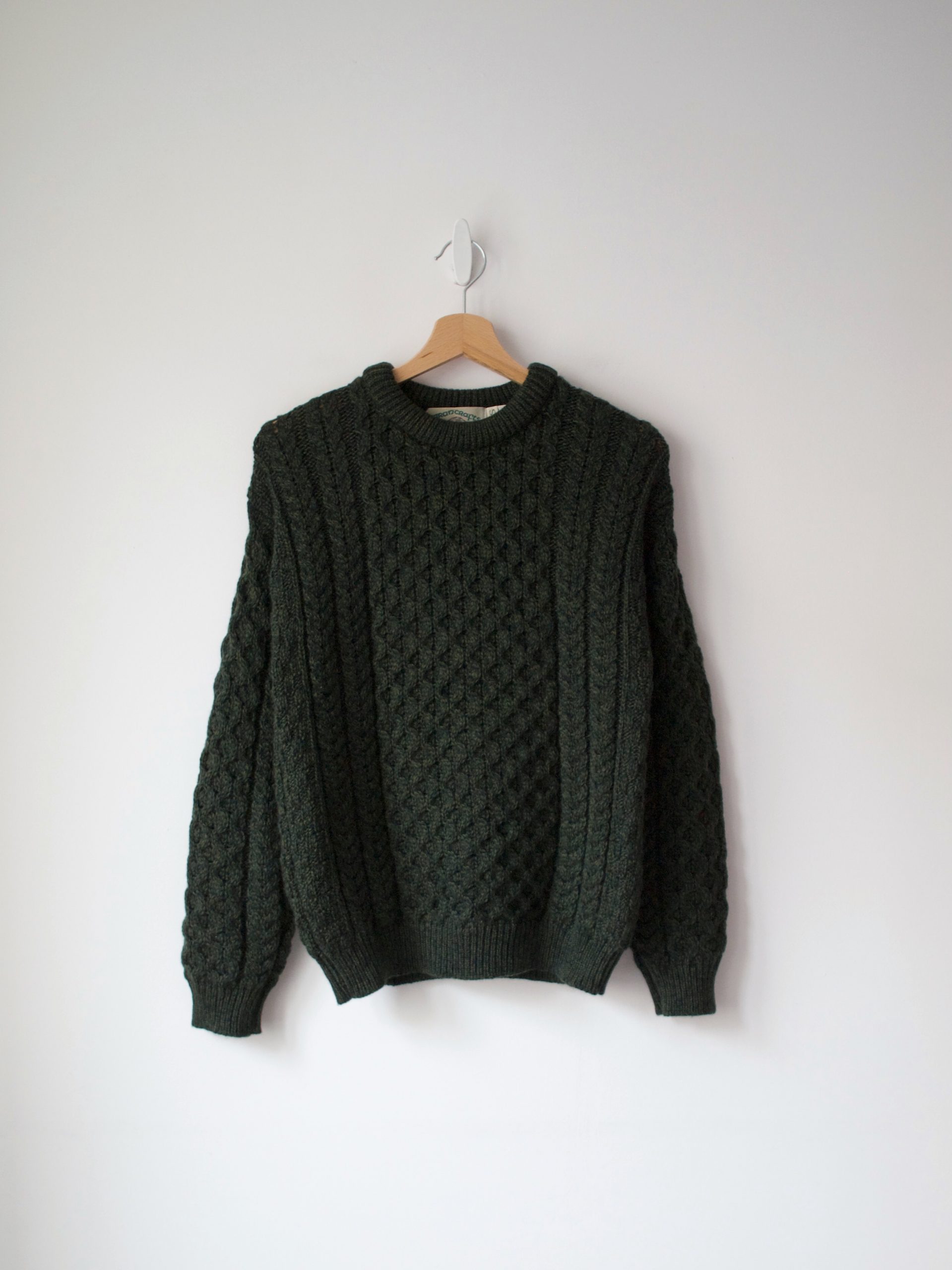 Sweter o grubym splocie w kolorze zielonego melanżu. Renomowana irlandzka marka Aran Crafts, specjalizująca się w produkcji wysokiej jakości swetrów i dzianin w tradycyjnym stylu. Wykonany w 100% z wełny merino – miękkiej i niegryzącej. Model dostępny na stronie marki w cenie 120 USD.