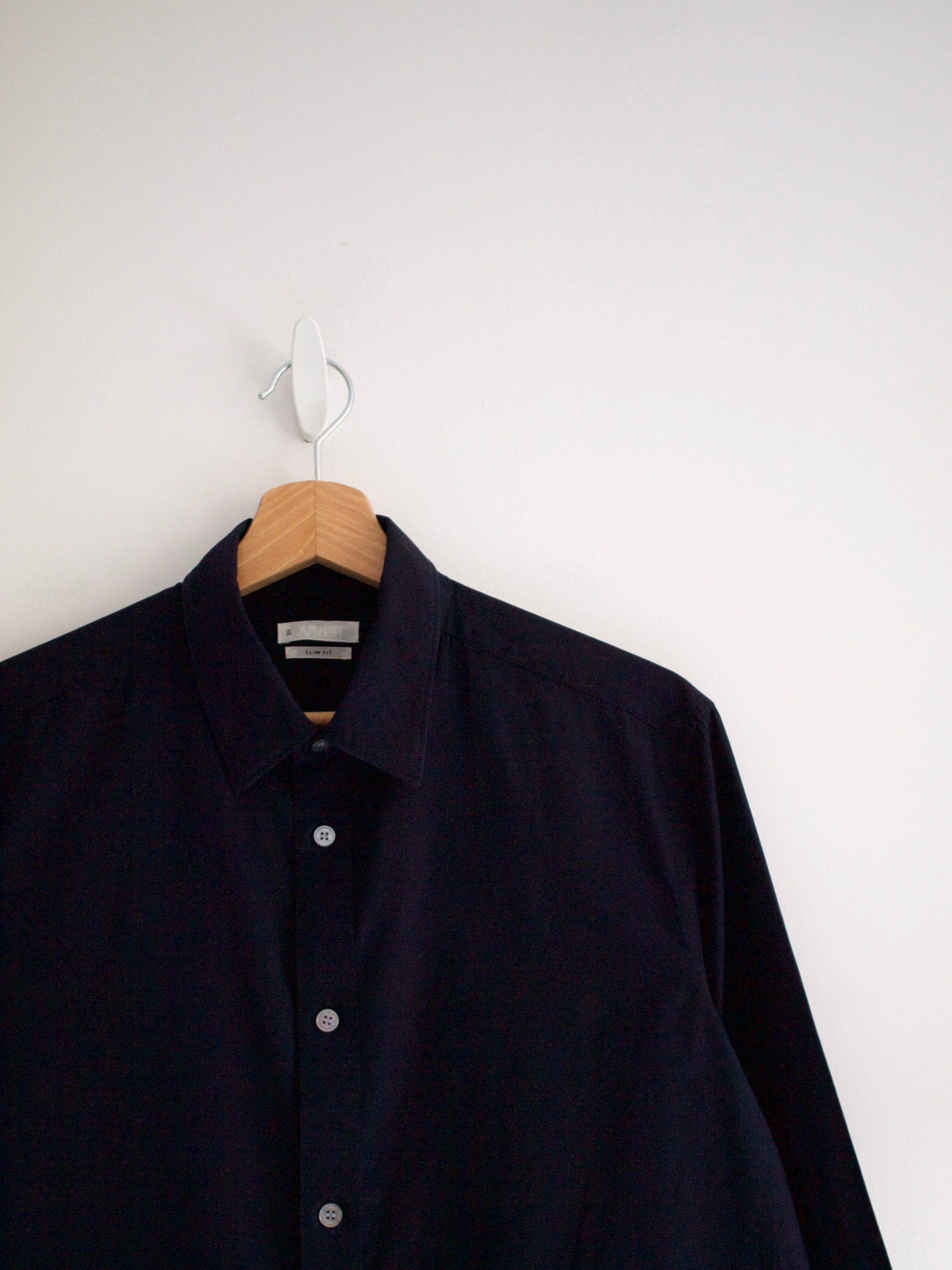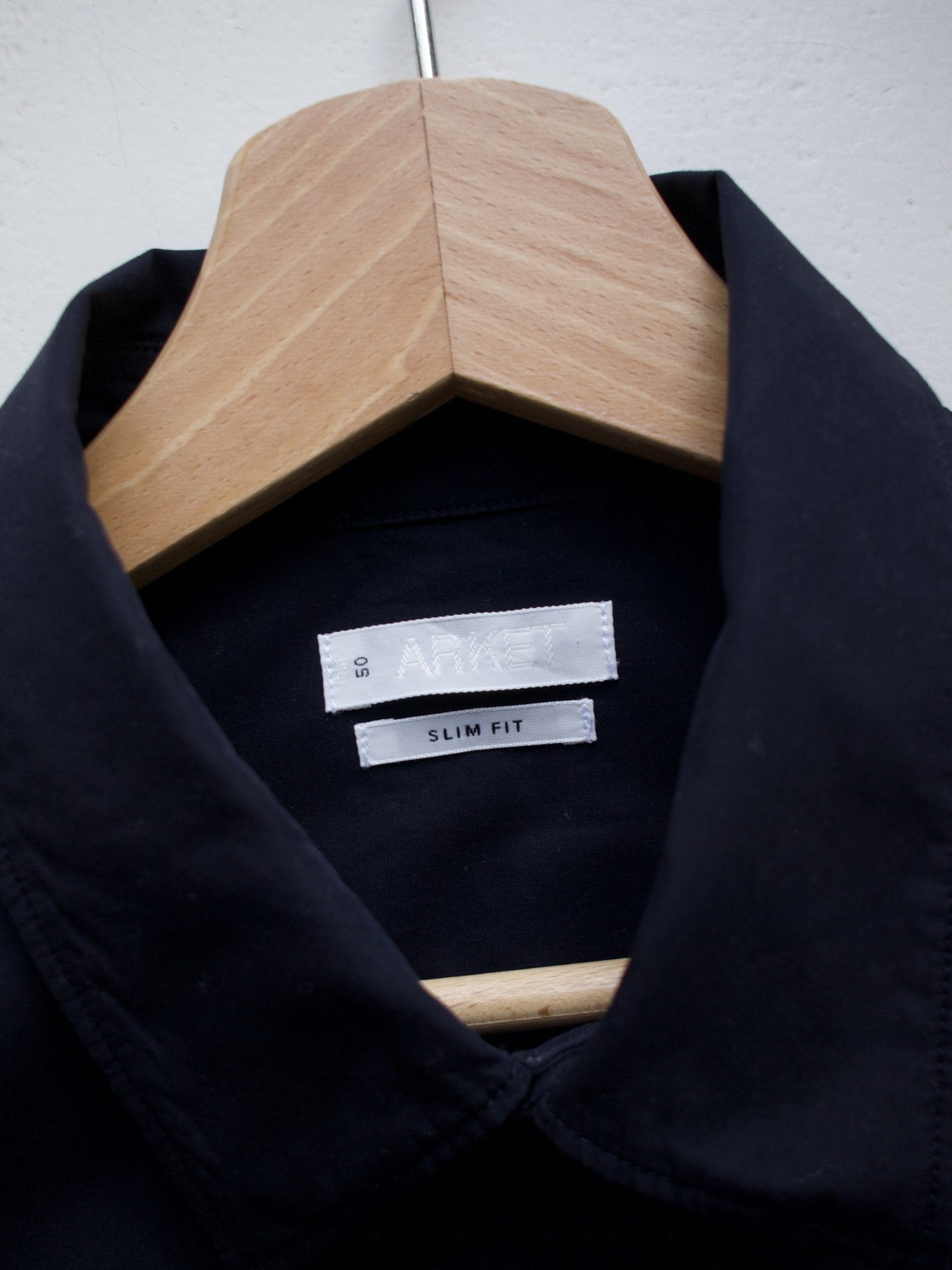 Koszula skandynawskiej marki Arket, męska, o kroju slim fit. Kolor: ciemny granat. Rozmiar z metki: 50 Skład: 100% bawełna Stan: bez wad Szerokość w klatce 52 cm Długośćcałkowita 76 cm