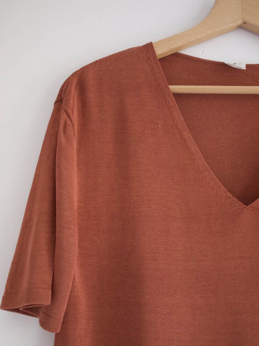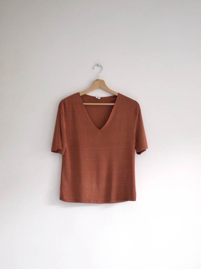 Dzianinowy t-shirt o luźnym fasonie. Luksusowa skandynawska marka Arket. Wycięta metka ze składem, prawdopodobnie wiskoza. Rozmiar z metki XS, polecam na XS-S-M. Bez wad.