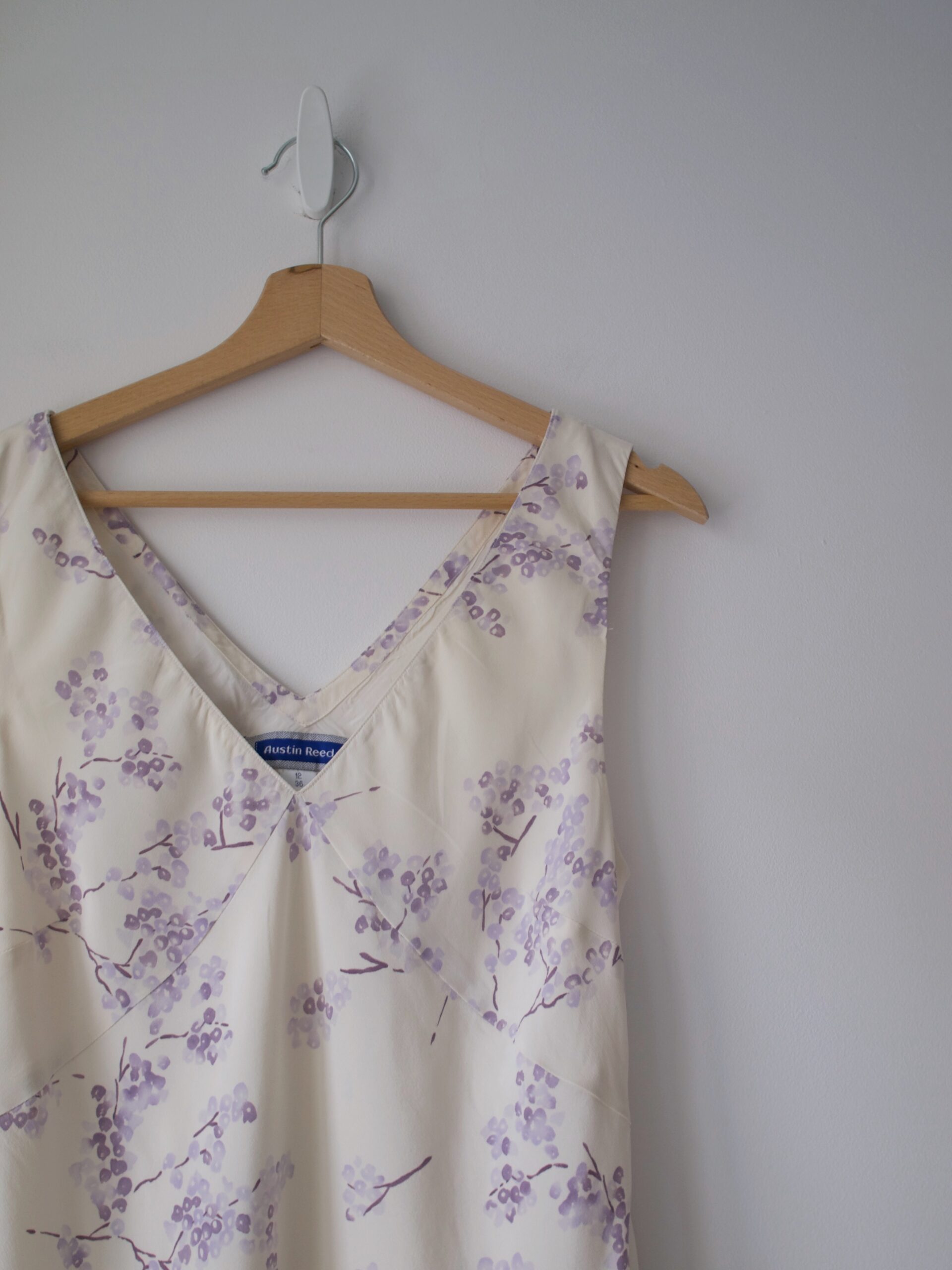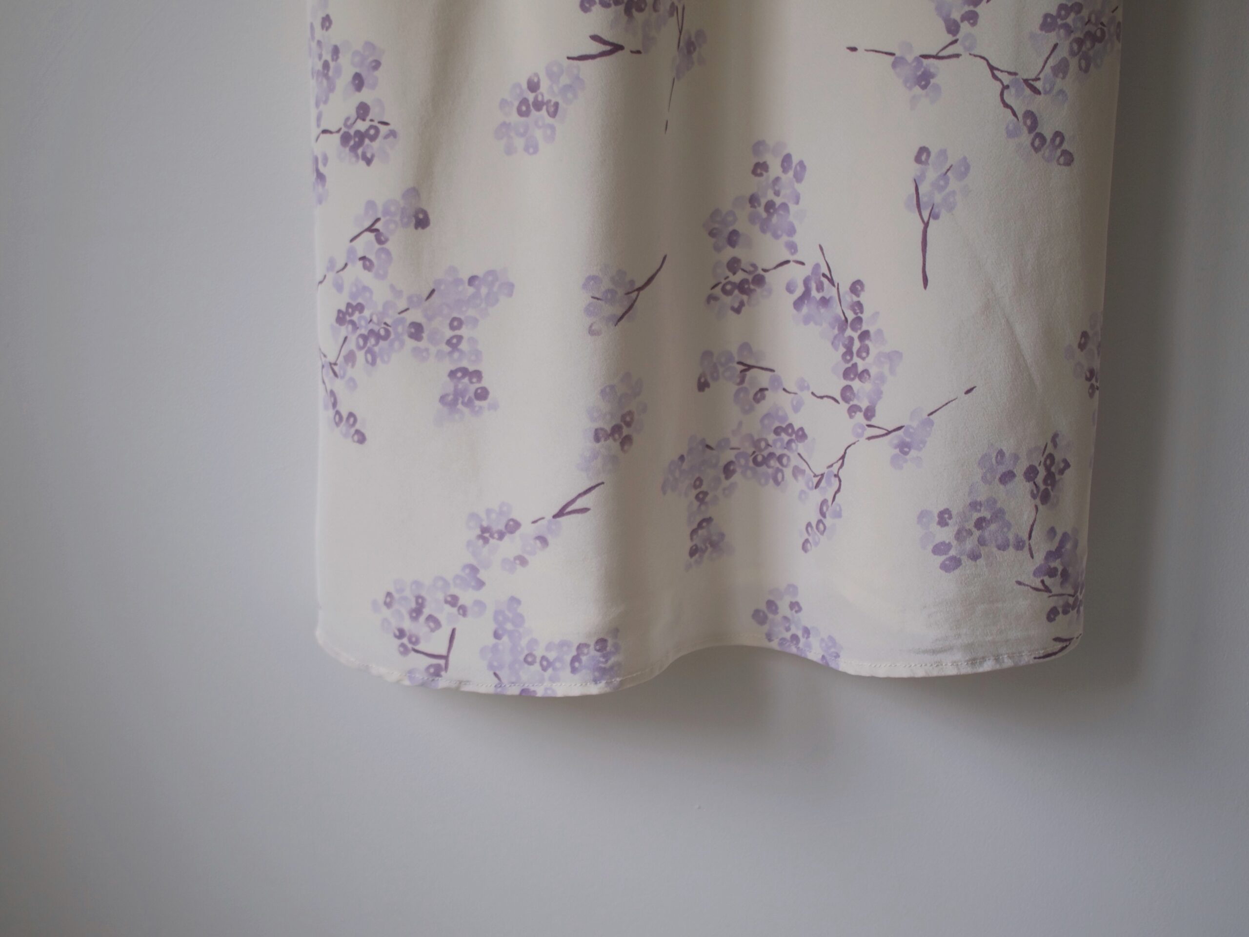 Prążkowany top vintage, w 100% wykonany z jedwabiu. Kolor to szarość/srebro. Brak metki ze składem, polecam na XS-S. Bez wad. Modelka nosi rozmiar XS-S.