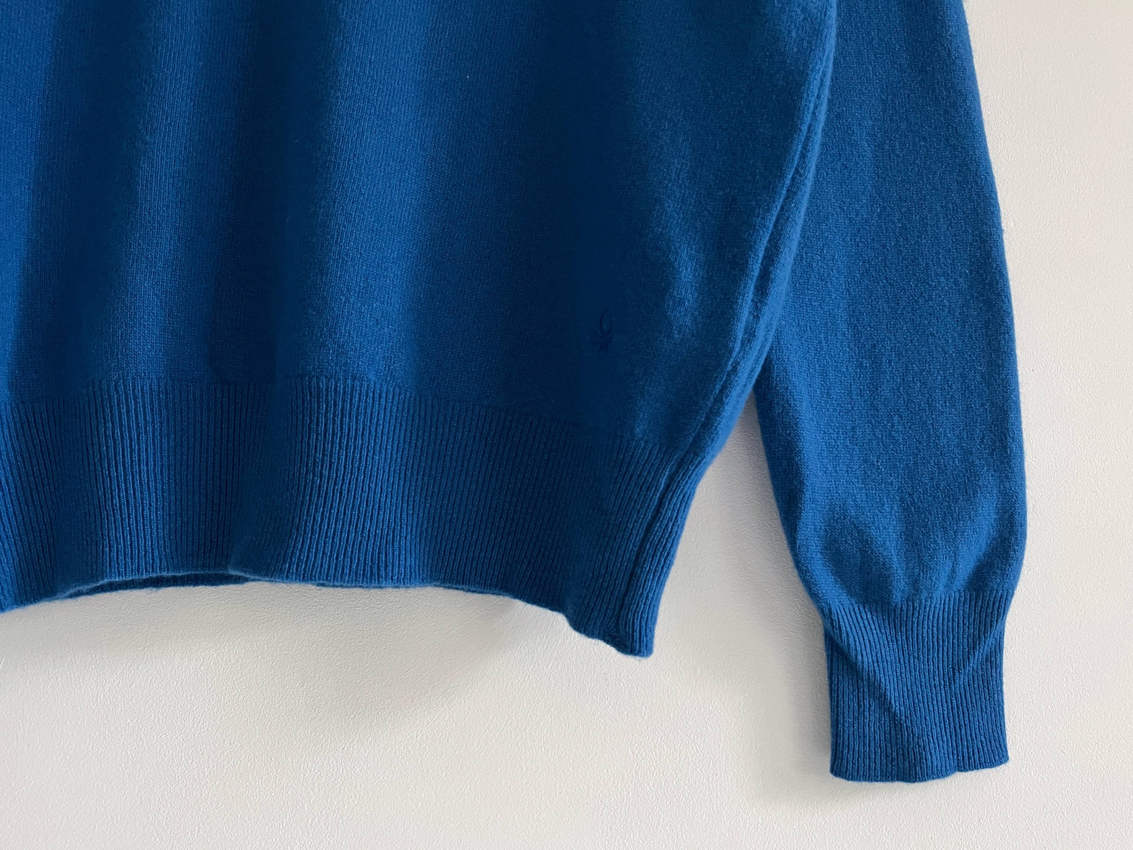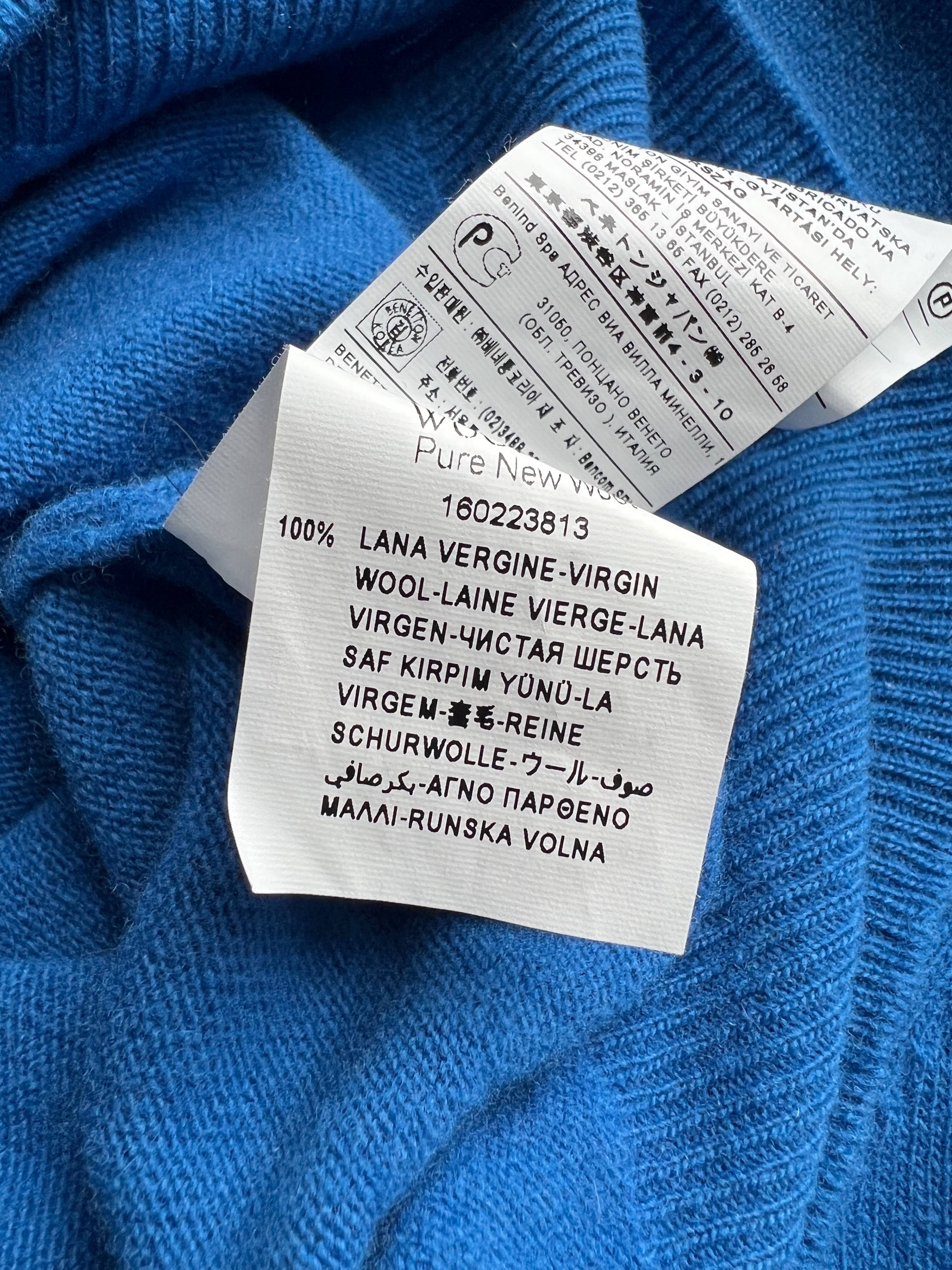 Sweter w pięknym chabrowym kolorze, marka Benetton. Na jednym rękawie malutkie cerowanie, nie widoczne w noszeniu
