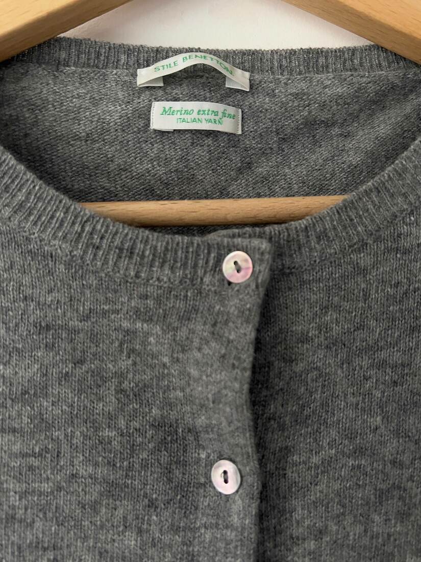 Szary sweterek marki Benetton. W 100% wykonany z wełny merynosa. Polecam na XS-S, bardzo dobry stan.