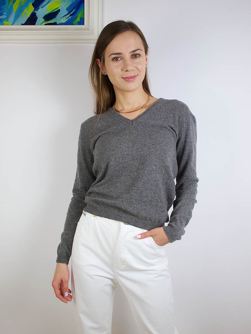 Minimalistyczny kaszmirowy sweter o pudełkowym kroju. Sweter bardzo miękki i przyjemny, ma dwie małe zacerowane dziurki, nie widoczne w noszeniu, poza tym brak mankamentów. Wymiary poniżej.
