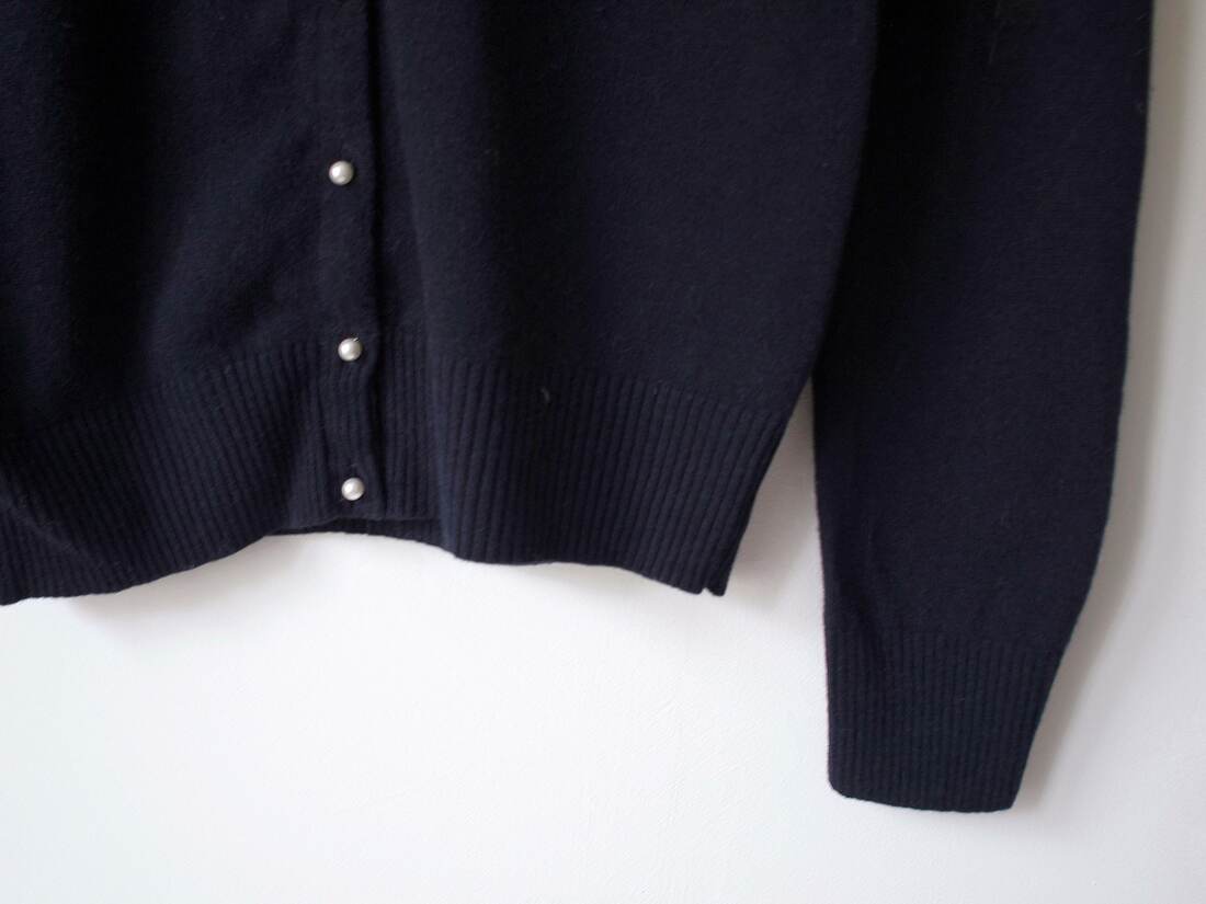 Sweter marki Benetton, zapinany na guziki w kształcie perełek. Kolor to bardzo ciemny granat, prawie czarny.