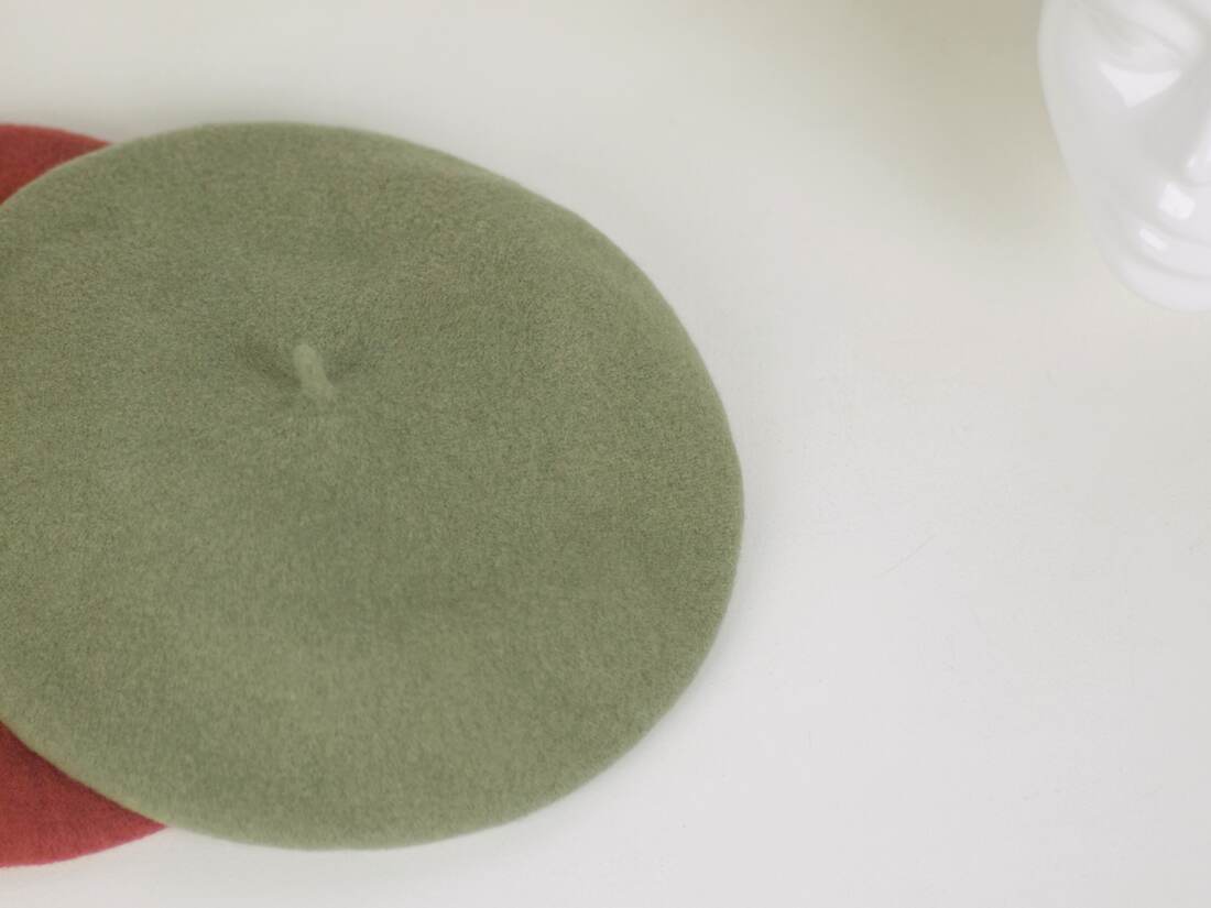 Wełniany beret vintage z okolic lat 90, wyprodukowany jeszcze w Czechosłowacji. Średnica ok 25 cm, średnica otworu od spodu ok. 15 cm. Kolor pistacjowy, 100% wełna, bez wad.