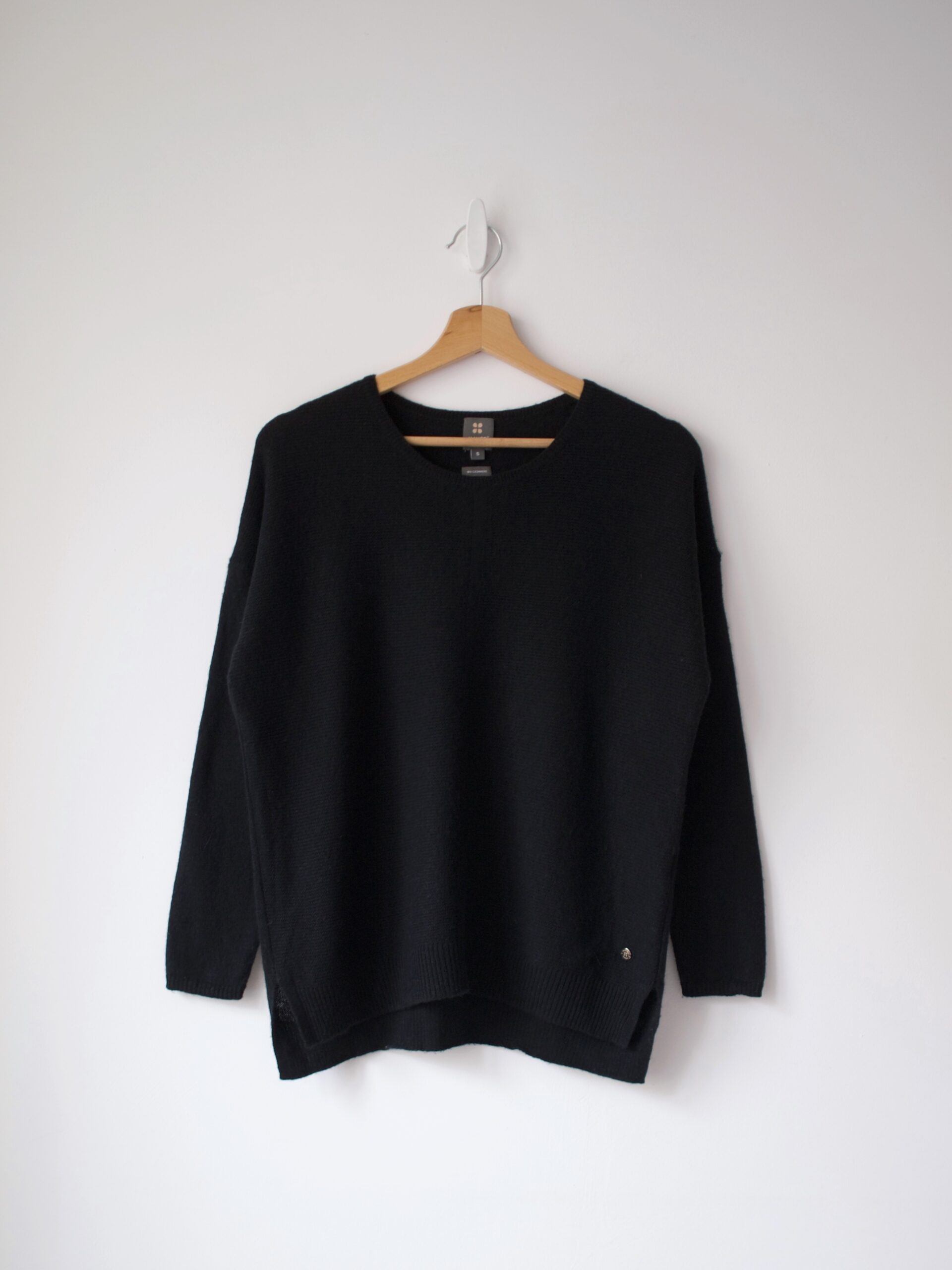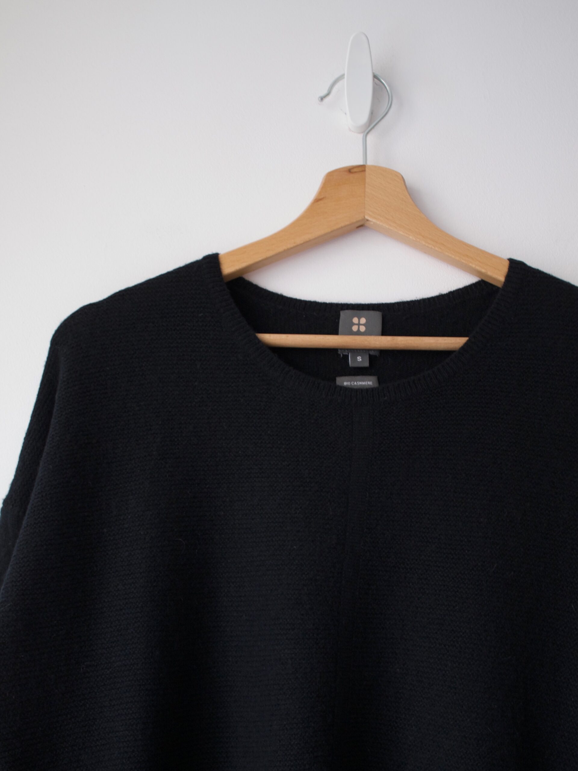 Rozmiar: S luźny Skład: 100% bio kaszmir Stan: bez wad Szerokość w klatce 53 cm Długość całkowita 57-62 cm