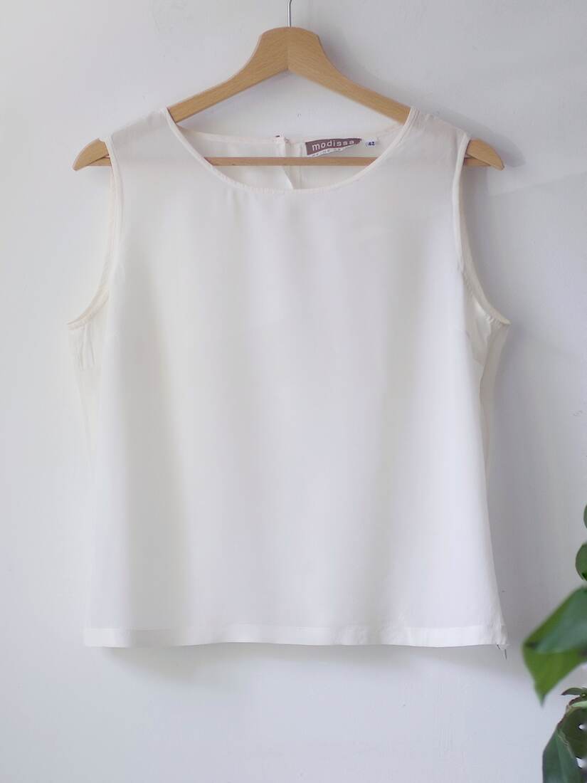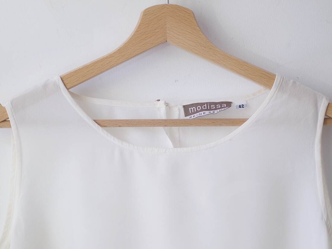 Minimalistyczna jedwabna bluzka o prostym kroju. Małe wycięcie zapinane na guzik z tyłu, z boku zamek. Rozmiar z metki 42, w rzeczywistości dość uniwersalny.