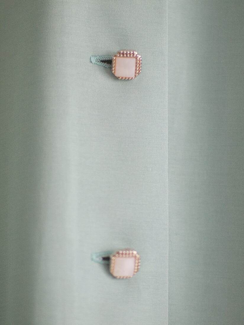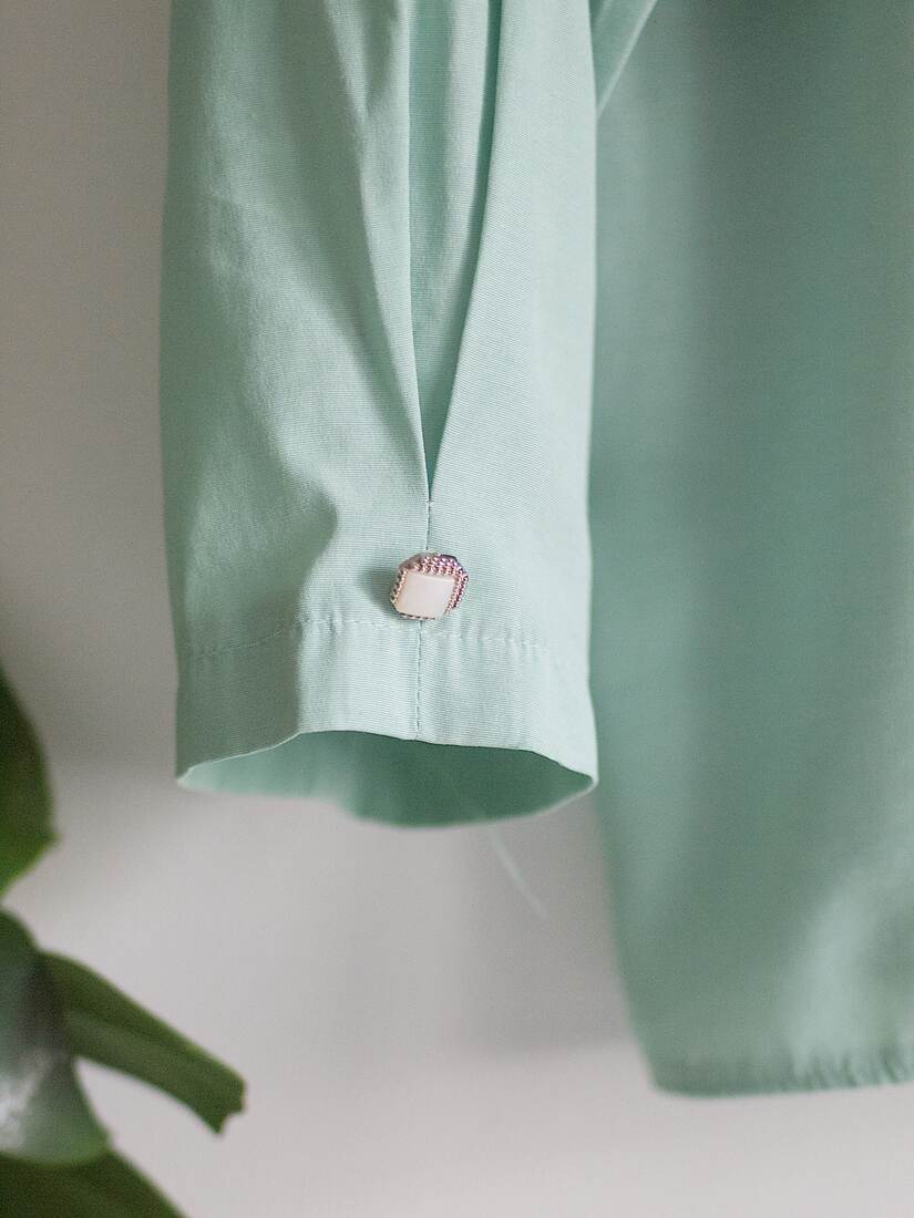 Bluzka vintage w pastelowym zielonym kolorze. Zapinana na ozdobne guziki, z kołnierzem stójką. Wycięte metki ze składem i rozmiarem, docelowo będzie pasować na r. M-L, na mniejsze jako oversize (proszę sugerować się wymiarami). Materiał prawdopodobnie wiskoza. Bez wad.