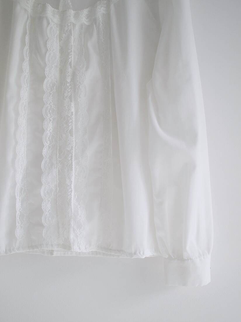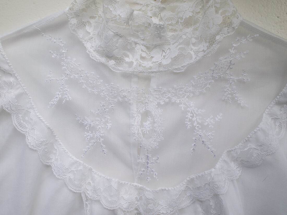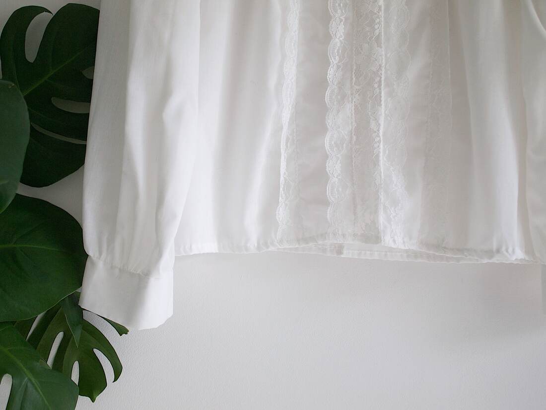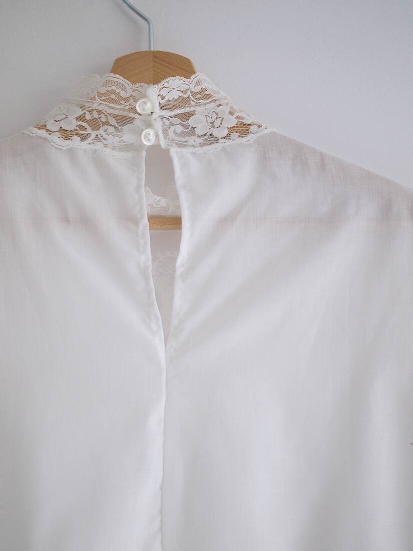 Bluzka vintage z koronkowymi wstawkami. Materiał 65% poliester, 35% bawełna. Z tyłu zapięcie na 2 guziki. Rozmiar z metki 46, docelowo będzie pasować na L, na mniejsze idealna jako oversize. Bez wad.