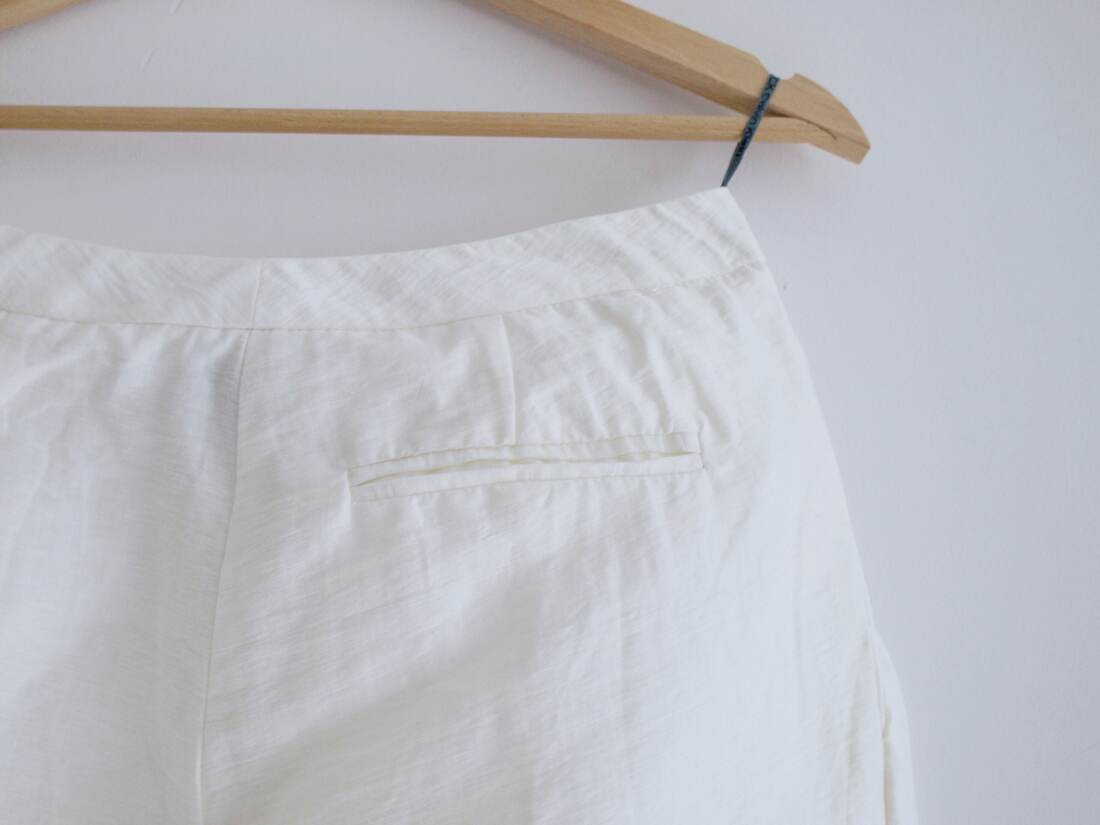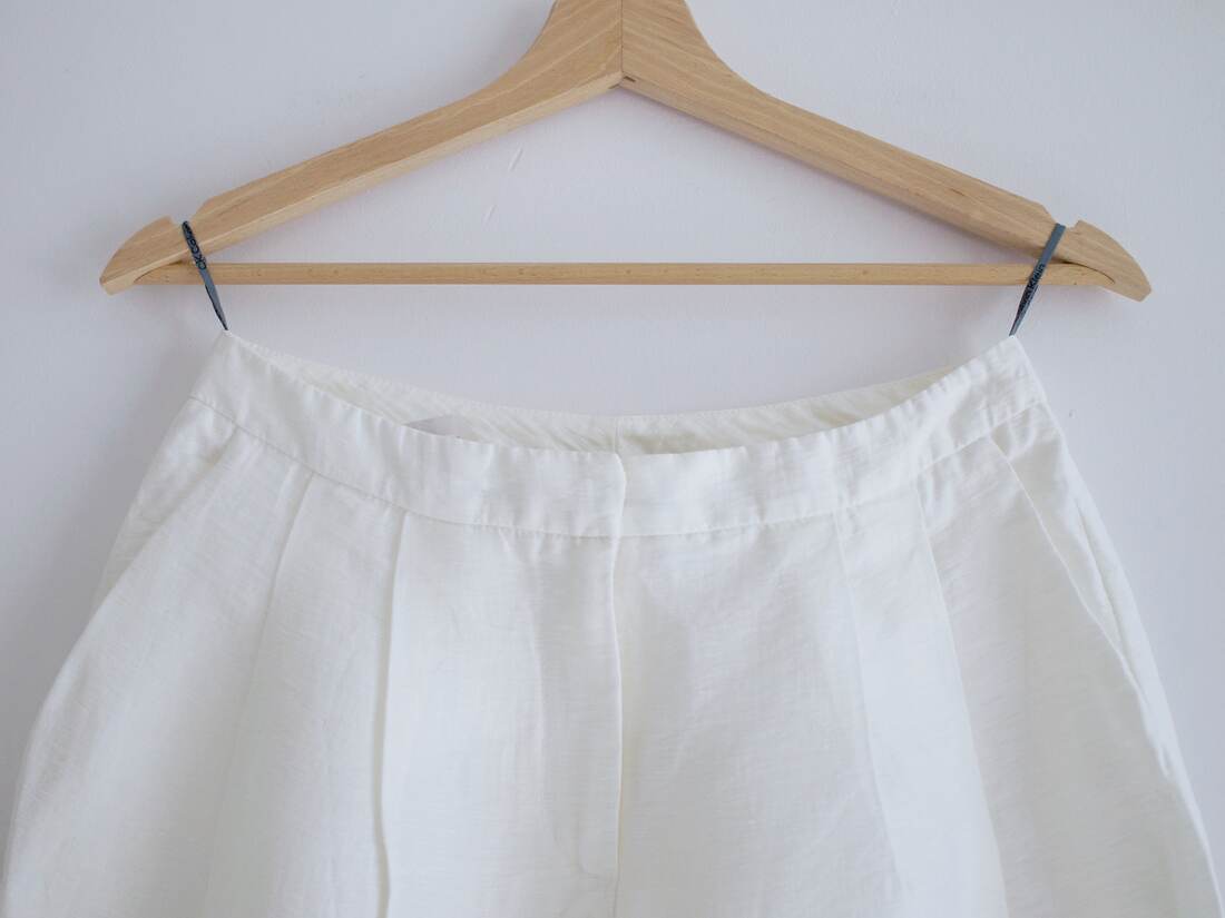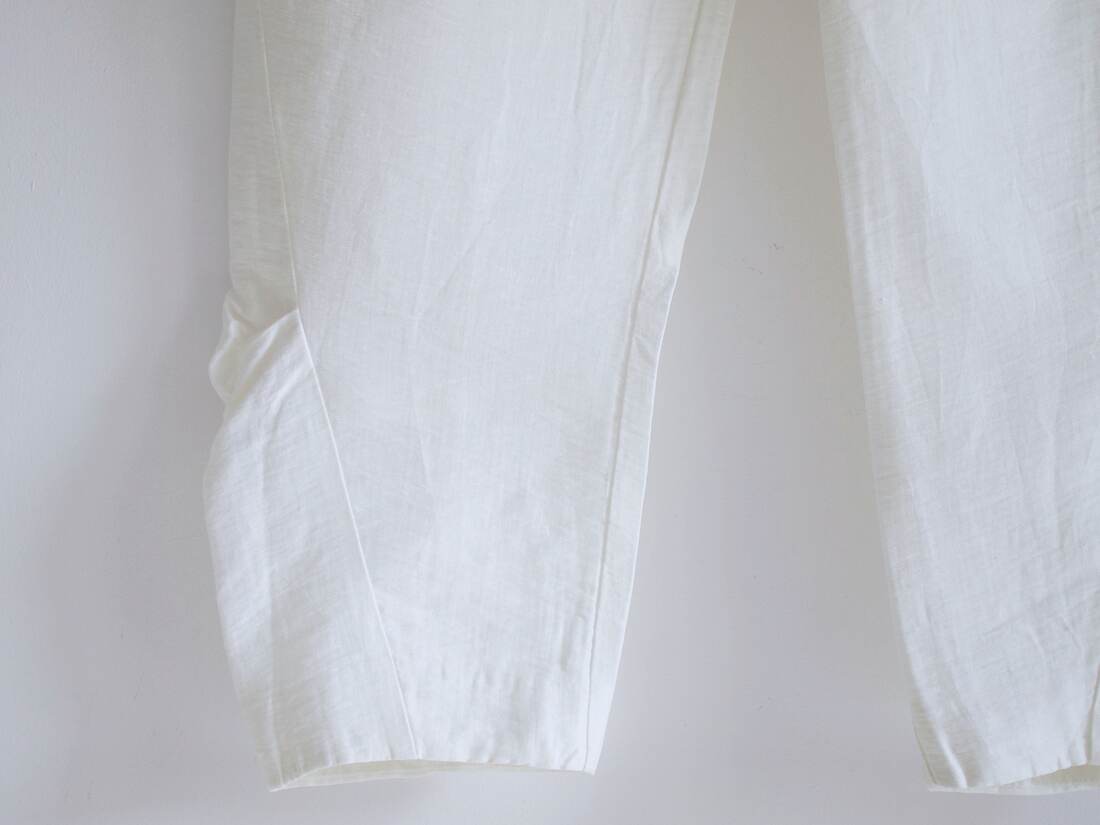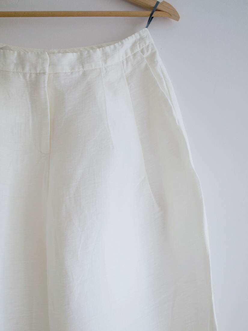 Lniane spodnie renomowanej marki Calvin Klein, model vintage wyprodukowany we Włoszech. Wysoki stan, szeroki nogawki zawężane ku dołowi. Zapinane na ukryty zamek. Rozmiar z metki 40, jednak są dość wąskie w pasie, więc polecam na S-M. Bez wad.