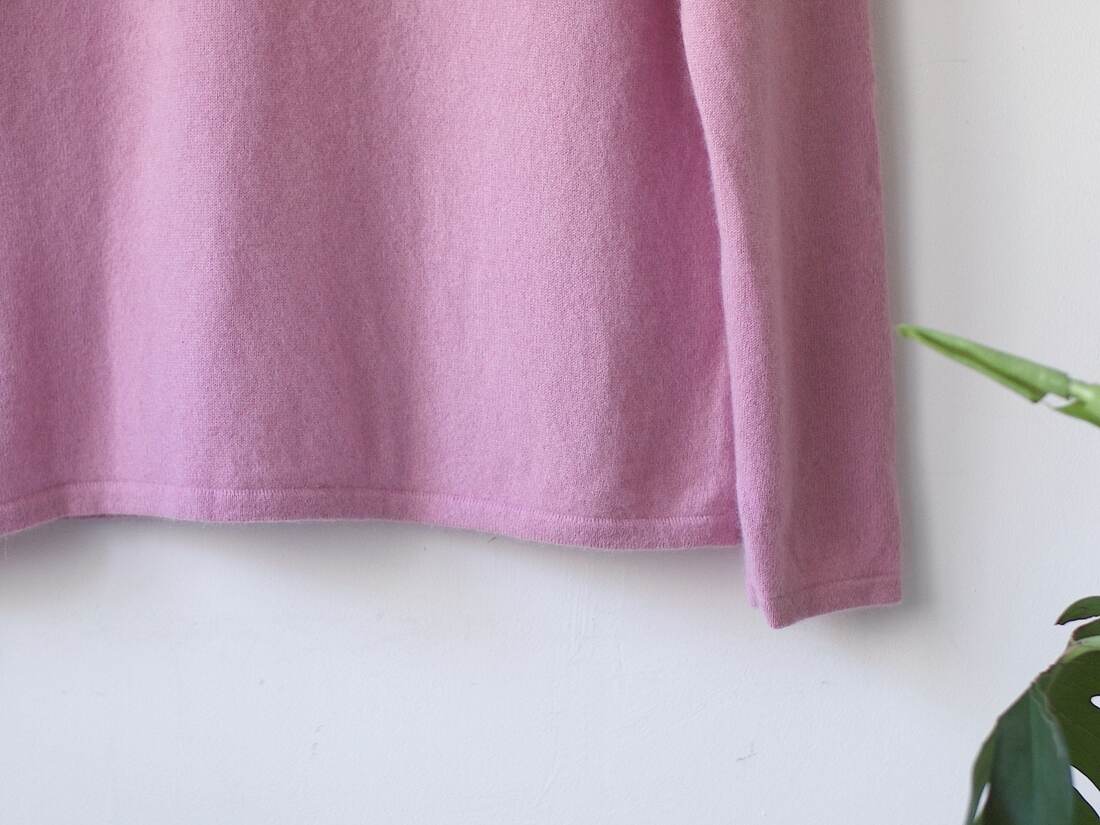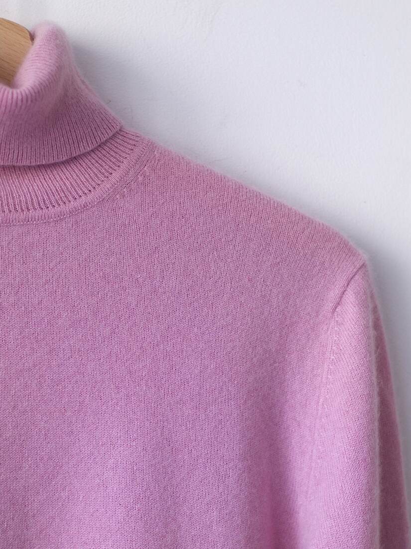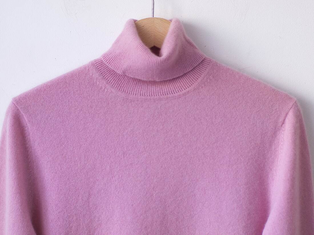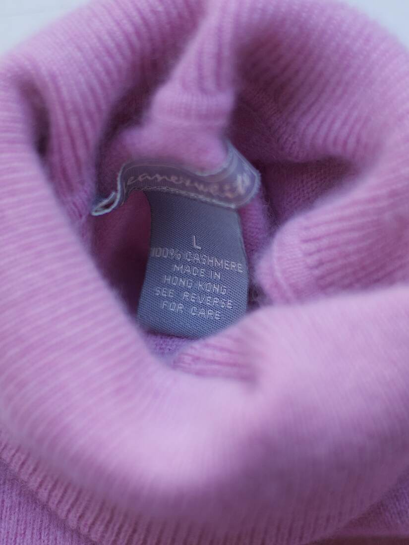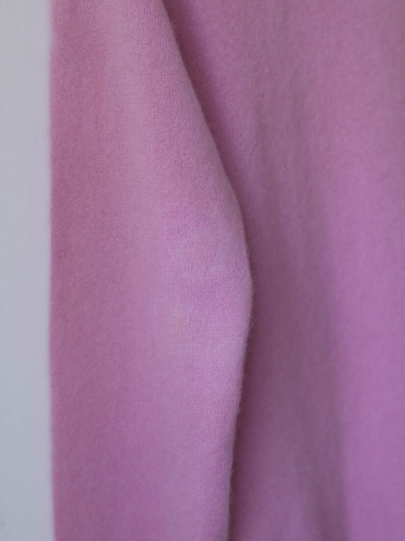 Sweter vintage wykonany z miękkiego kaszmiru w kolorze liliowym. Materiał bardzo miły w dotyku, puszysty i nie sfilcowany. Na jednym rękawie są plamki, mało zauważalne (ostatnie zdjęcie), poza tym brak wad. Rozmiar z metki L, zdecydowanie polecam na mniejsze, wymiary poniżej.