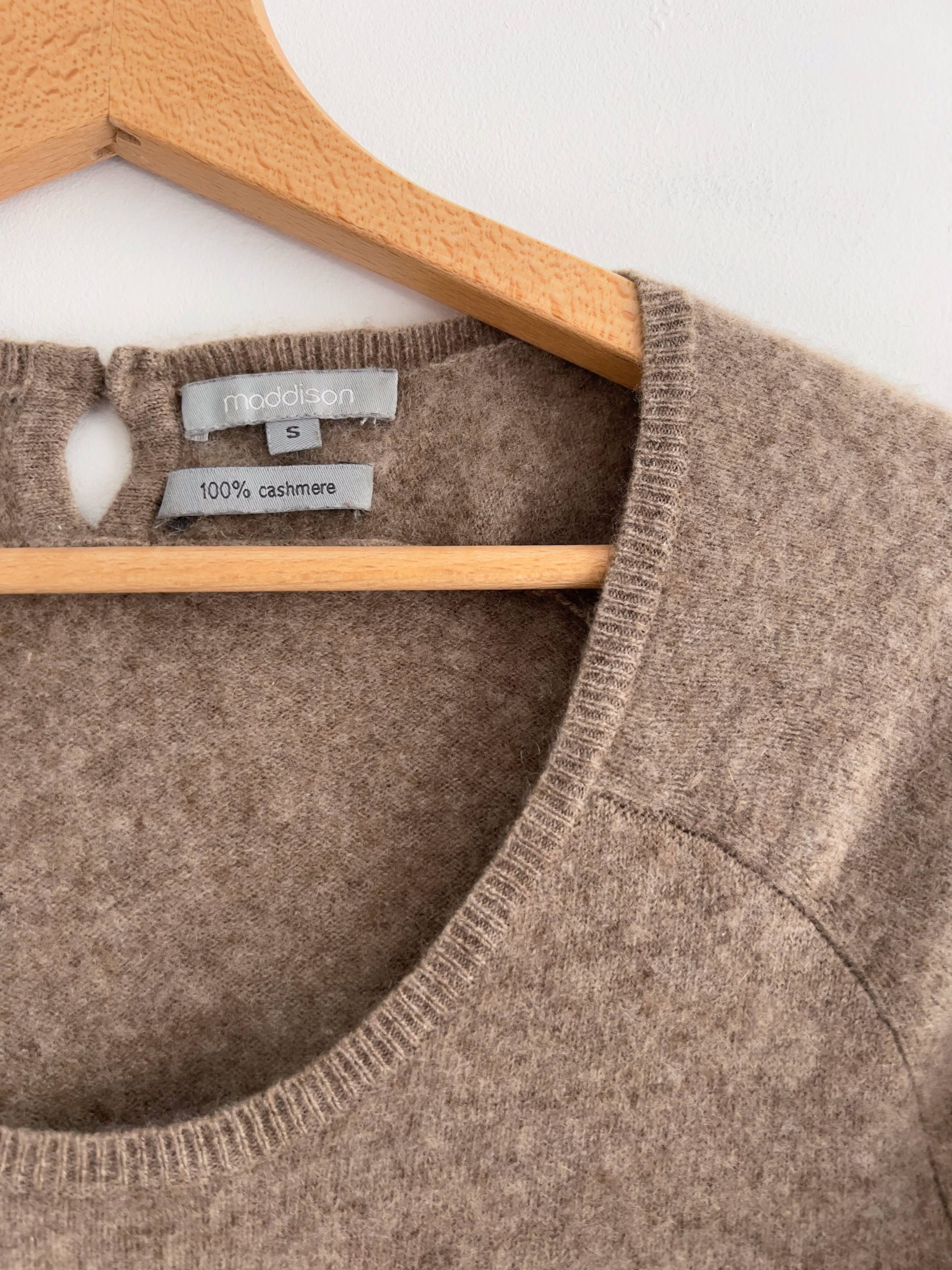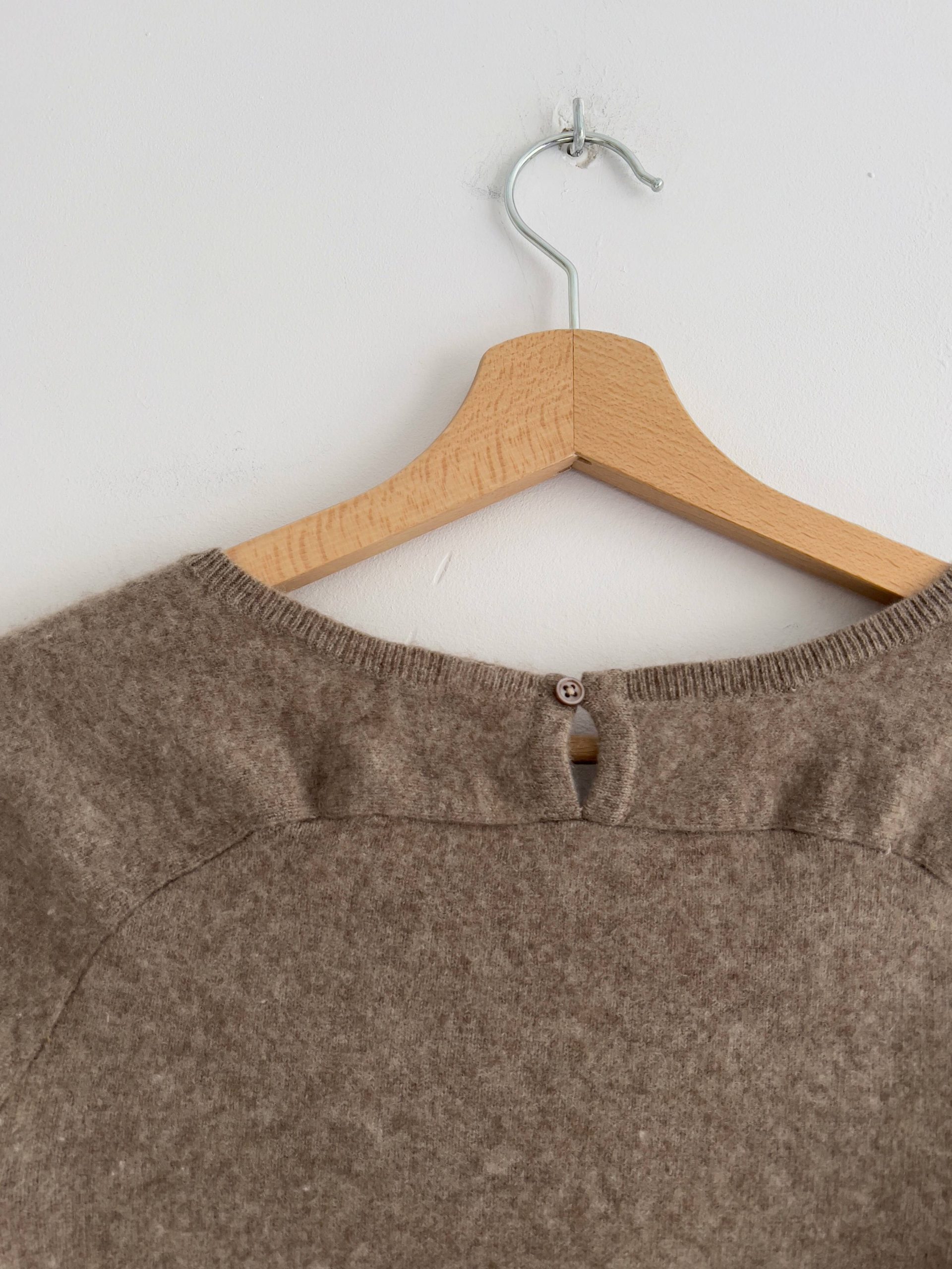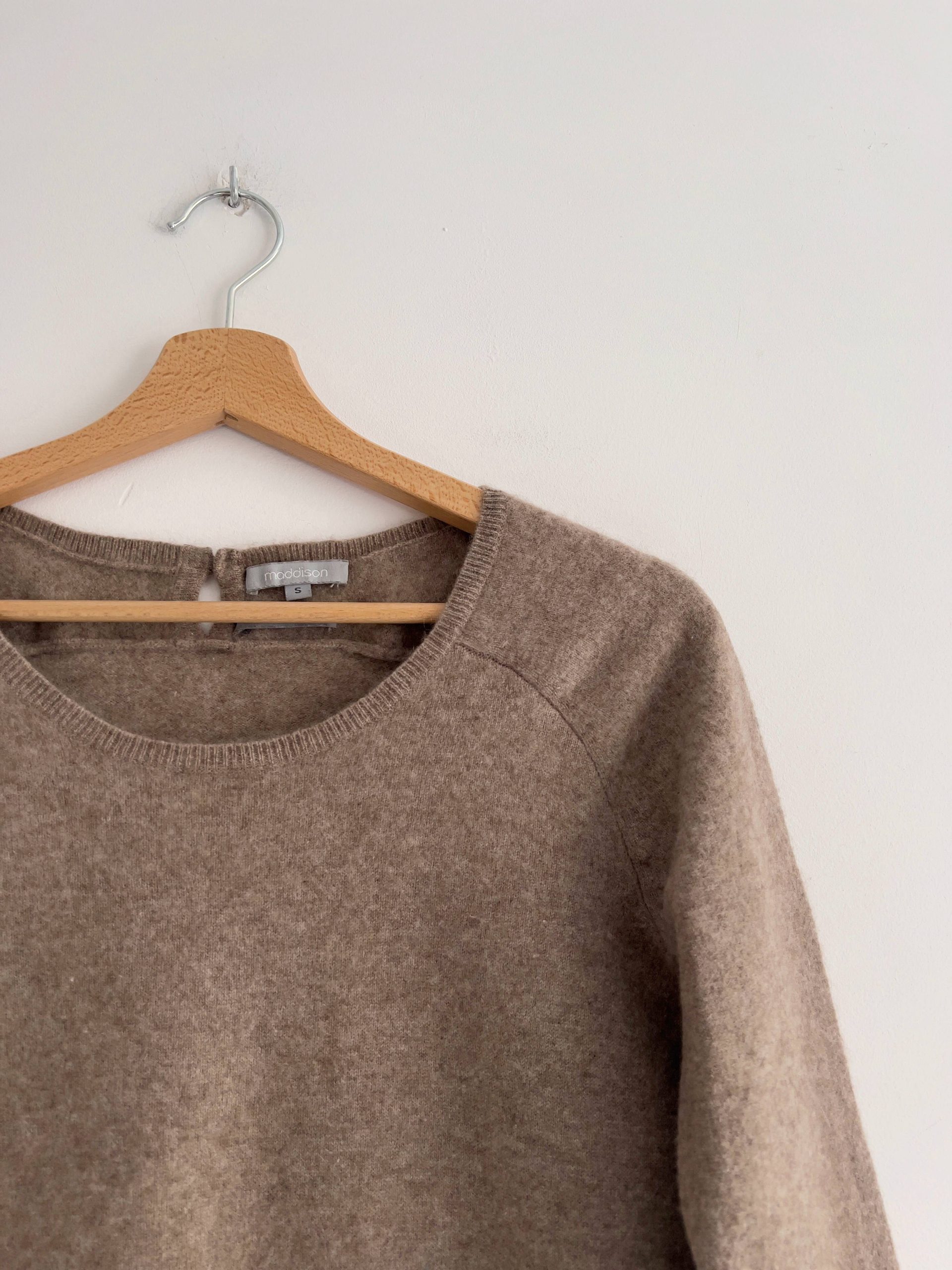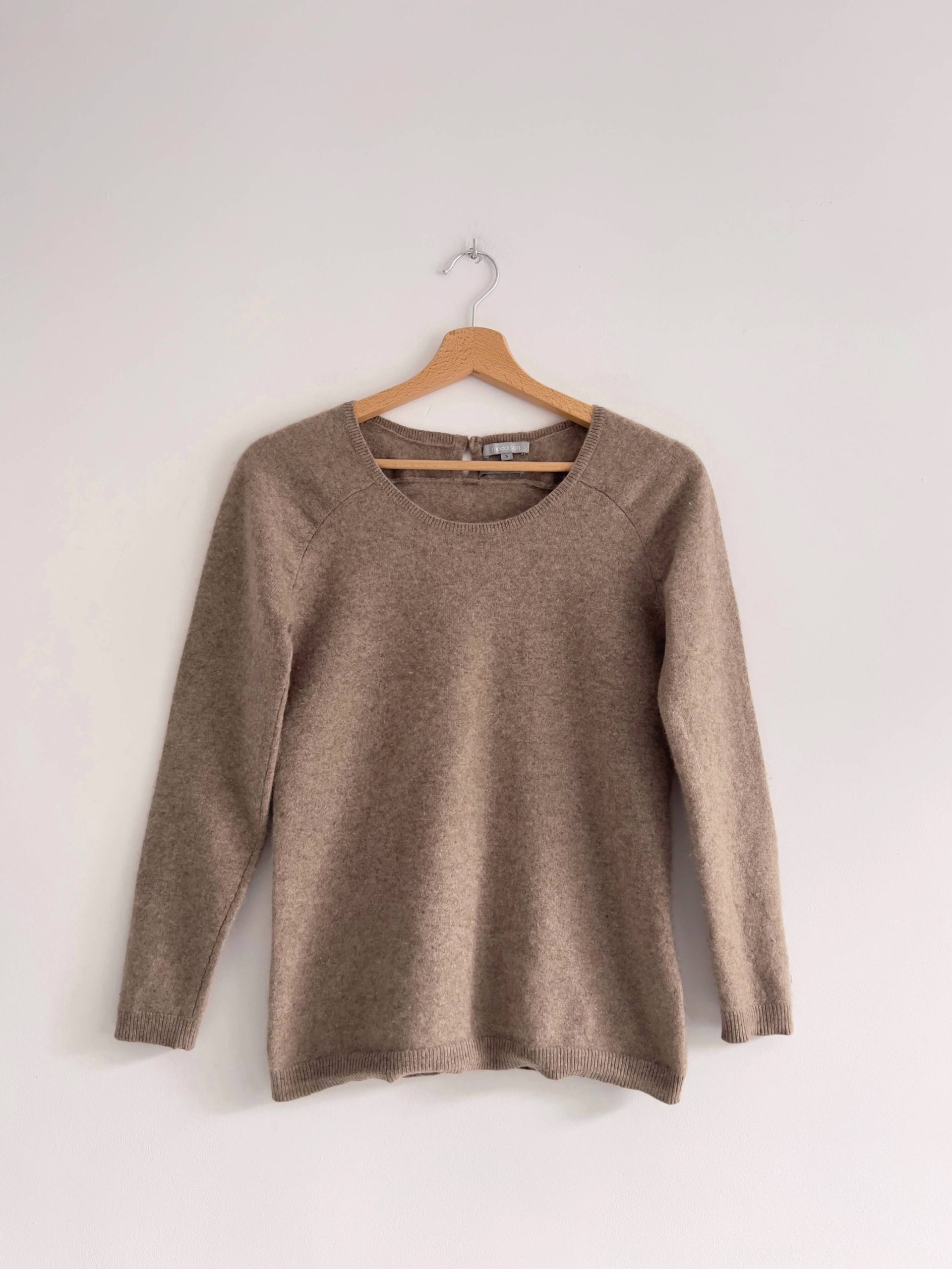 Dopasowany kaszmirowy sweter. Jest delikatnie sfilcowany, nie jest to widoczne i nie przeszkadza w noszeniu, sweter jest miękki i puszysty. Polecam na XS.