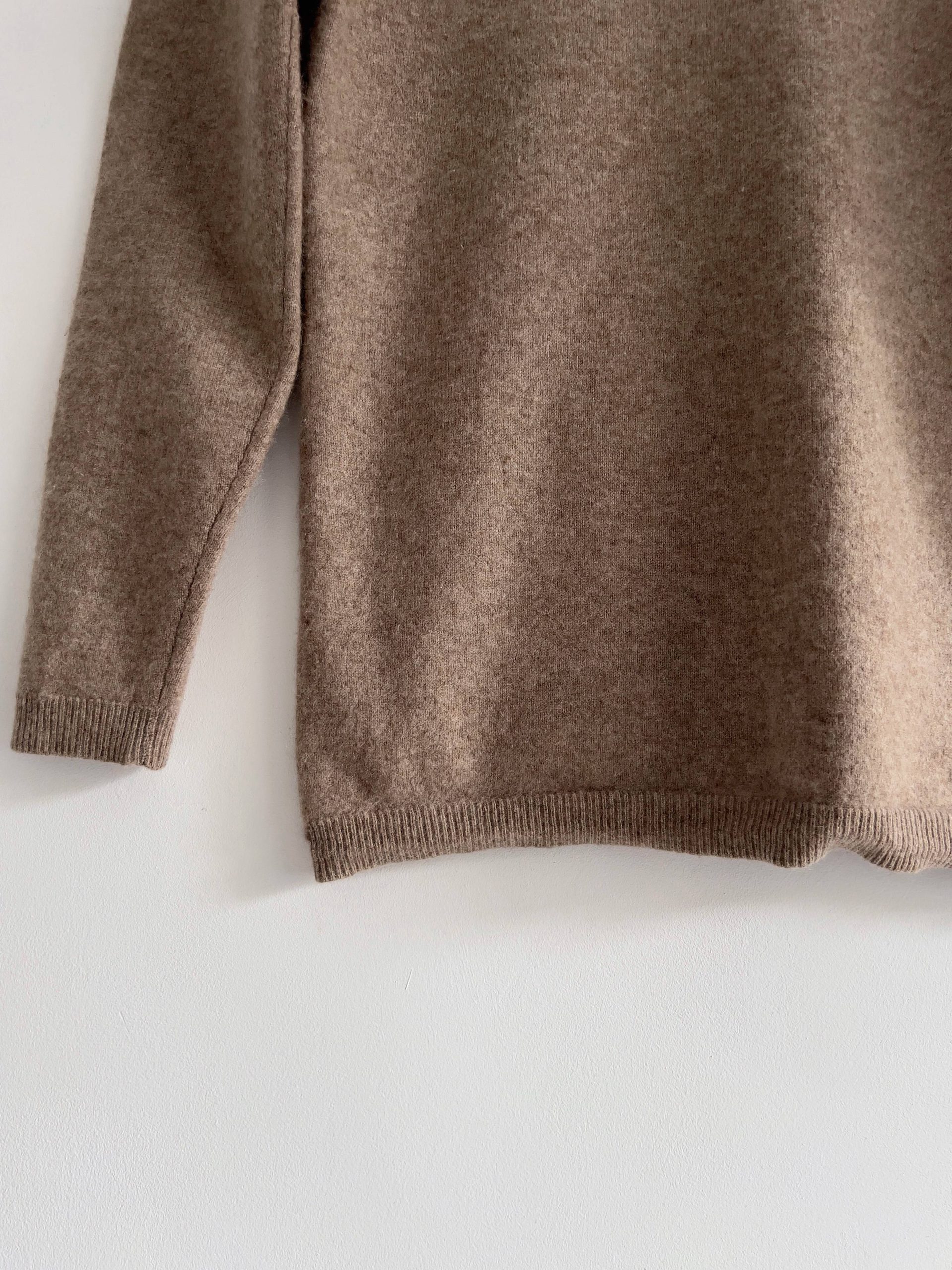 Minimalistyczny kaszmirowy sweter o pudełkowym kroju. Sweter bardzo miękki i przyjemny, ma dwie małe zacerowane dziurki, nie widoczne w noszeniu, poza tym brak mankamentów. Wymiary poniżej.