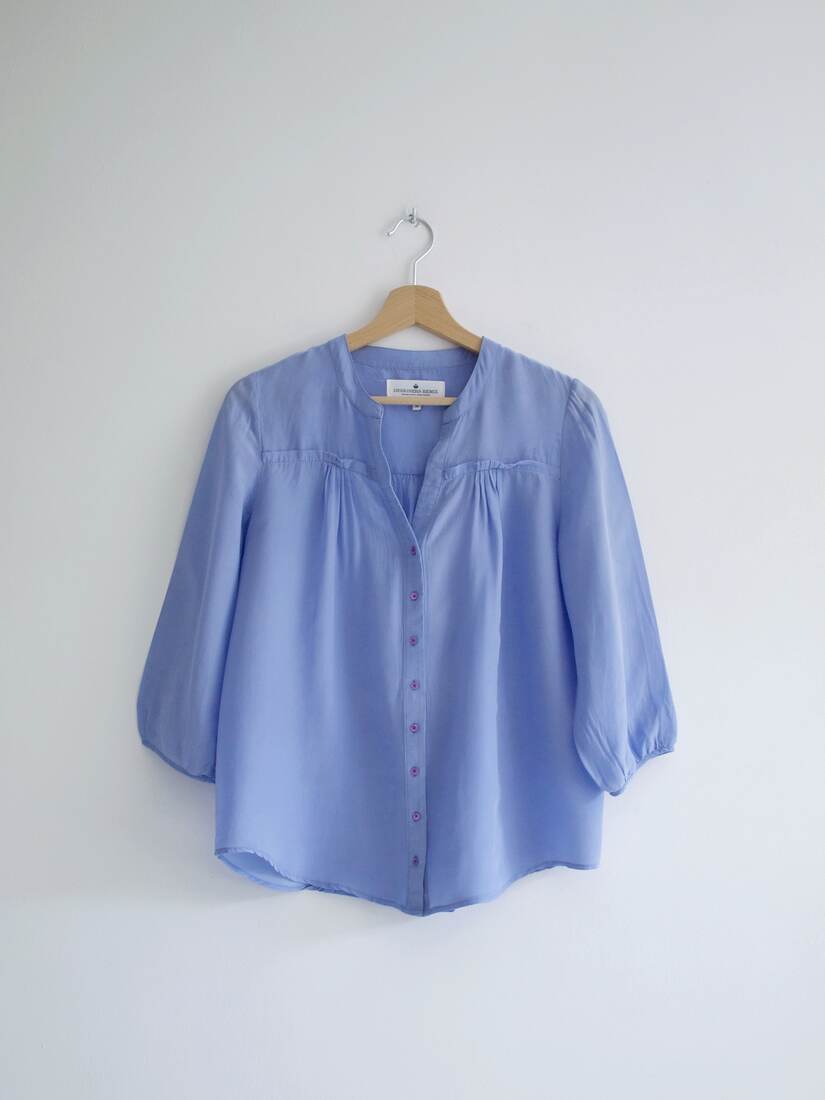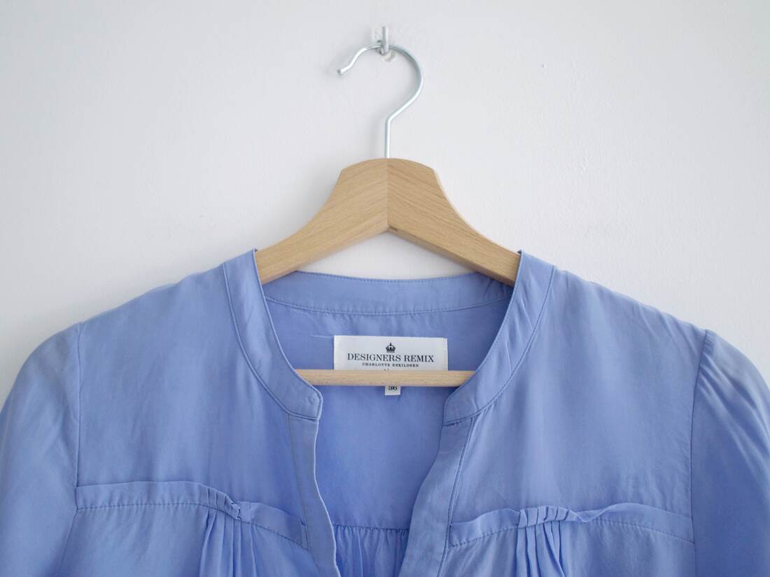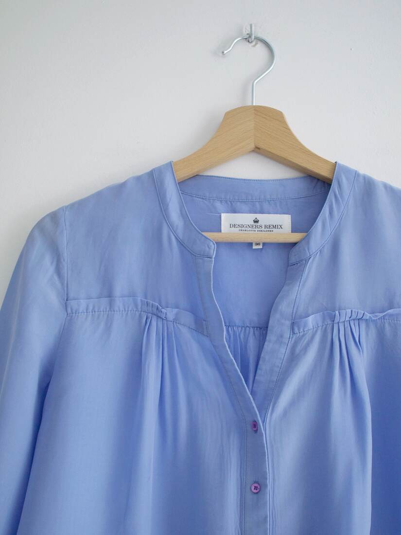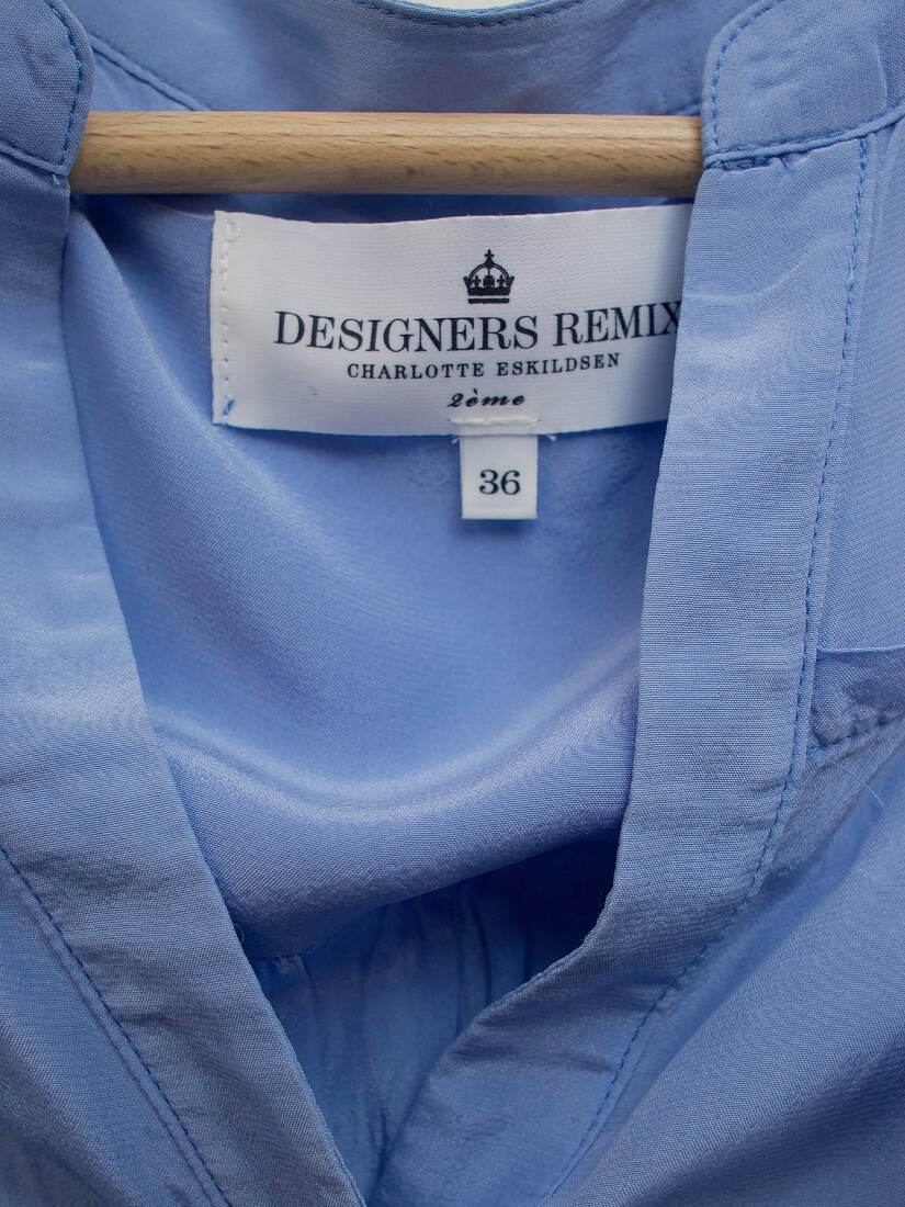 Bluzka duńskiej marki Designers Remix Charlotte Eskildsen. Wykonana z miłej w dotyku mieszanki jedwabiu i wiskozy. Na jednym rękawie ma malutkie plamki, nie widoczne w noszeniu, poza tym bez wad. Rozmiar z metki 36.