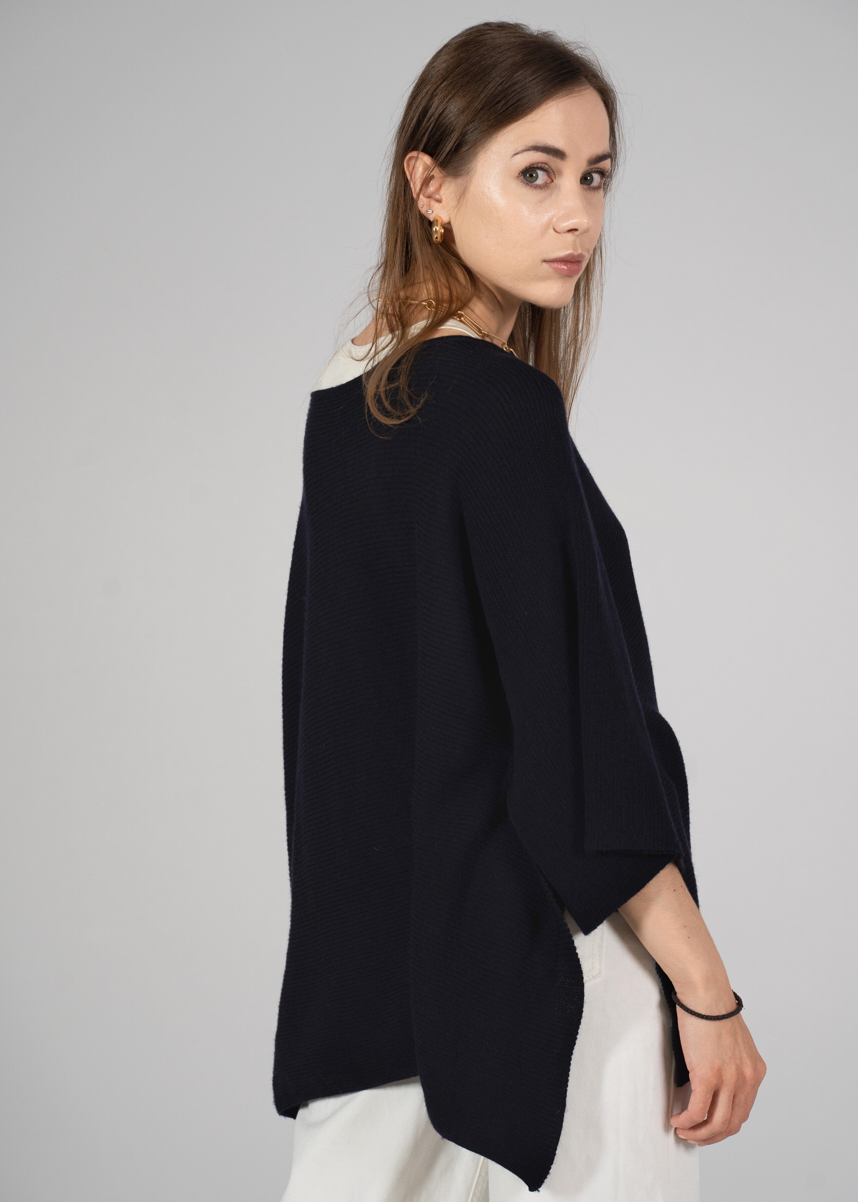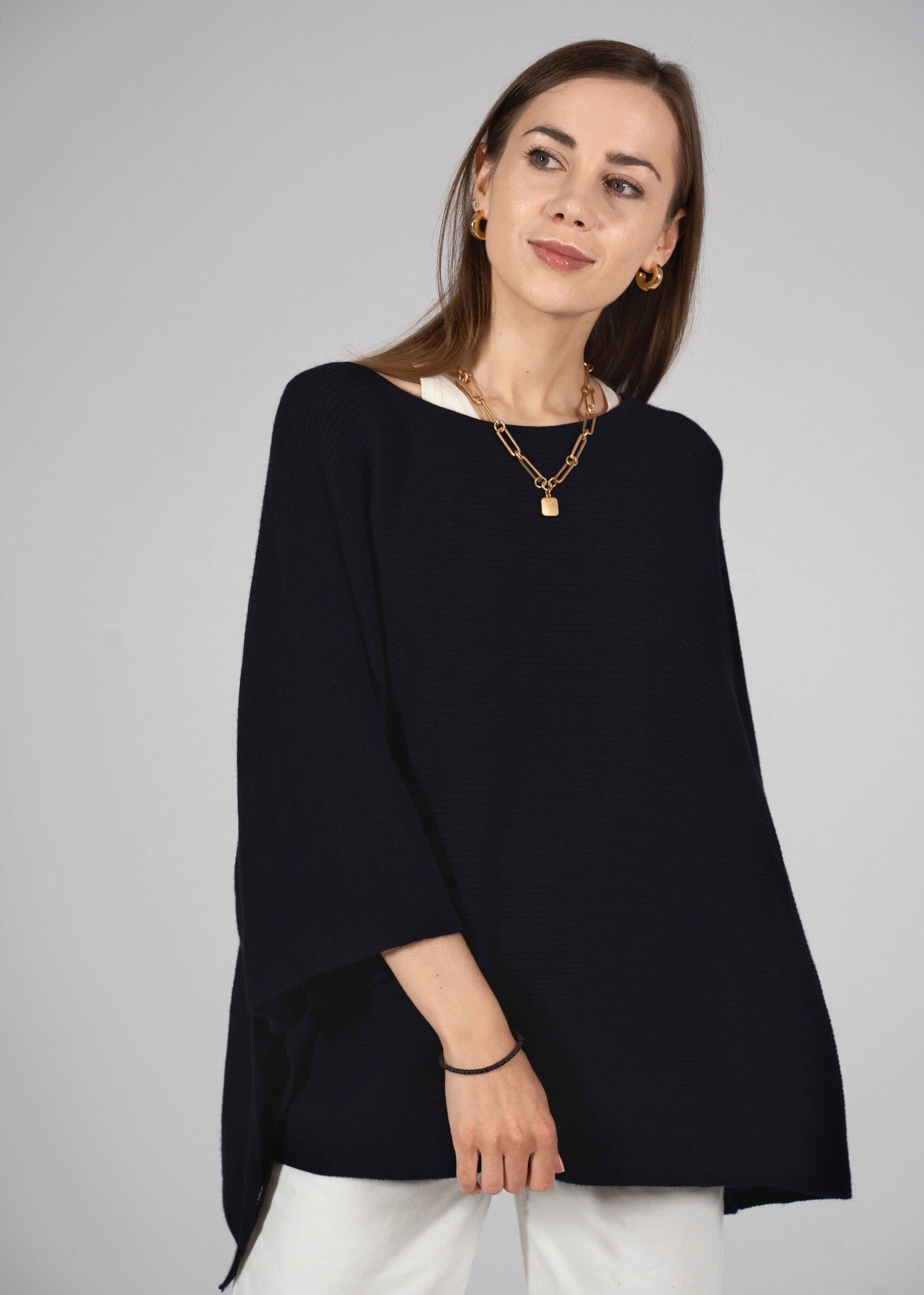 Wełniane ponczo skandynawskiej marki COS w kolorze bardzo ciemnego granatu, prawie czarne. Wykonane z grubej wełnianej dzianiny w prążek. Rozmiar z metki L, ze względu na fason polecam jako one size. Bez wad.
