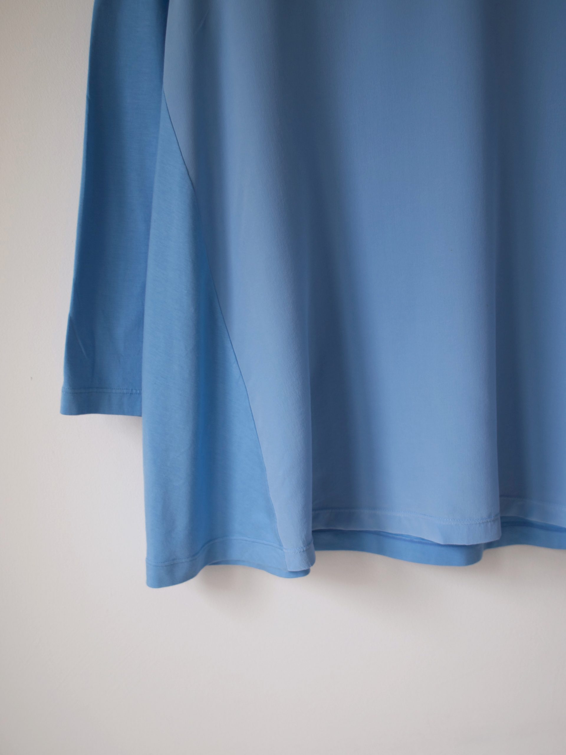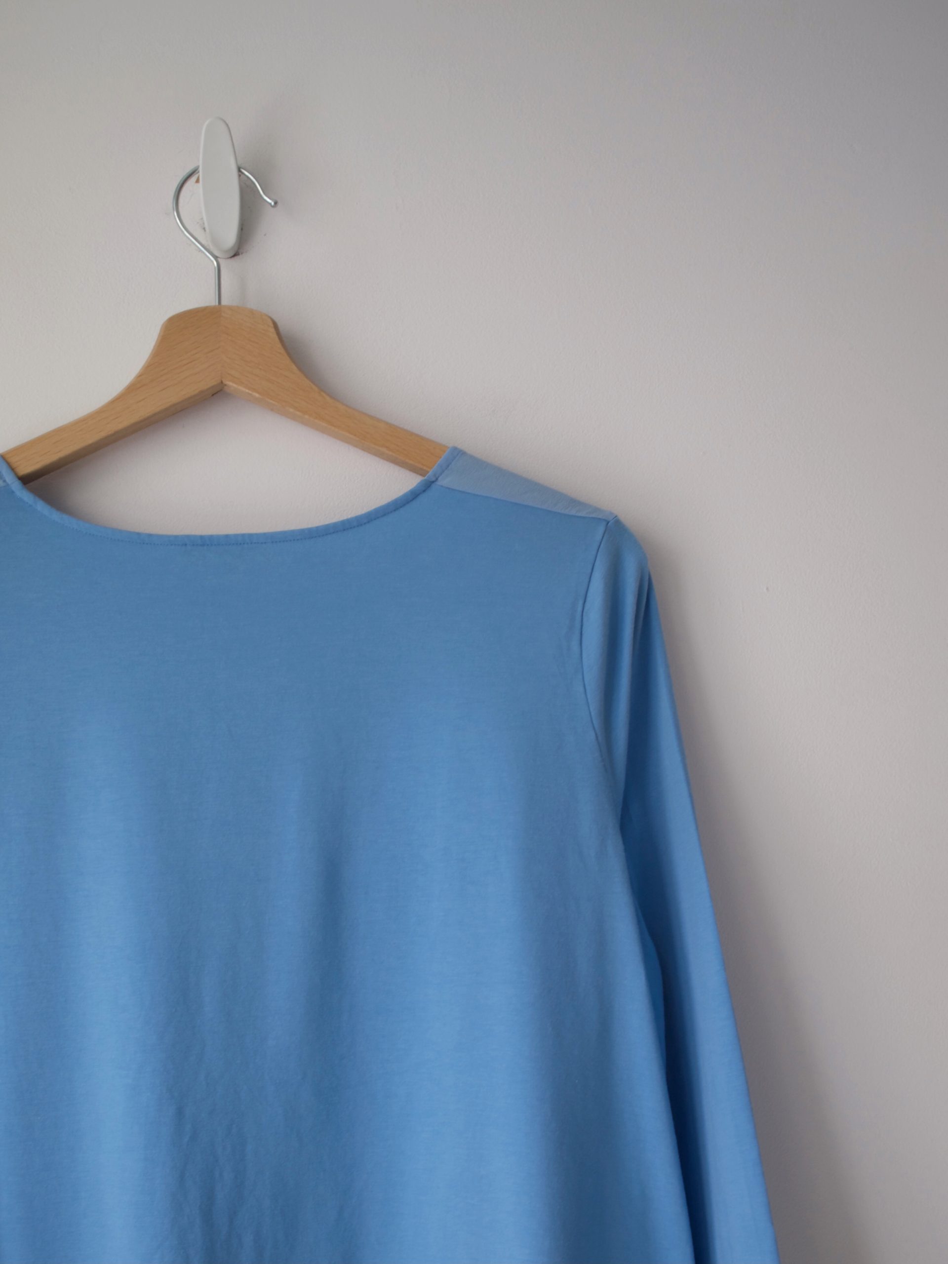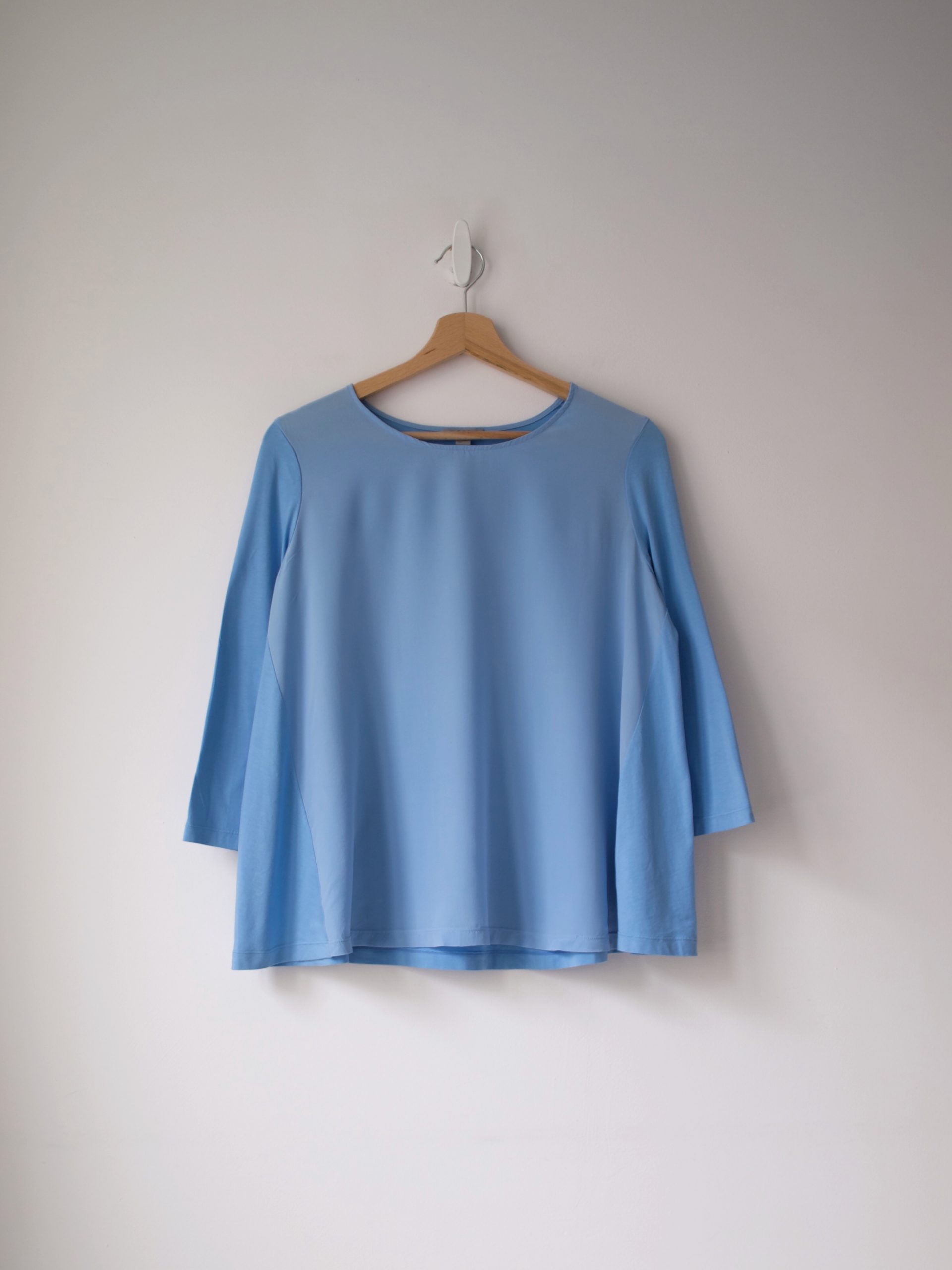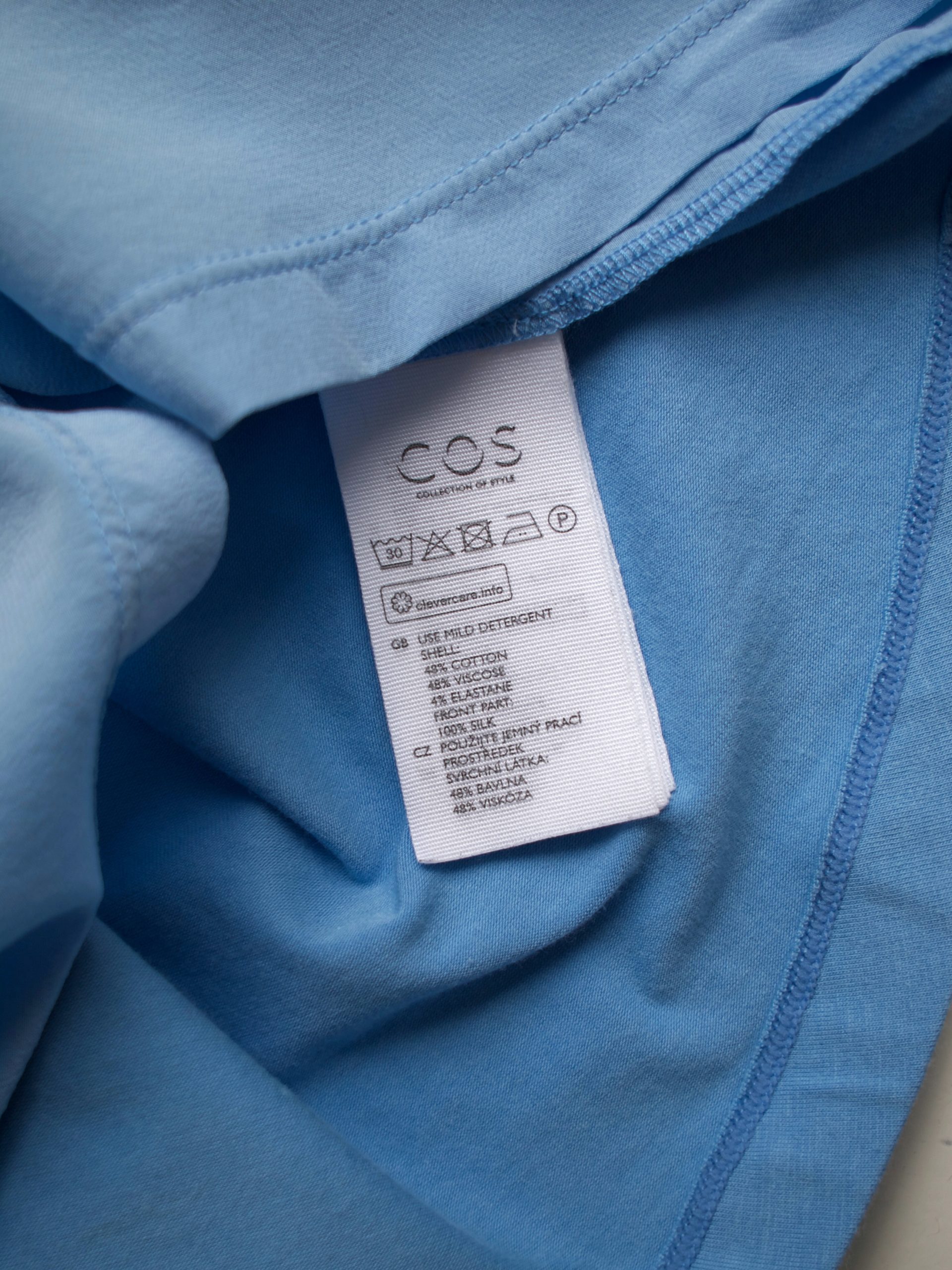 Bluzka marki COS, wykonana z łączonych materiałów. Przód jest 100% jedwabny, tył oraz rękawy są wykonane z mieszanki wiskozy oraz bawełny. Poszerzany dół.