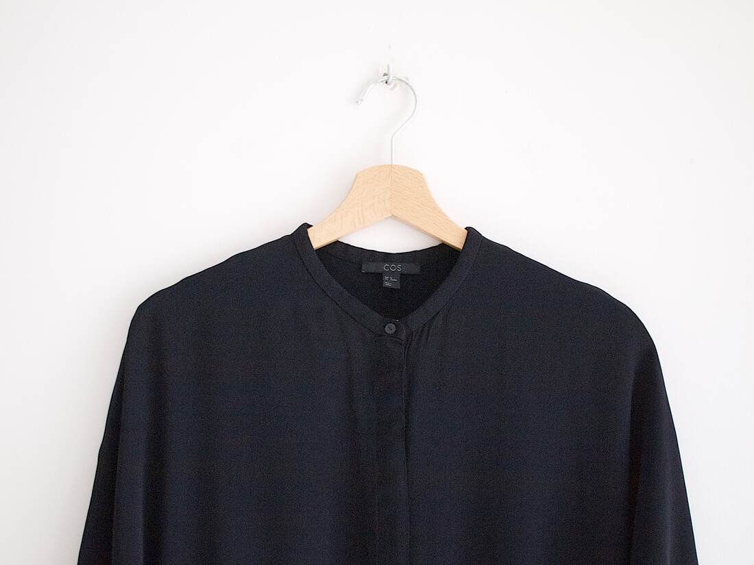 Prosta sukienka marki COS, wykonana z wiskozy. Zapinana do połowy na guziki. Kolor to bardzo ciemny granat, prawie czarna. Rozmiar z metki 36, bez wad.