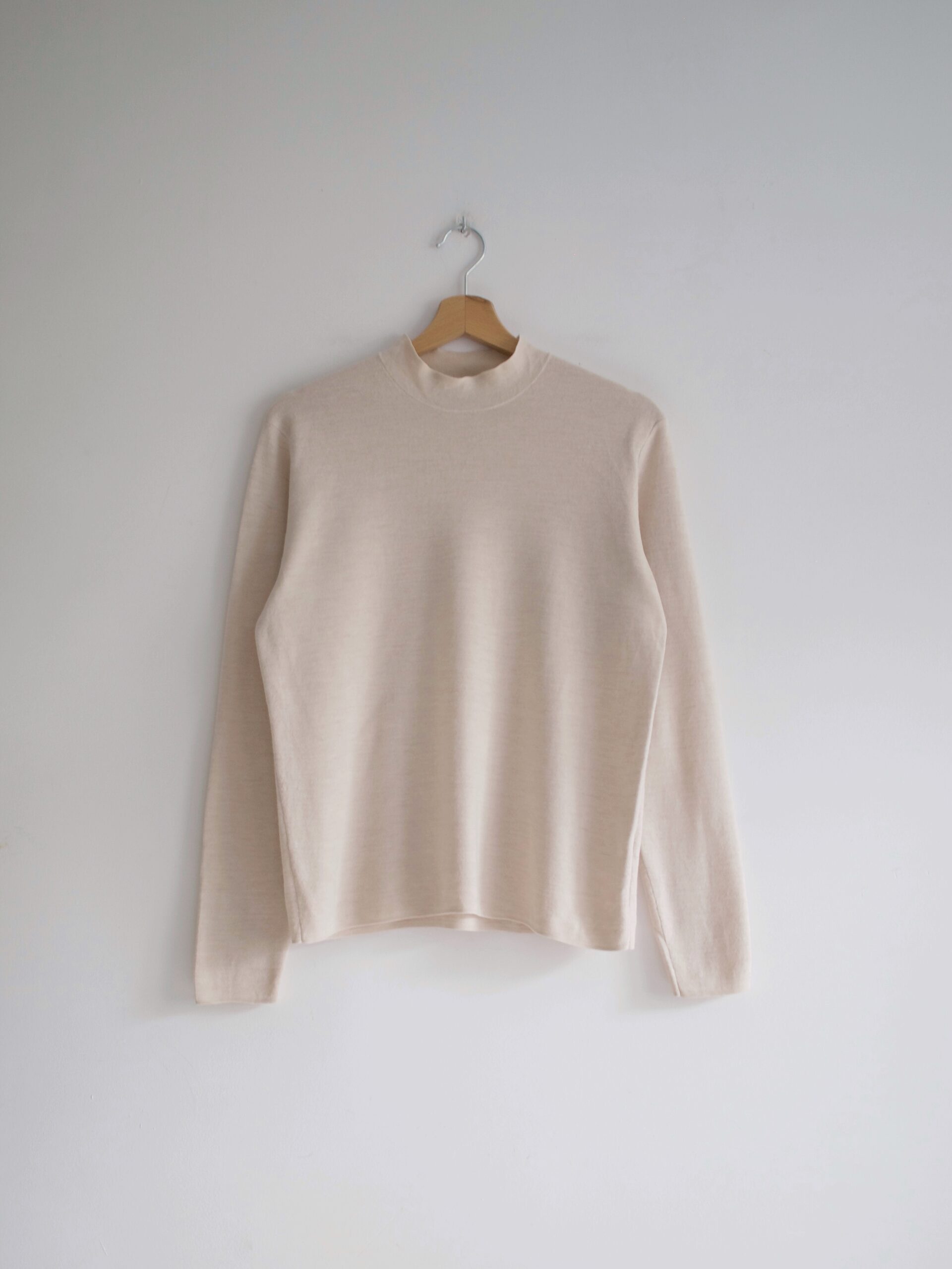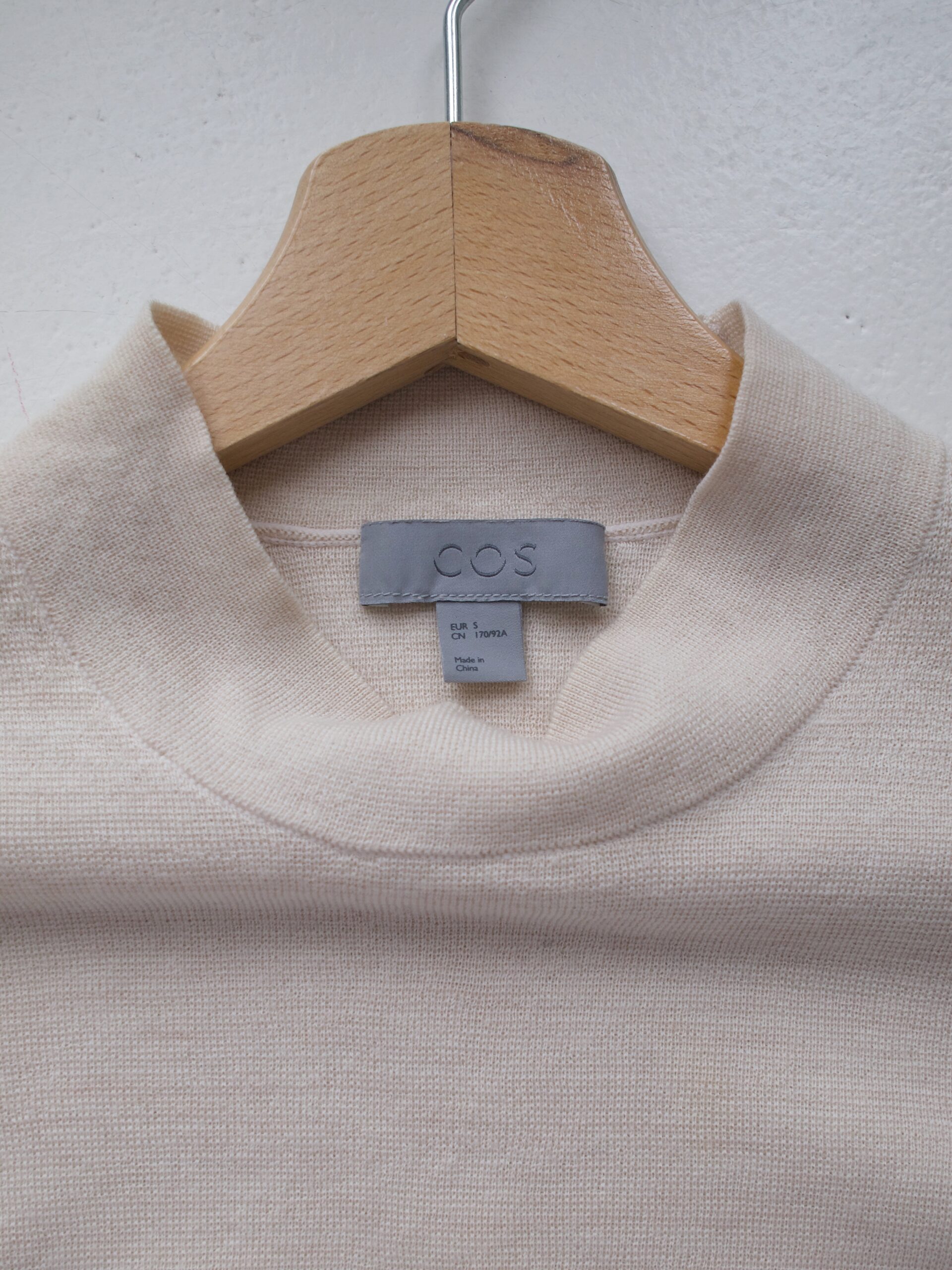 Minimalistyczny wełniany sweter z golfem. Idealny stan, materiał nie gryzie. Brak metki z rozmiarem, na oko jest to L, na mniejsze rozmiary idealny jako oversize (proszę sprawdzać wymiary).