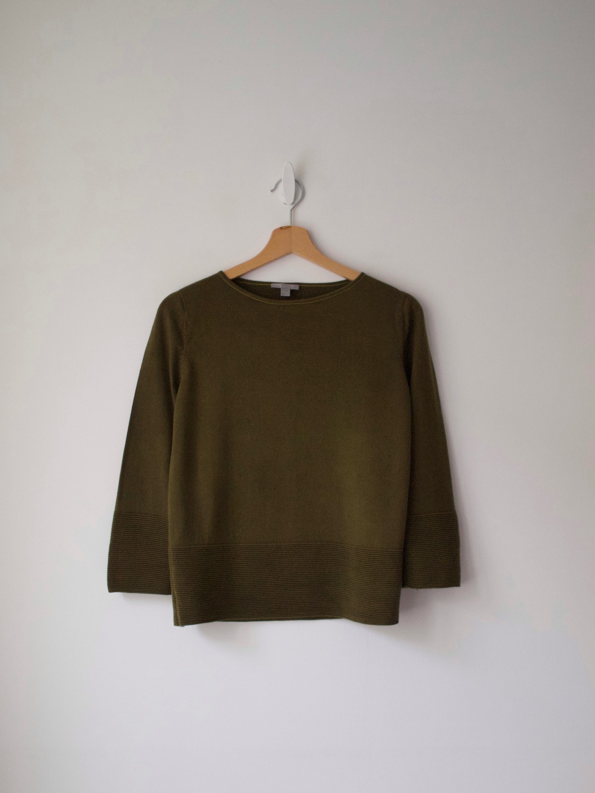 Sweter marki COS z rękawami 3/4. Wykonany z gładkiej niegryzącej wełny. Rozmiar z metki: S Skład: brak metki, 100% wełna Stan: bardzo dobry Szerokość w klatce 44 cm Długośćcałkowita 54 cm