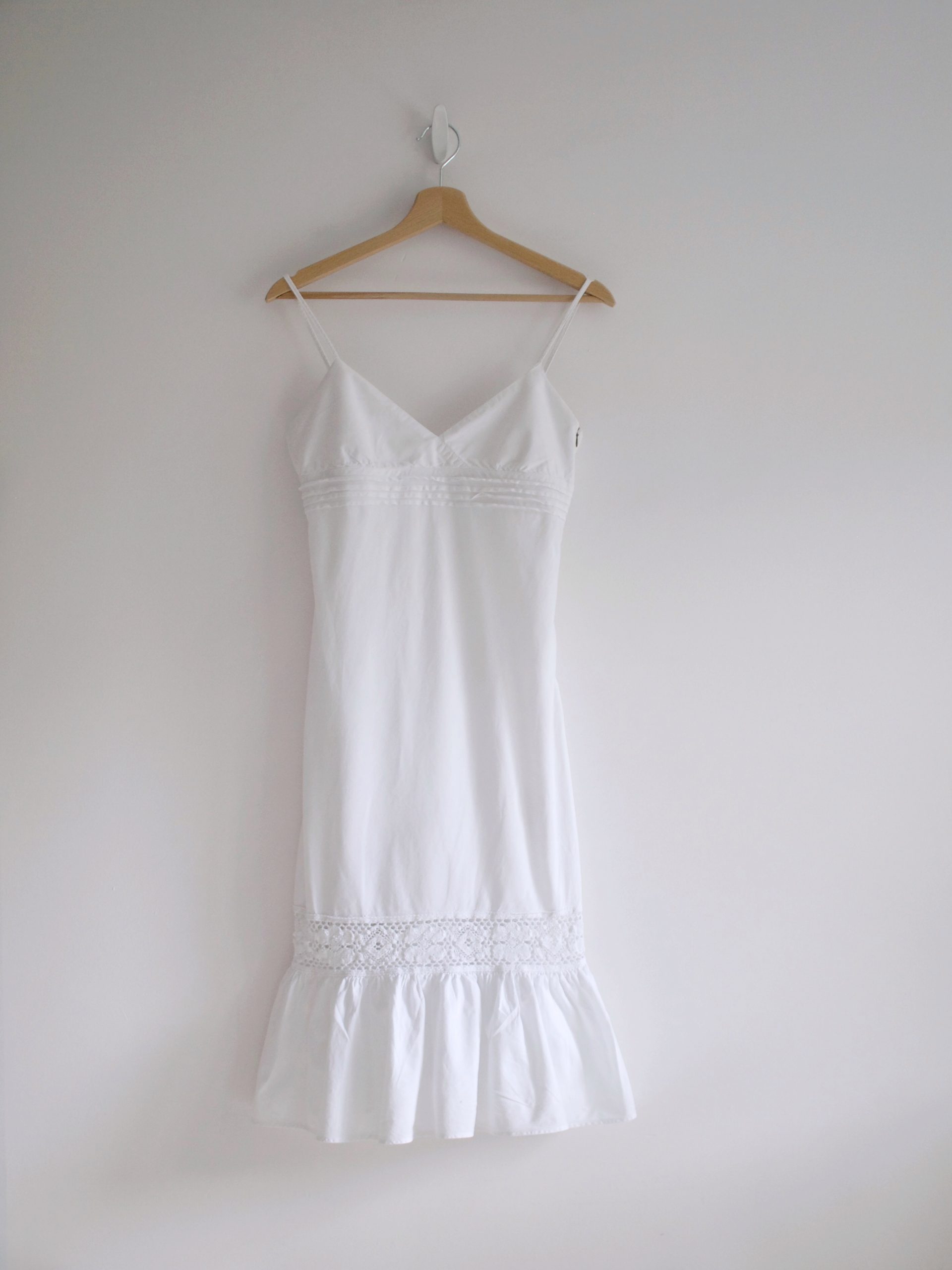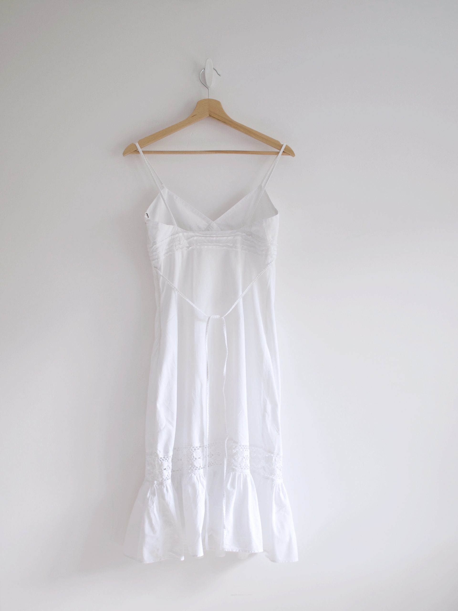 Sukienka w rustykalnym stylu, zdobiona haftowaną wstawką. Z boku zapinana na ukryty zamek. Rozmiar z metki: S Skład: 100% bawełna Stan: bez wad Szerokość w klatce 37 cm Długośćcałkowita 102 cm
