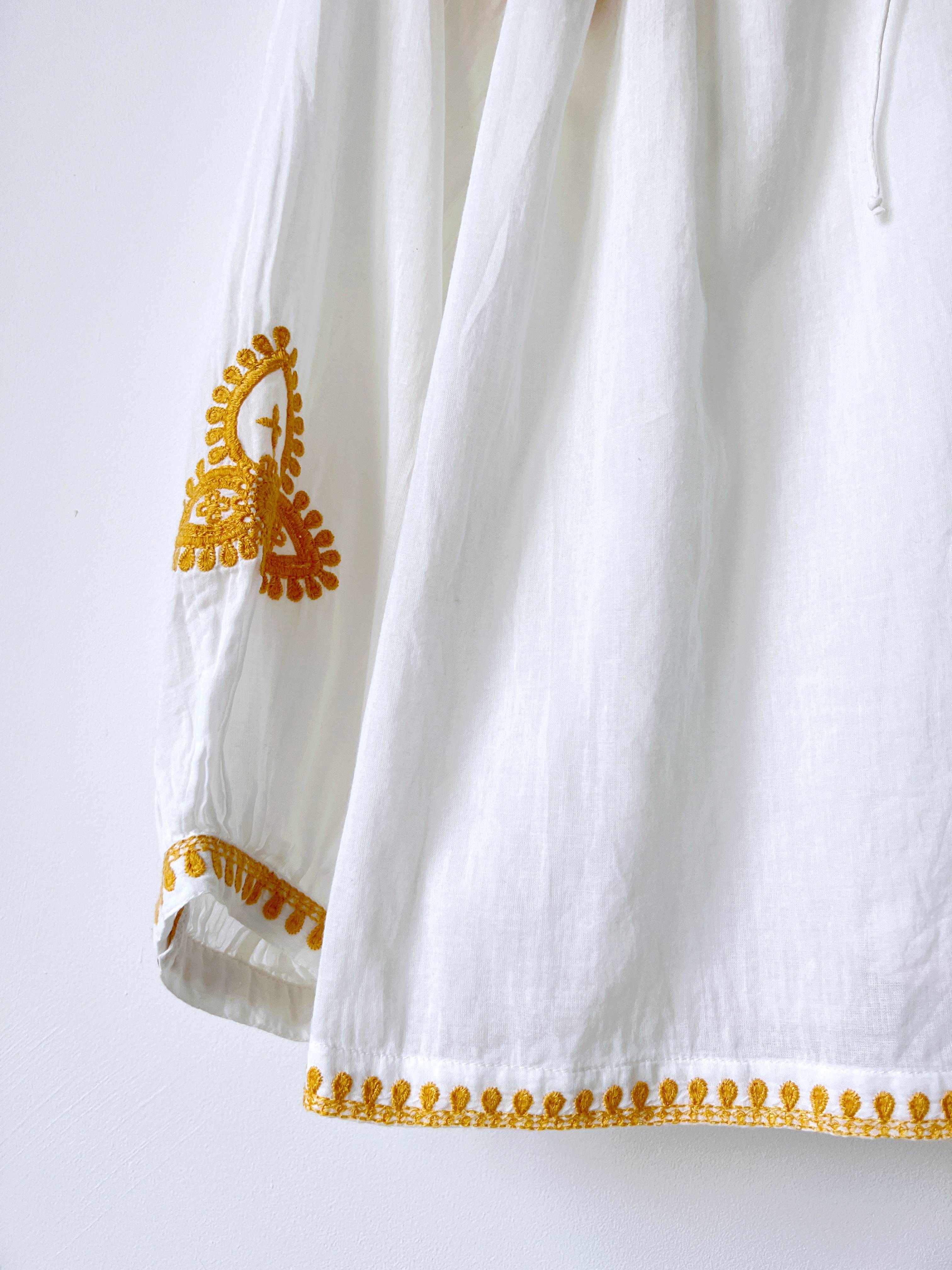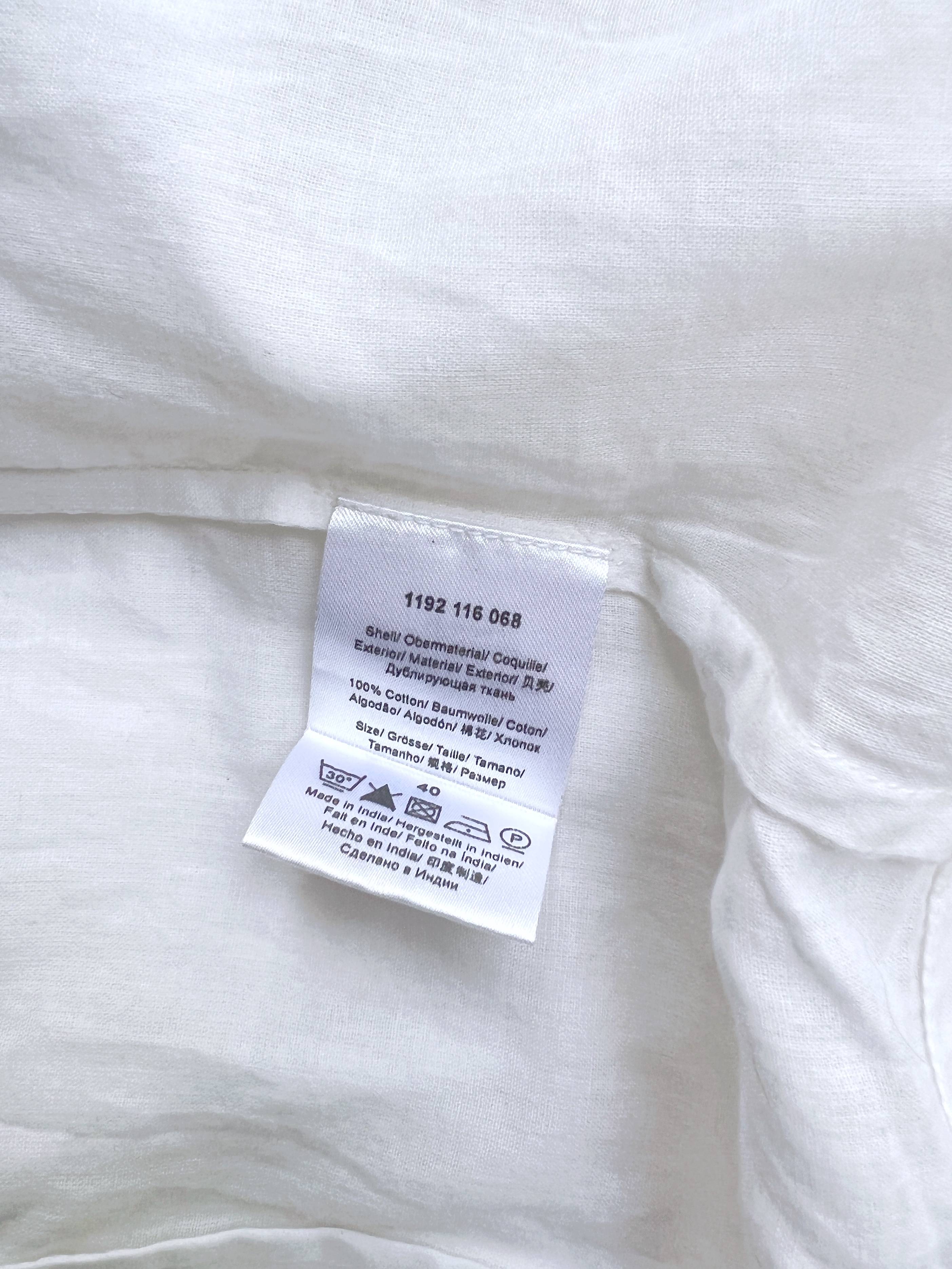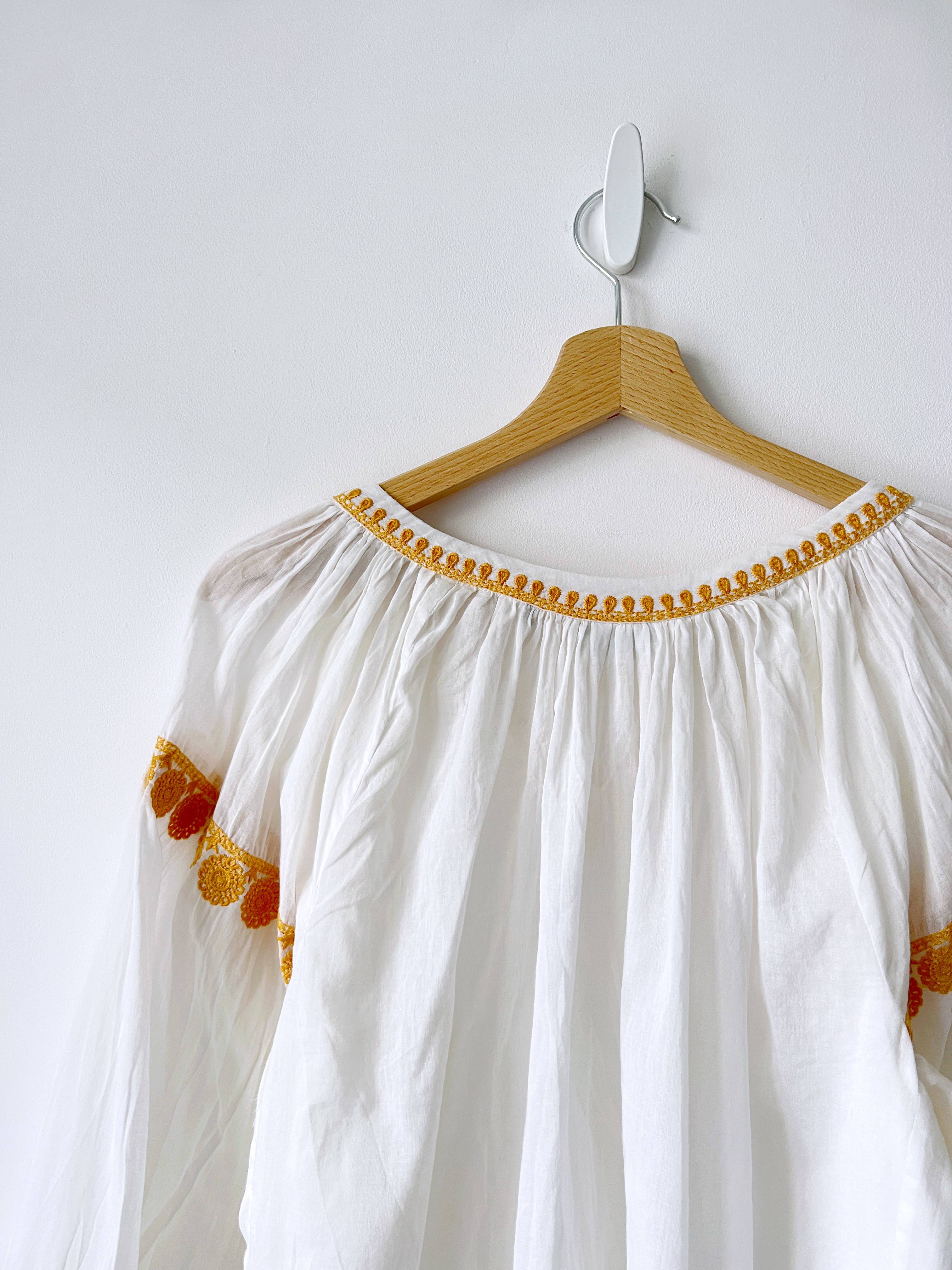 Kremowa koszula vintage z ozdobnymi guzikami i plisami na rękawach. Brak metki ze składem (prawdopodobnie poliester), materiał prawie nie gniecie się. Brak metki z rozmiarem, proszę sprawdzać wymiary. Bez wad.