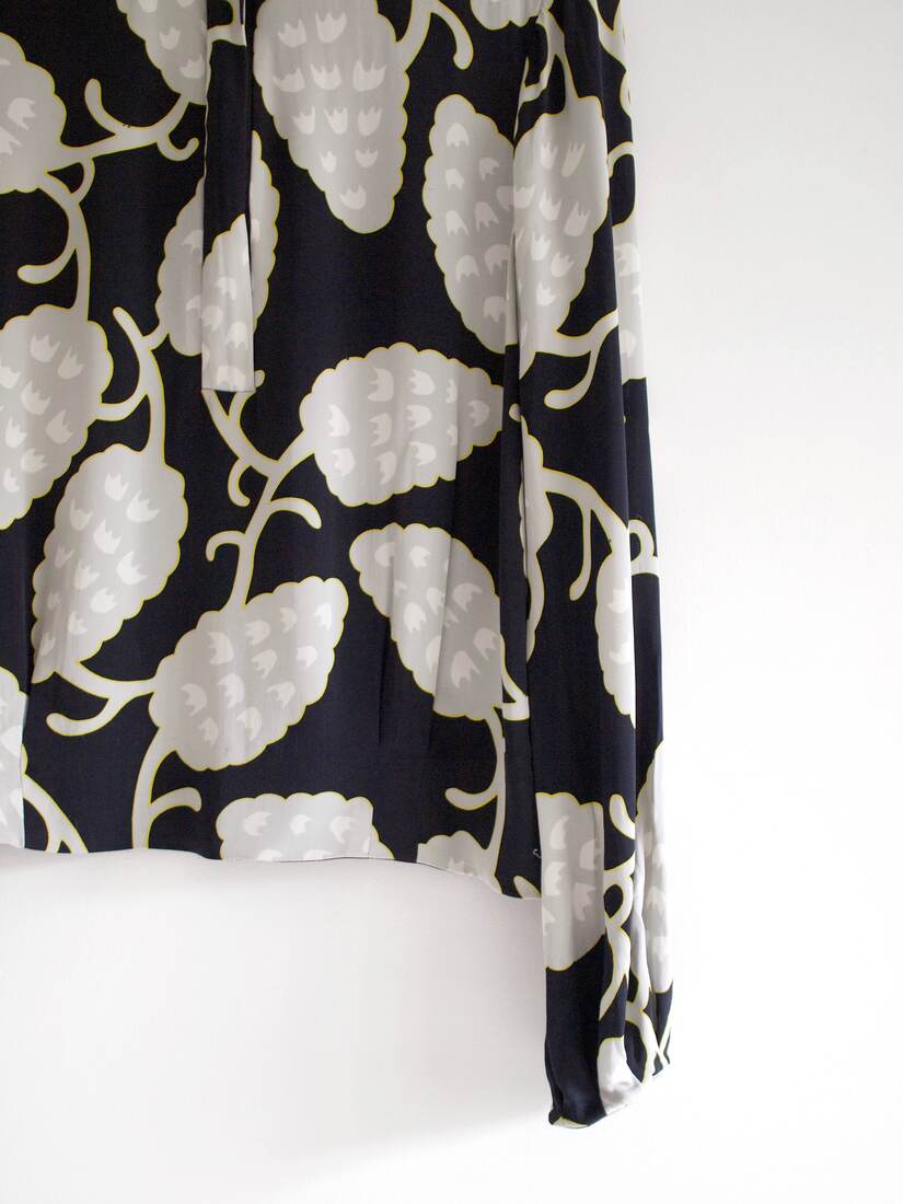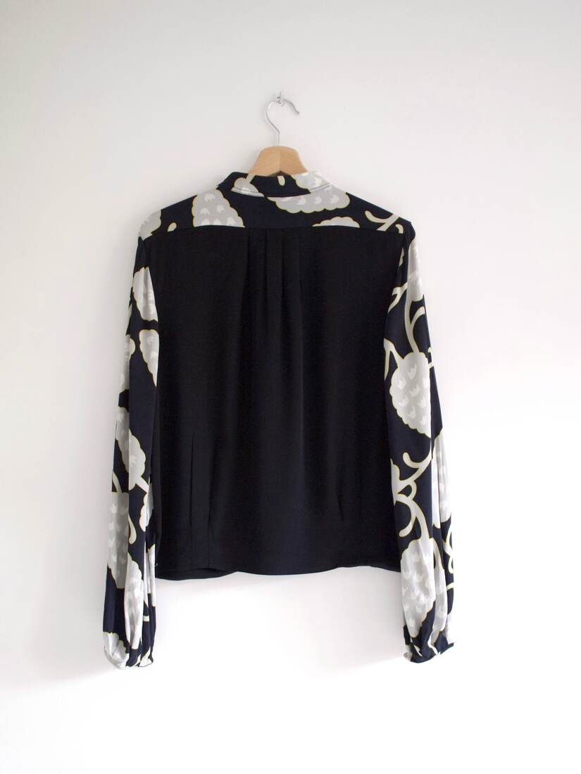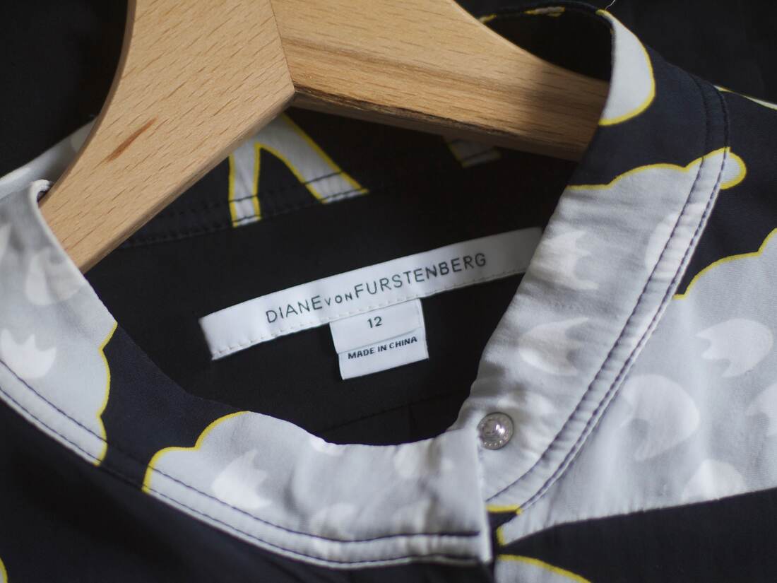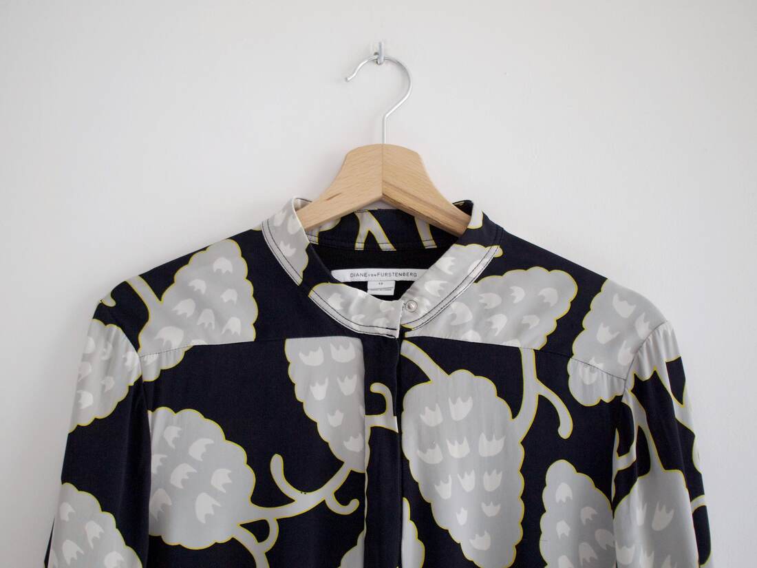 Jedwabna bluzka projektantki Diane Von Furstenberg, cena katalogowa ok. 400$. Rozmiar z metki 12, polecam na M-L. Bluzka w niektórych miejscach ma zaciągnięte nitki, są pokazane na zdjęciach. Są mało widoczne. Poza tym bardzo dobry stan.