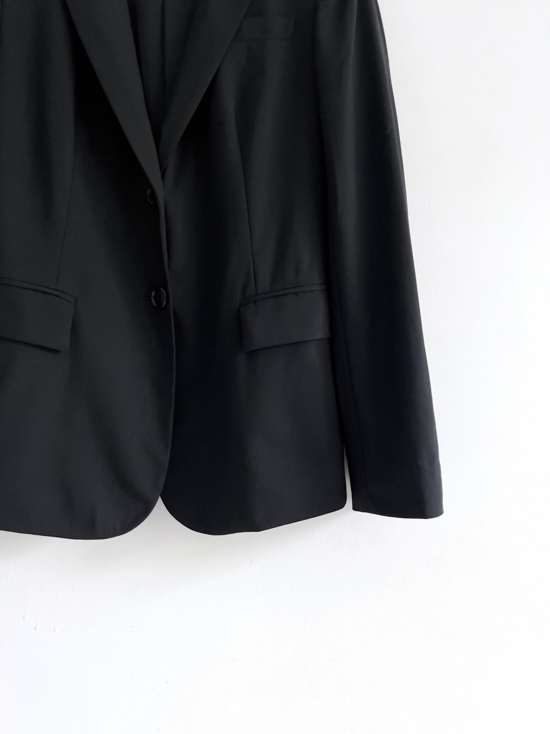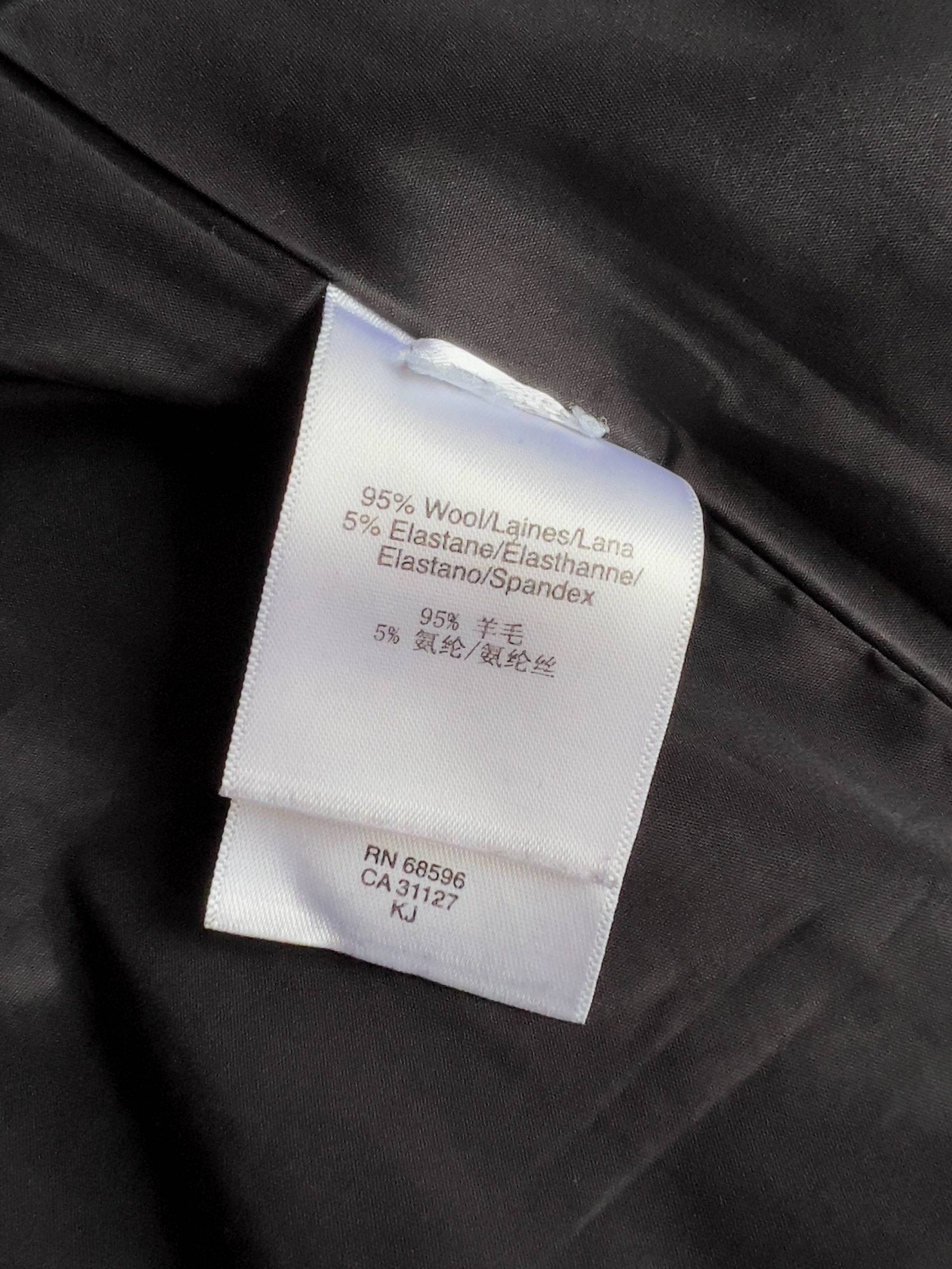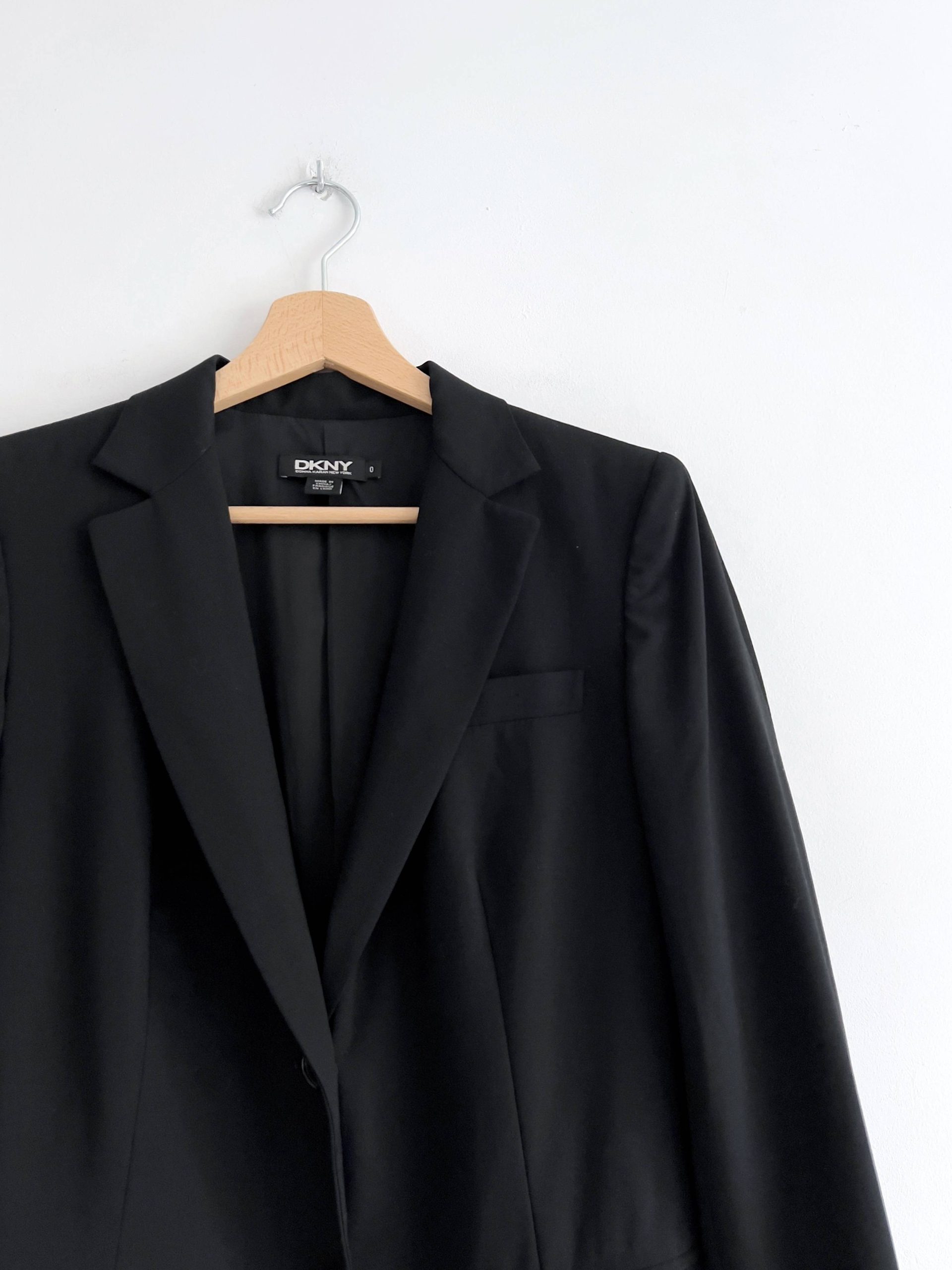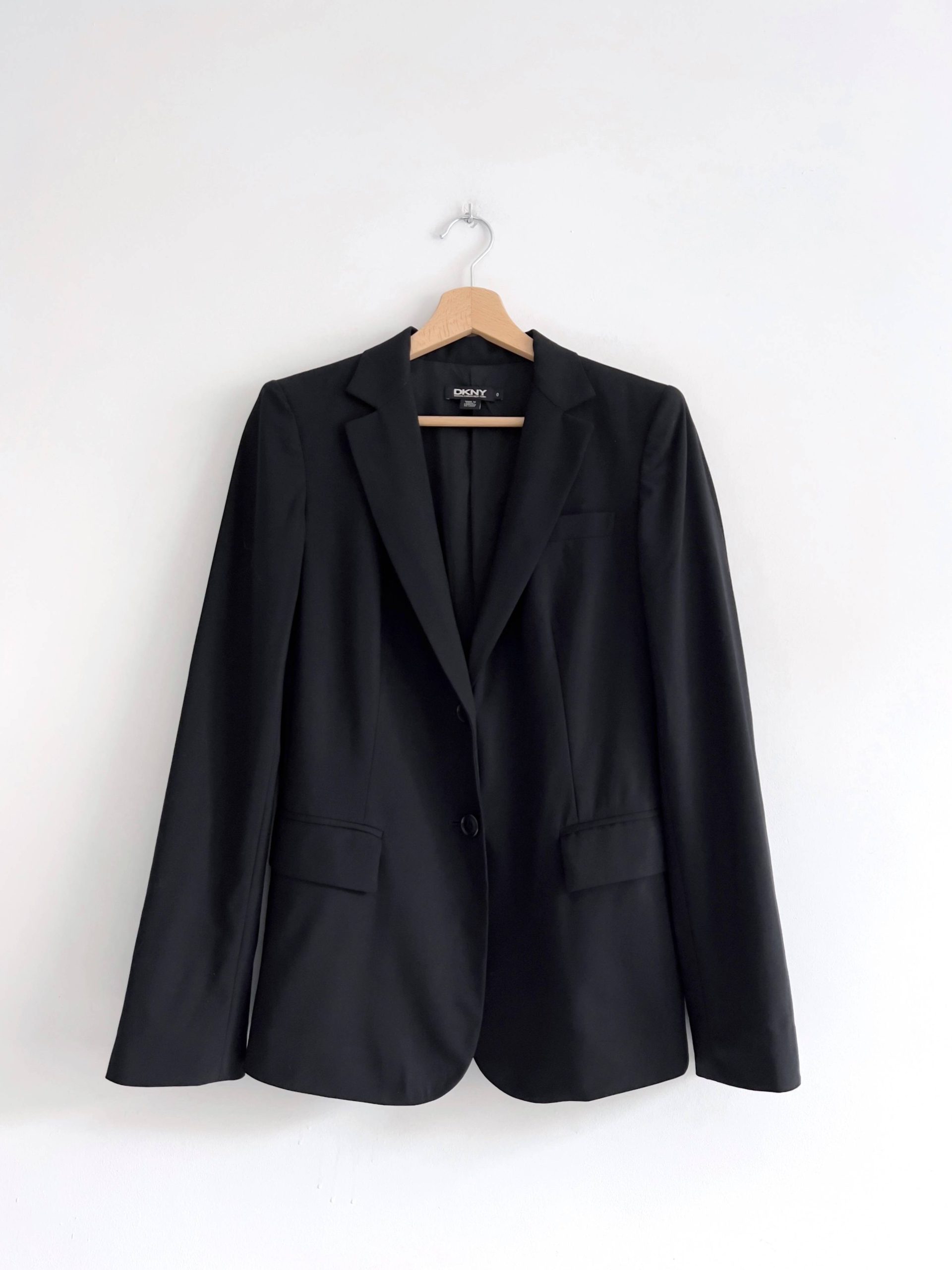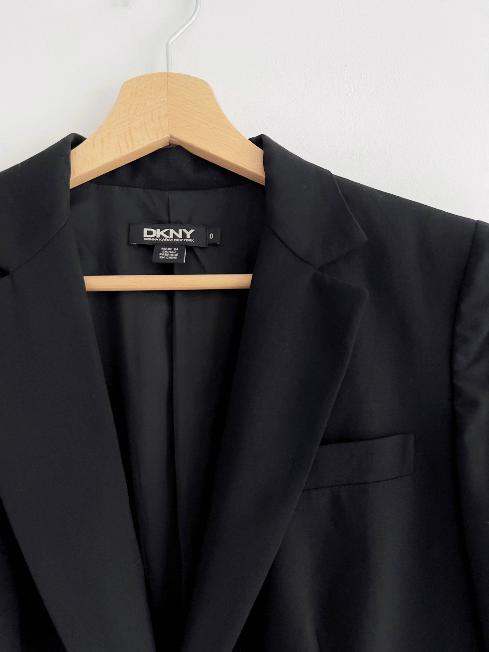 Wełniana marynarka od projektantki Donny Karan. Prosty fason, zapinana na 2 guziki. Rozmiar z metki 0, czyli XS. Bardzo dobry stan.