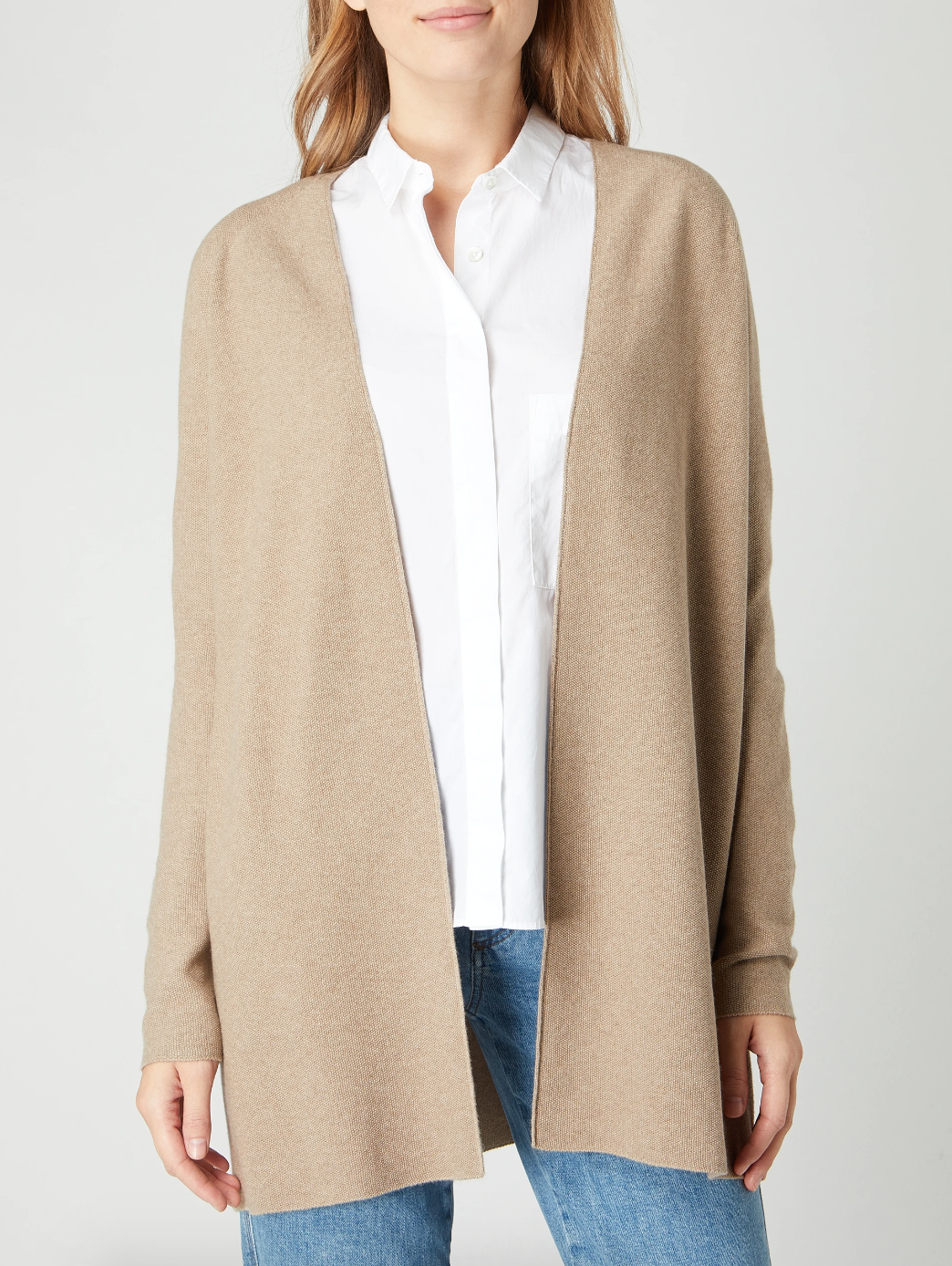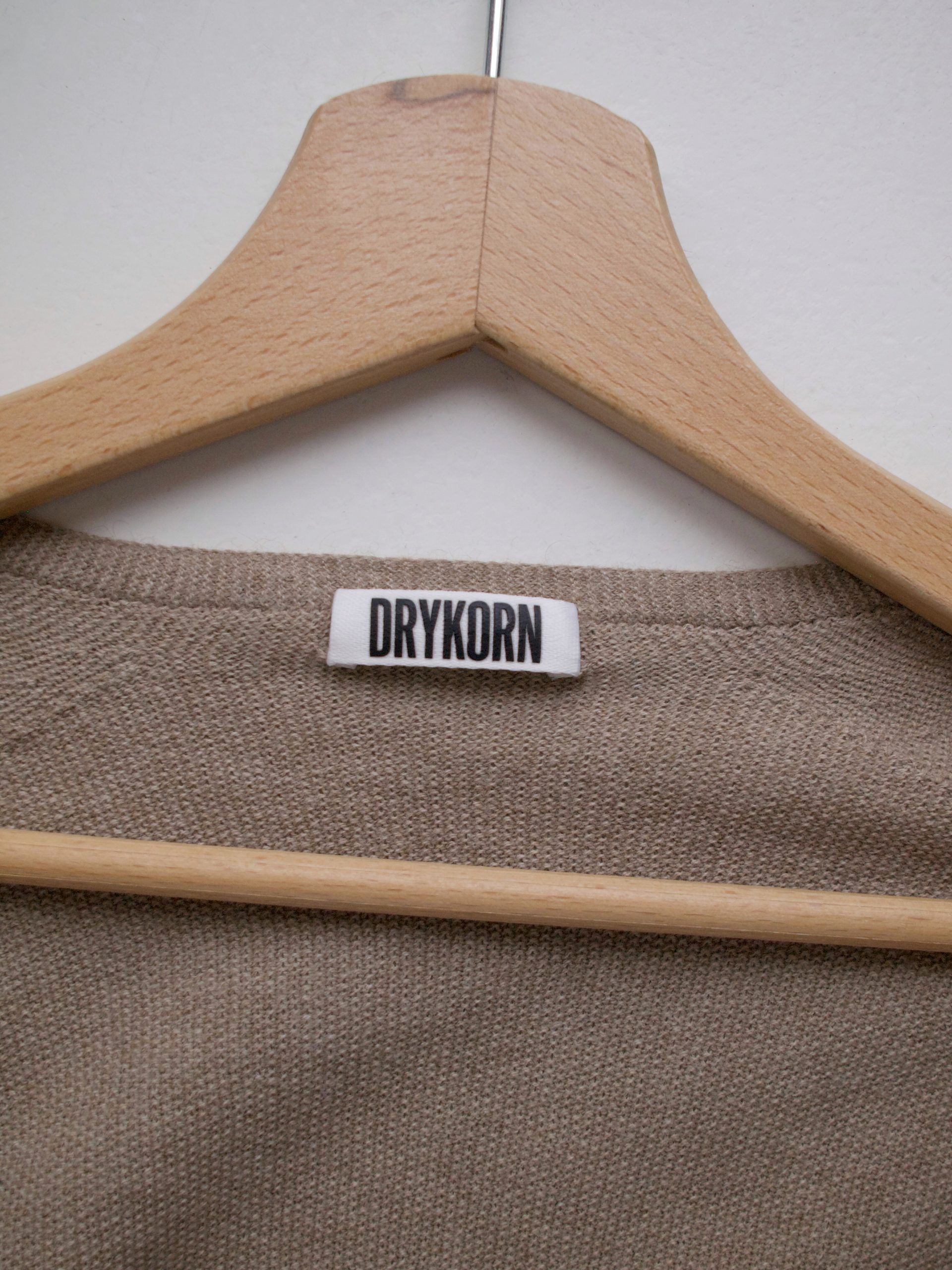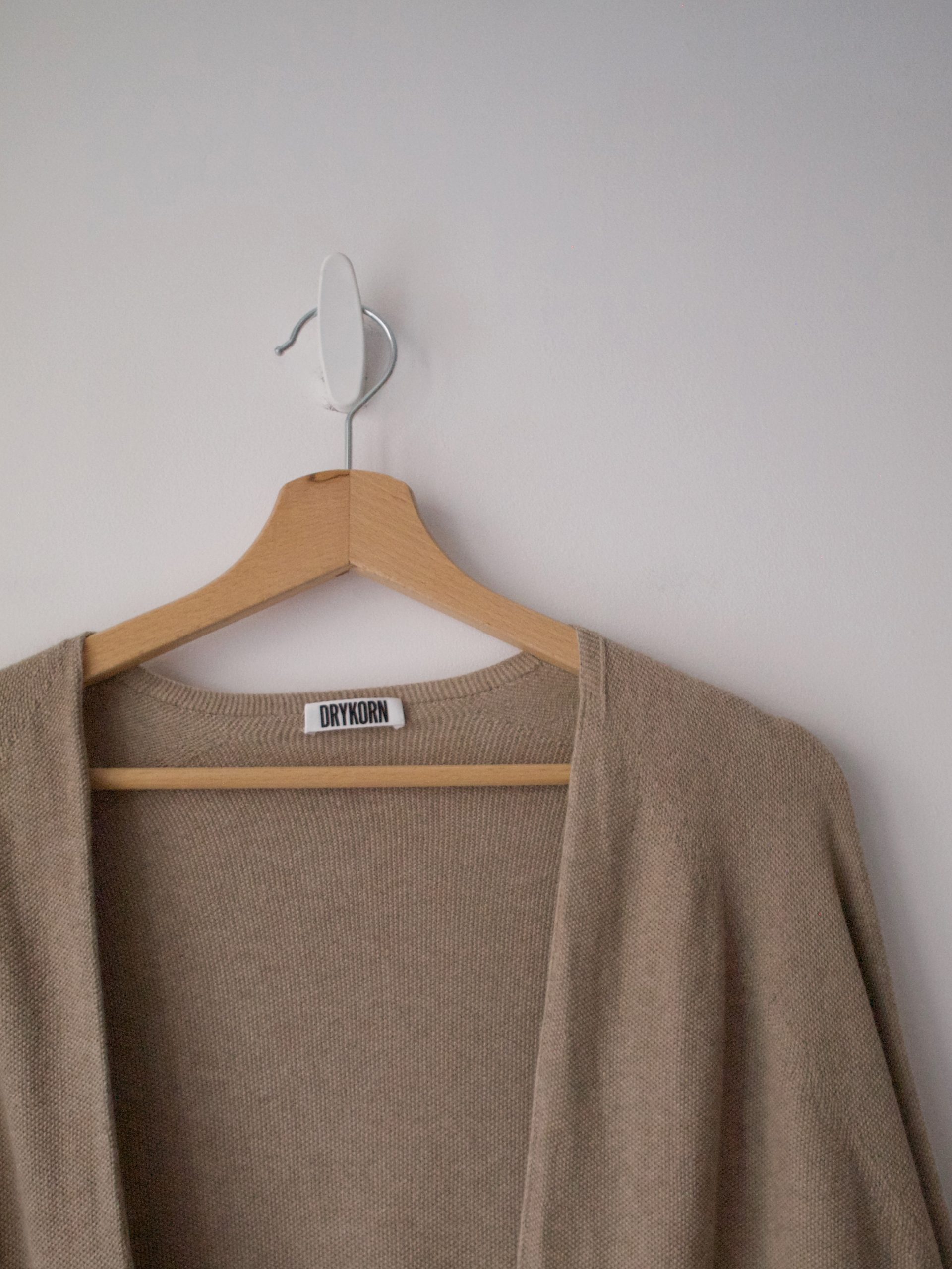 Długi kardigan w beżowym kolorze od skandynawskiej marki Drykorn, model Kanela. Cena katalogowa: 879 zł.