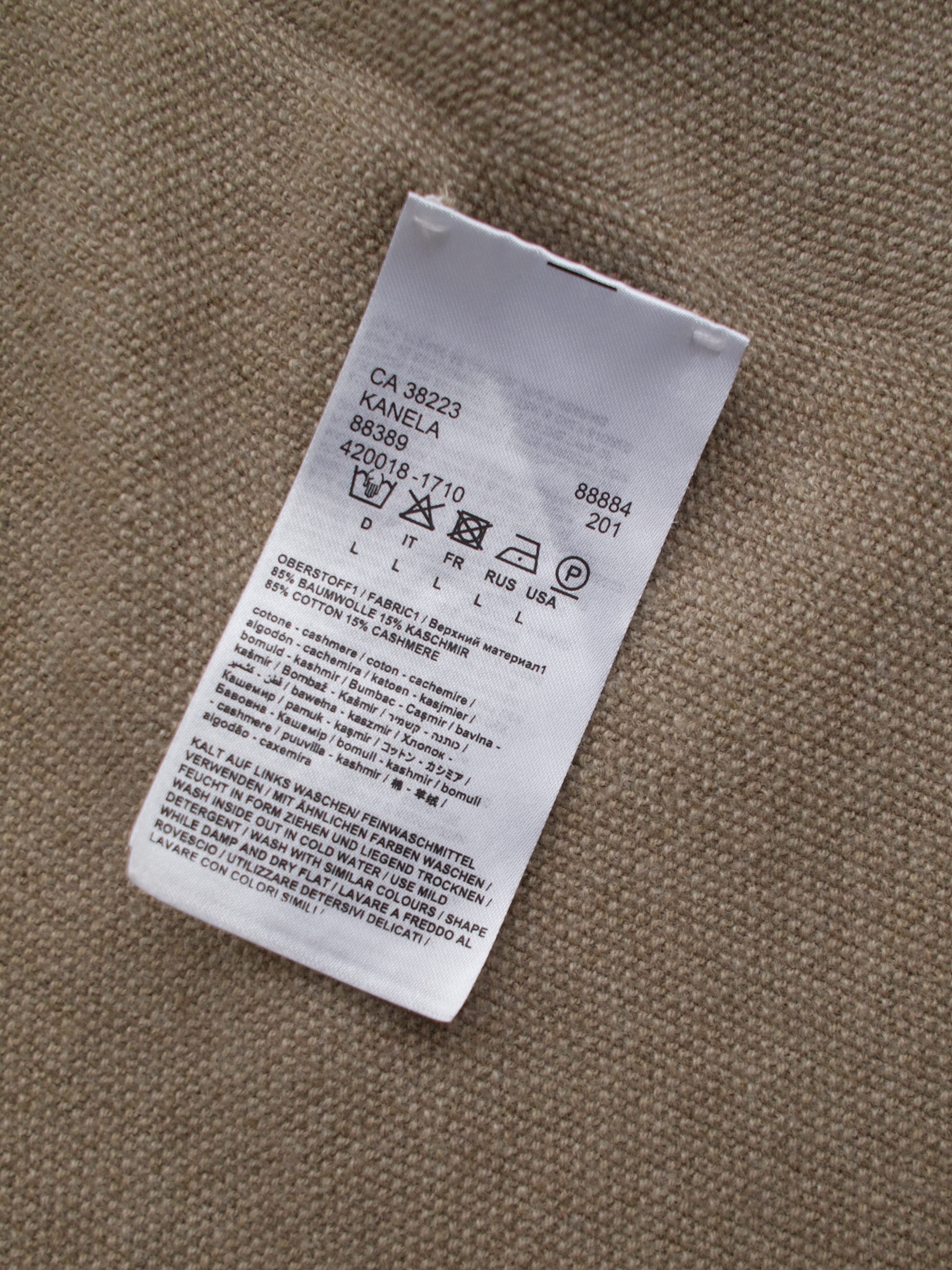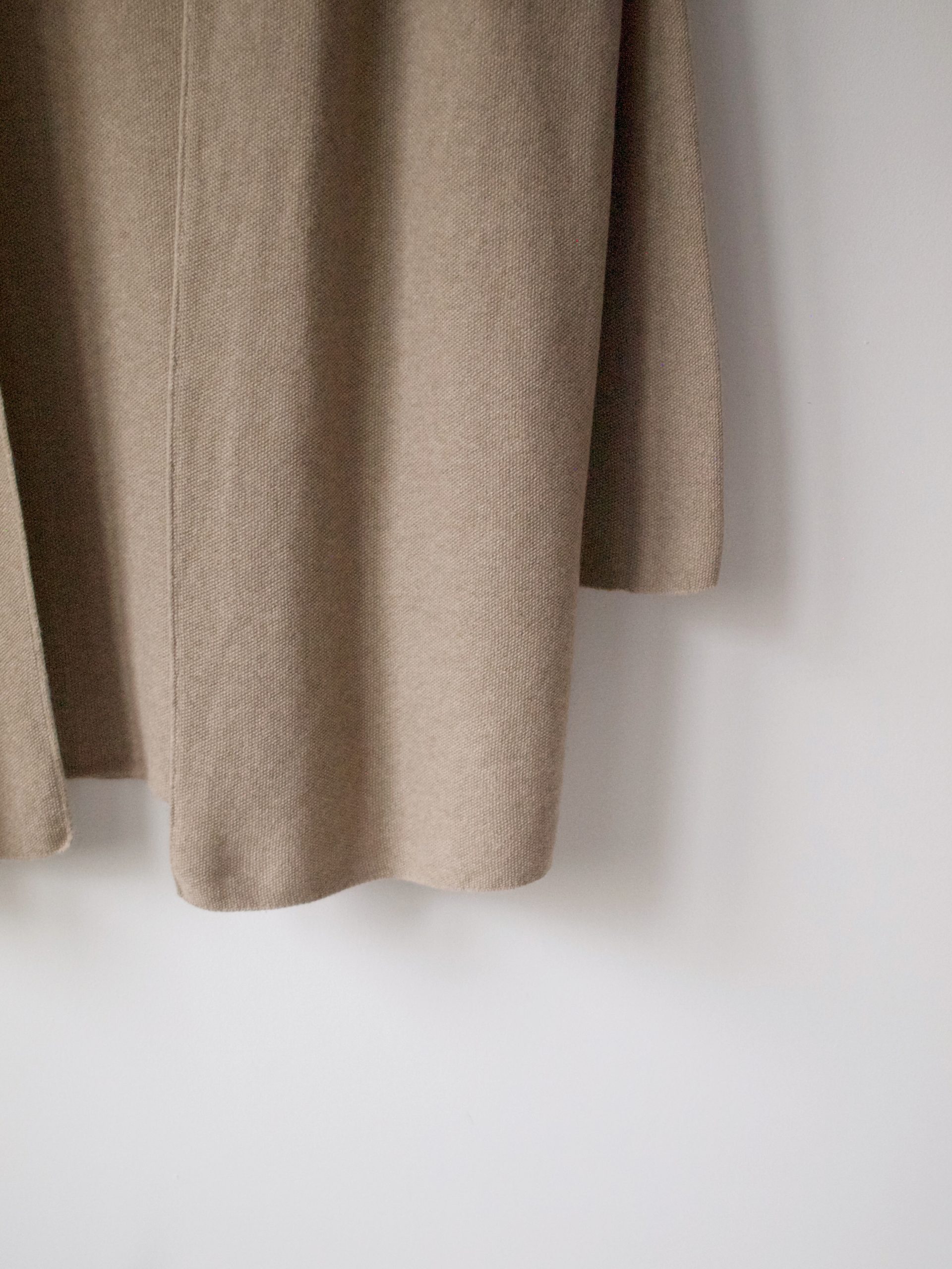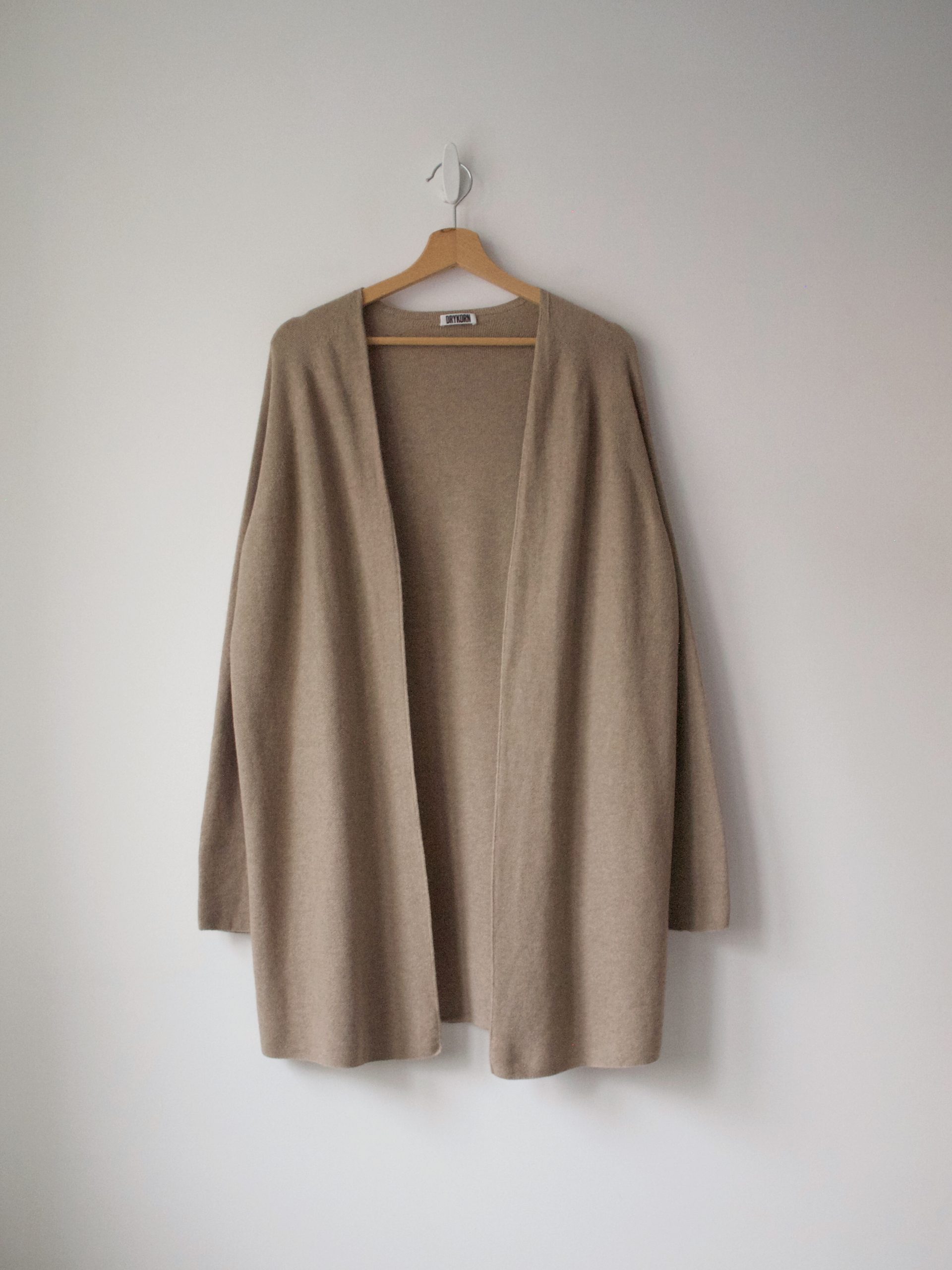 Długi kardigan w beżowym kolorze od skandynawskiej marki Drykorn, model Kanela. Cena katalogowa: 879 zł.