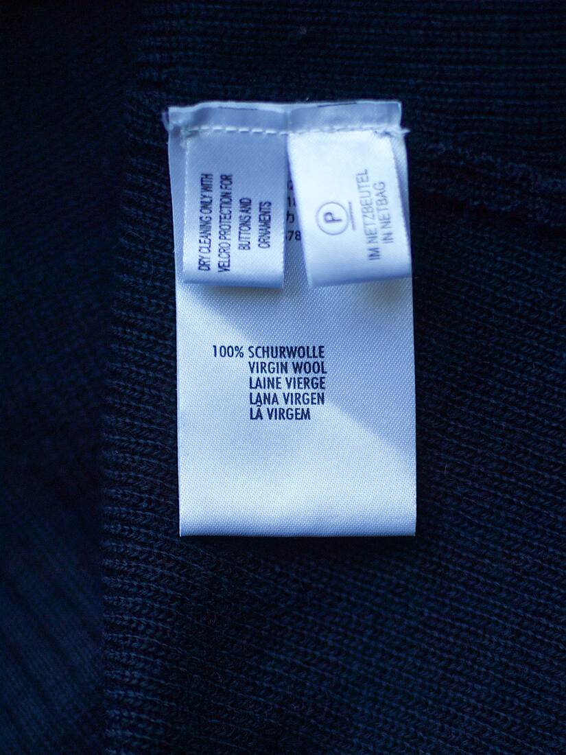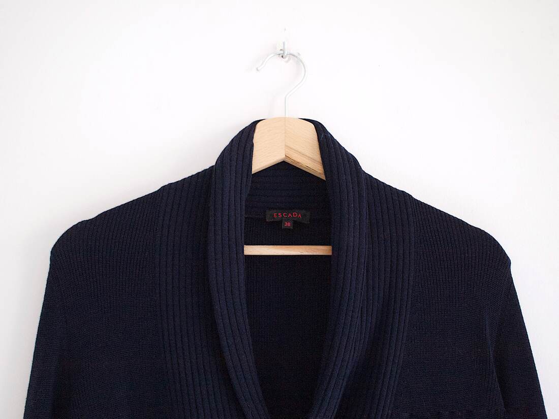 Kardigan domu mody Escada w głębokim granatowym kolorze. Wysoka jakość wykonania, 100% wełna z pierwszego strzyżenia. Zapinany na logowany guzik. Rozmiar z metki 38, idealny stan.