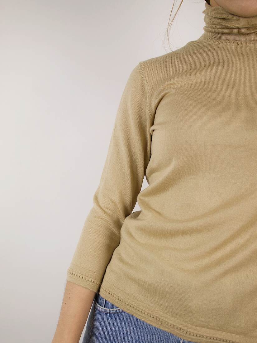 Cienki golfik domu mody ESCADA w kolorze złocisto beżowym. Wykonany z miłej w dotyku wełny z dodatkiem jedwabiu, nie gryzie. Rozmiar z metki 34, idealny stan.