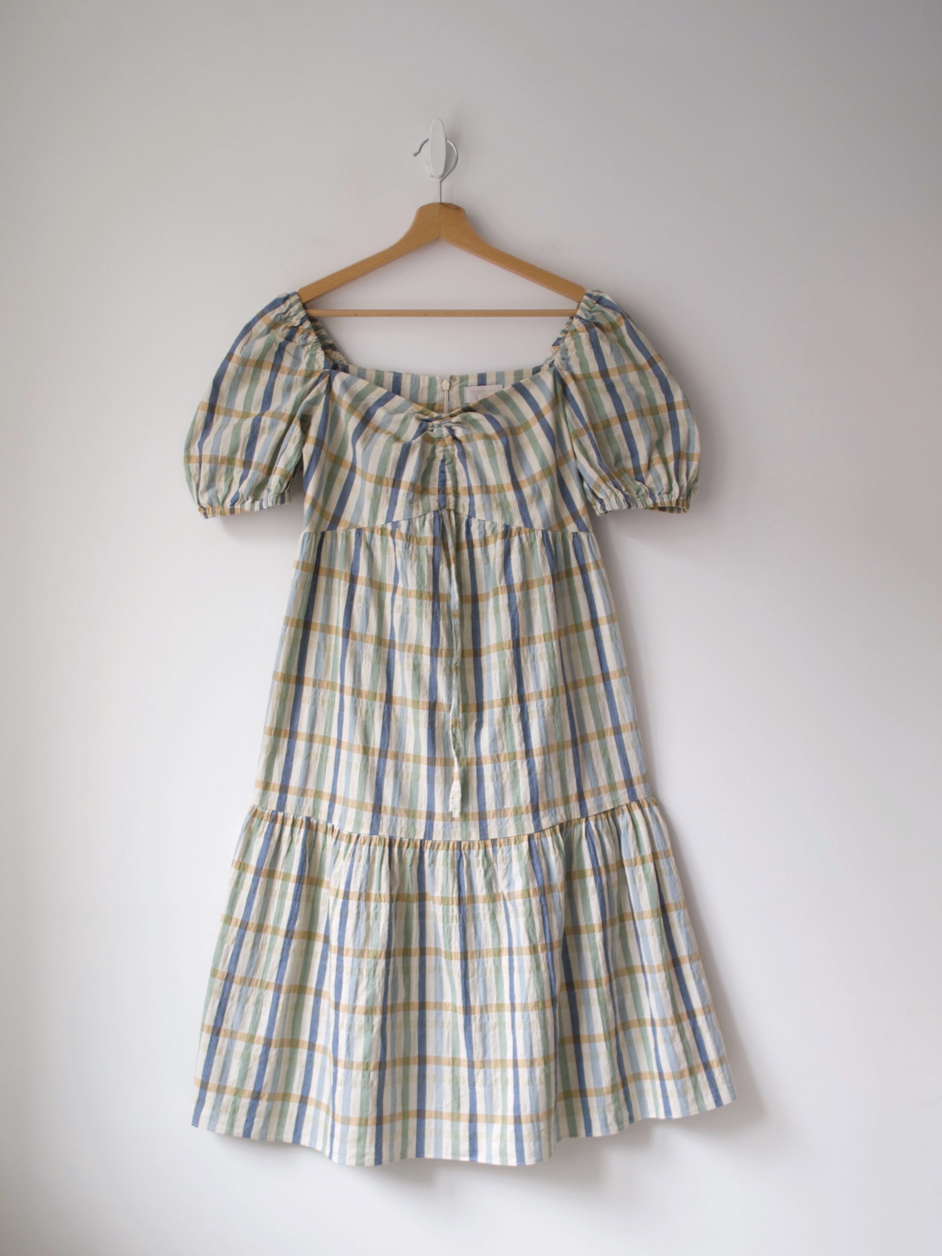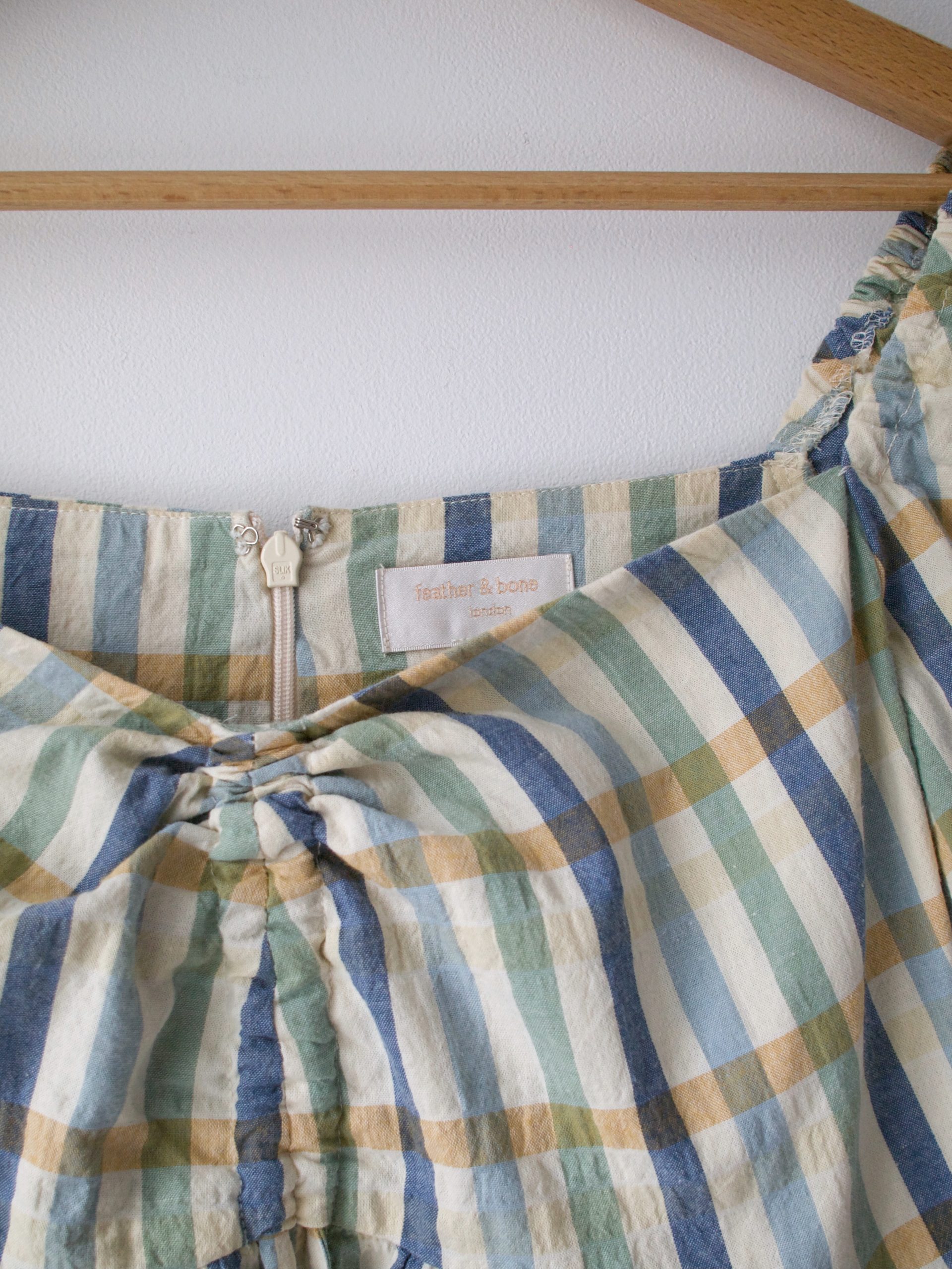 Sukienka w kratę brytyjskiej marki Feather and Bone, wykonana z teksturowanej bawełny, zapinana z tyłu na ukryty zamek.