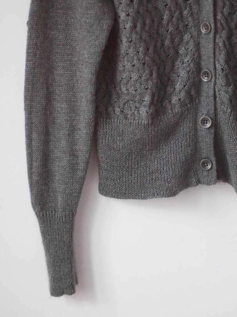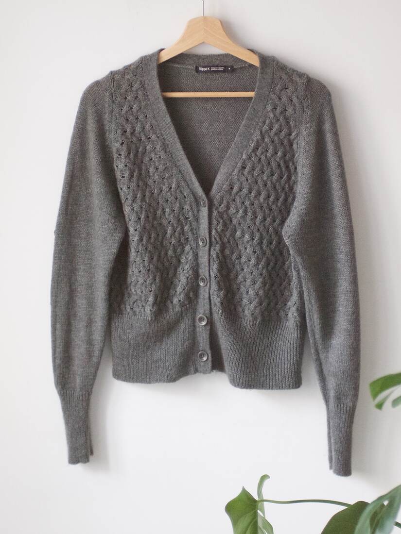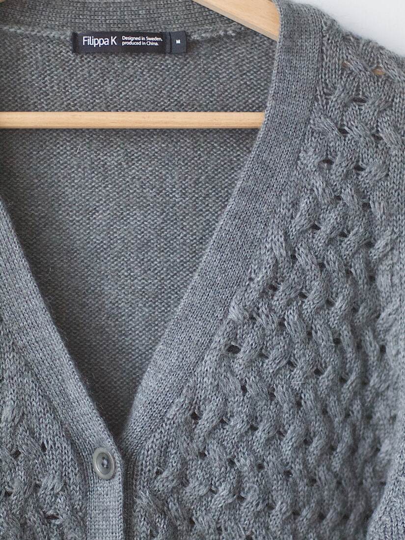Kardigan o krótszym kroju, idealny do wysokich spodni. Rozmiar z metki M. Sweterek mimo zawartości moheru w składzie nie gryzie, jest mięciutki i miły w dotyku.