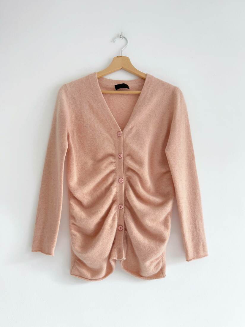 Kaszmirowy kardigan luksusowej austriackiej marki Firusas Cashmere. Brak dolnego guzika, nie jest to widoczne w noszeniu. Poza tym bez wad. Polecam na XS-S.