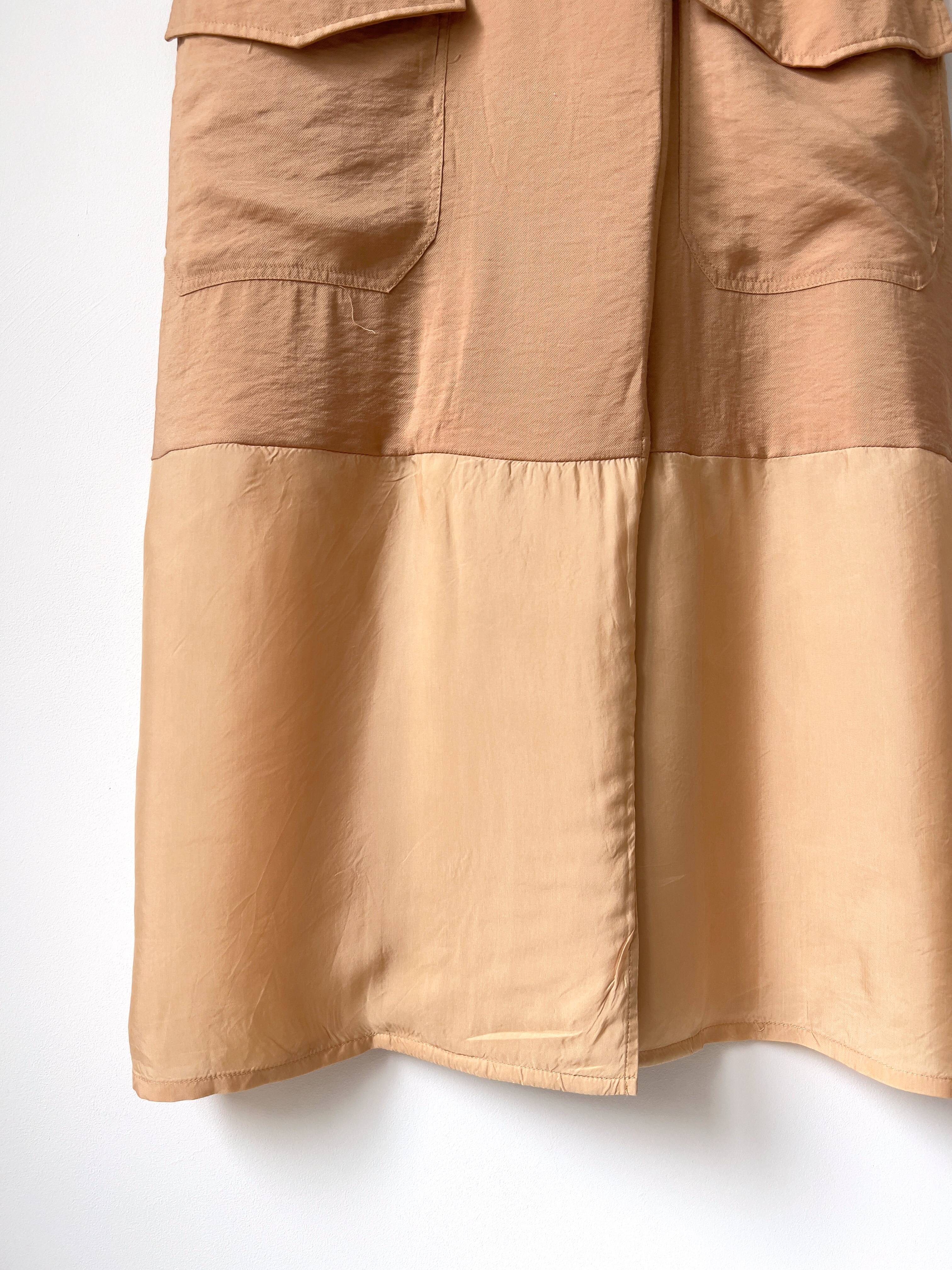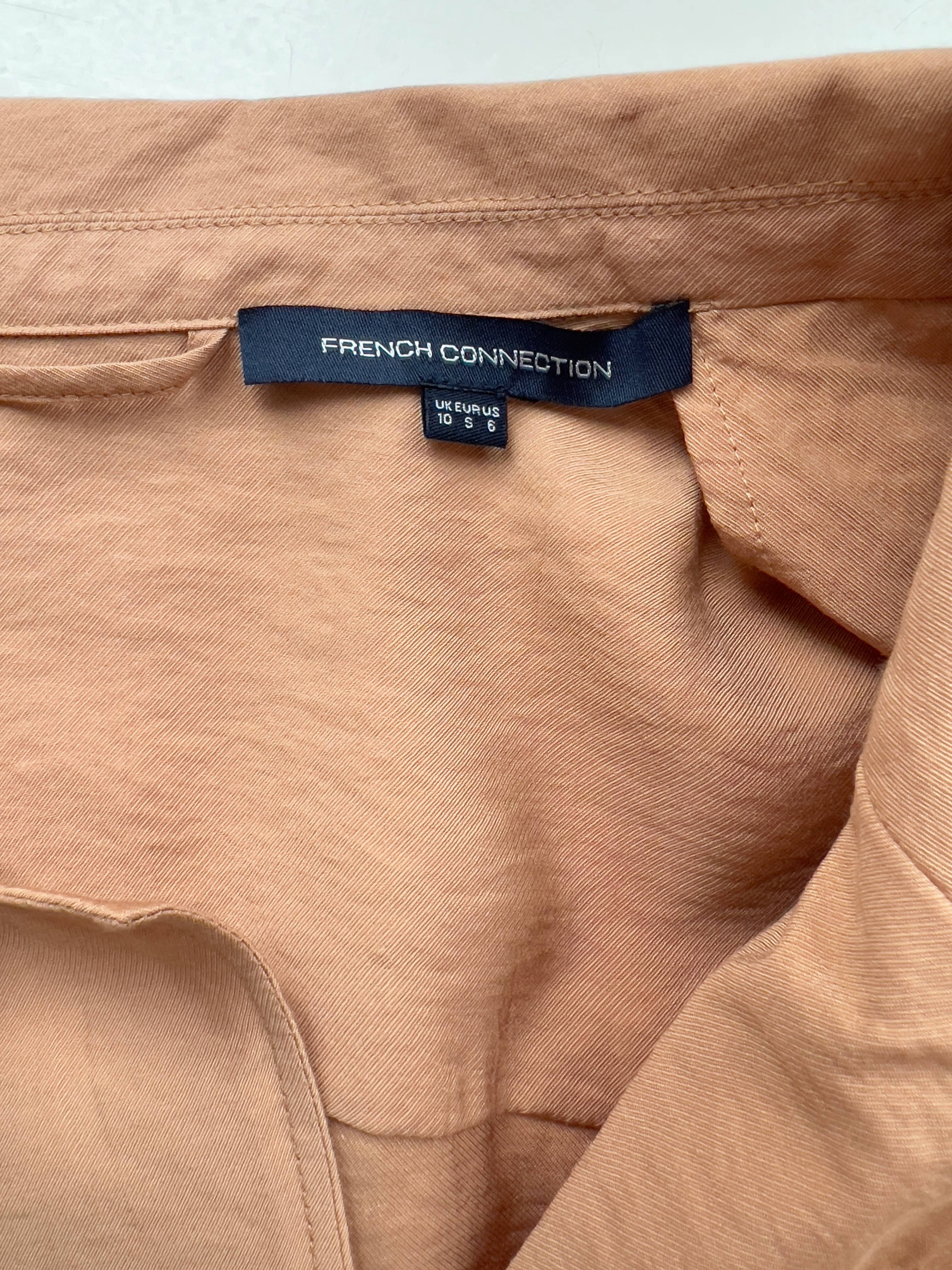 Sukienka lub długa kamizelkaj ekskluzywne marki French Connection. Zapinana na dwa ukryte guziki, posiada szlufki na pasek. Metka ze składem wycięta, cześć główna jest z wiskozy lub mieszanki wiskozy oraz jedwabiu, dolna część kontrastowa 100% jedwab. Rozmiar z metki 36 (luźny), bez wad.
