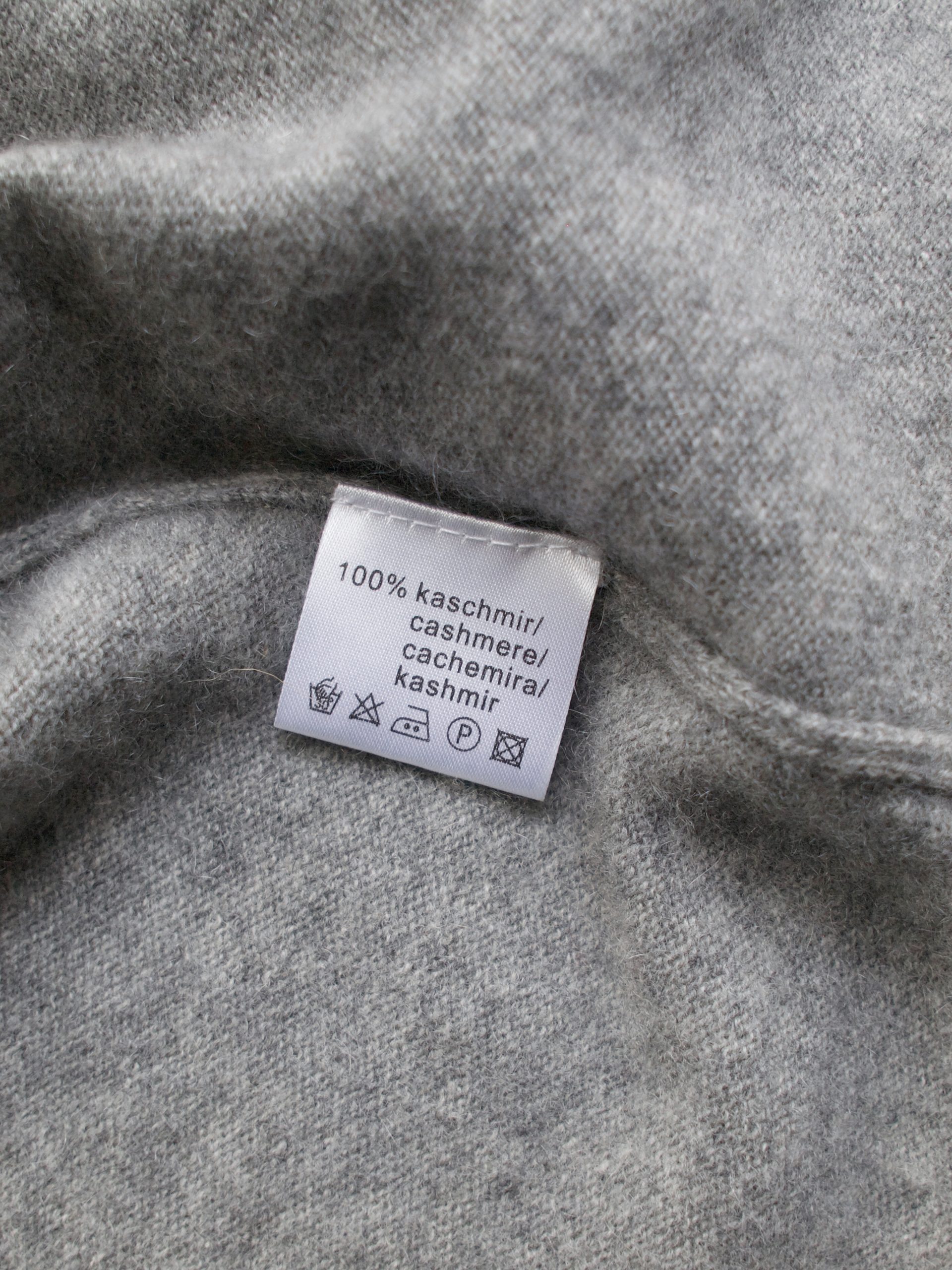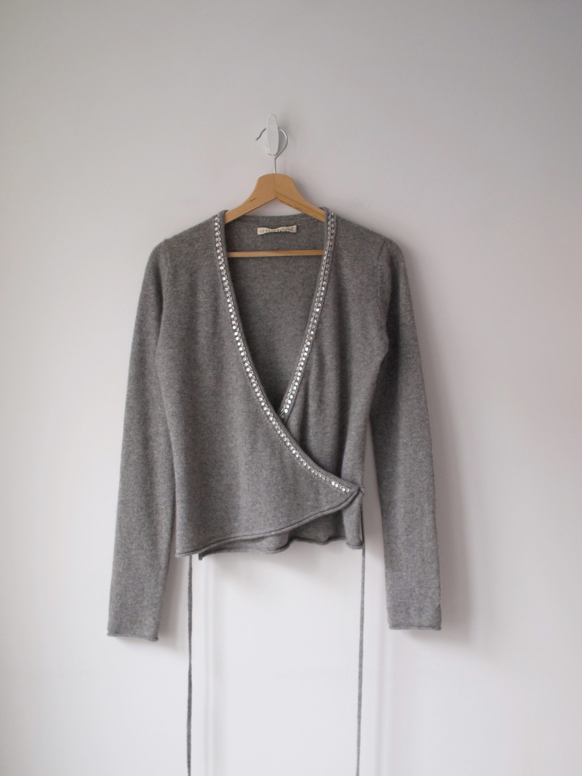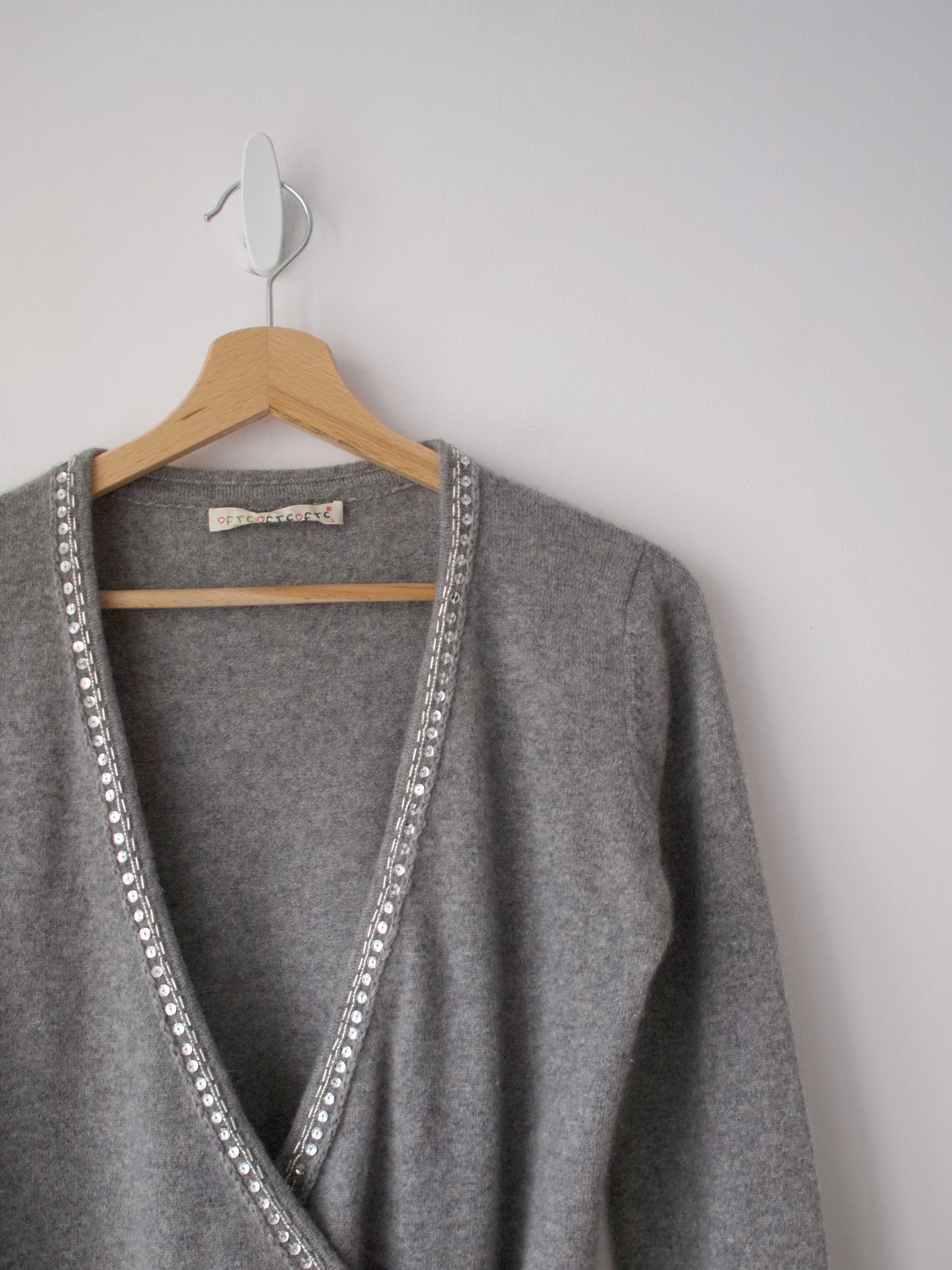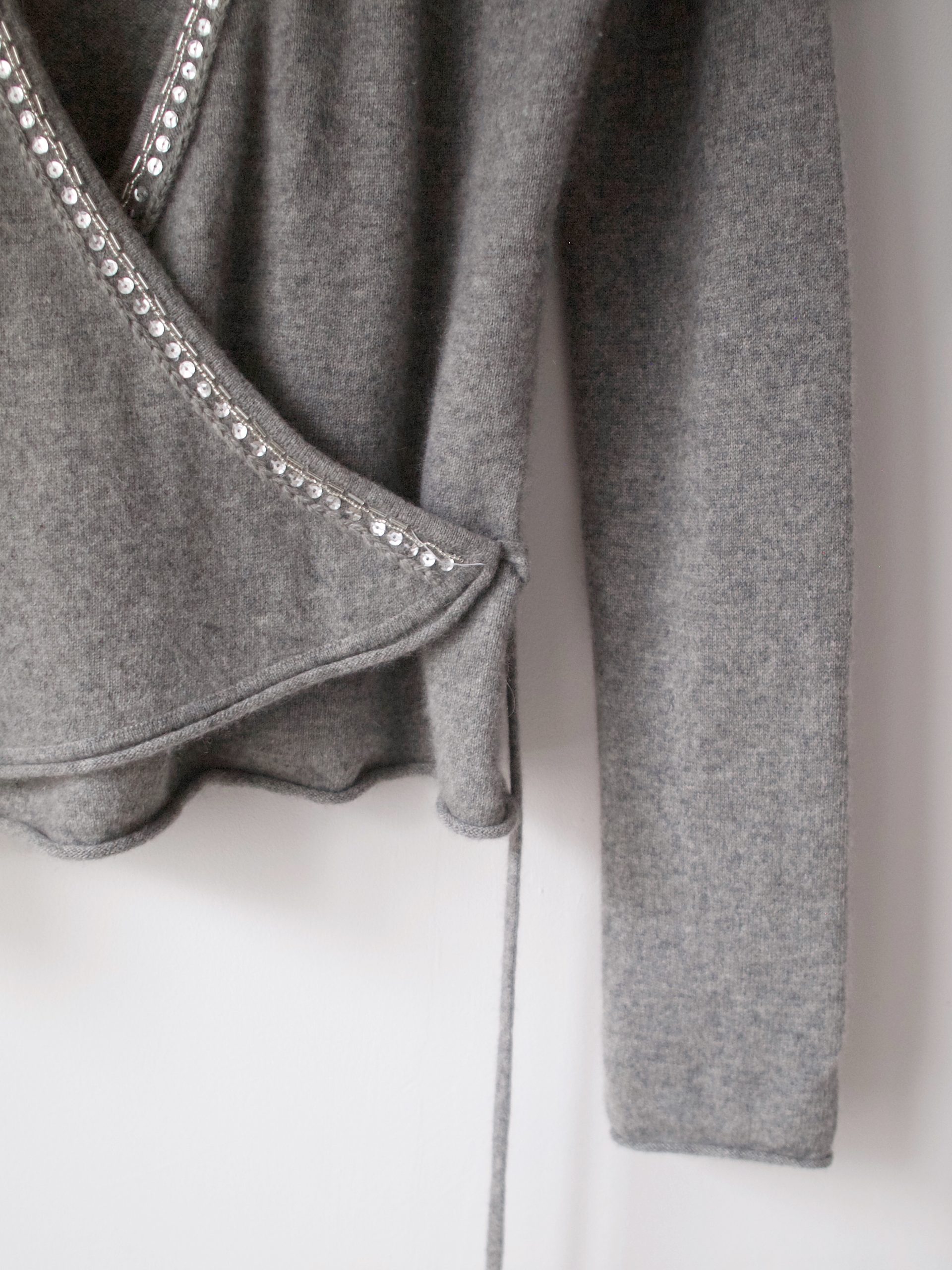 Szary kopertowy sweter marki FTC Cashmere, zdobiny cekinami wzdłuż dekoltu. Marka FTC Cashmere słynie z luksusowych, ekologicznych wyrobów z kaszmiru.