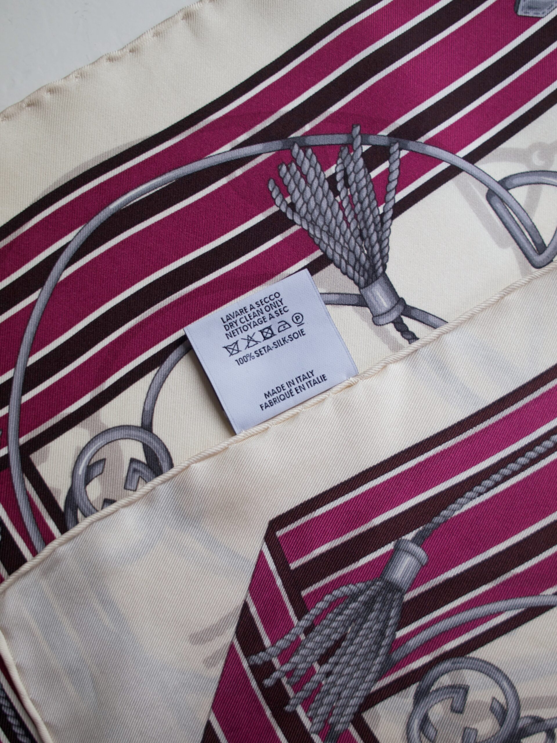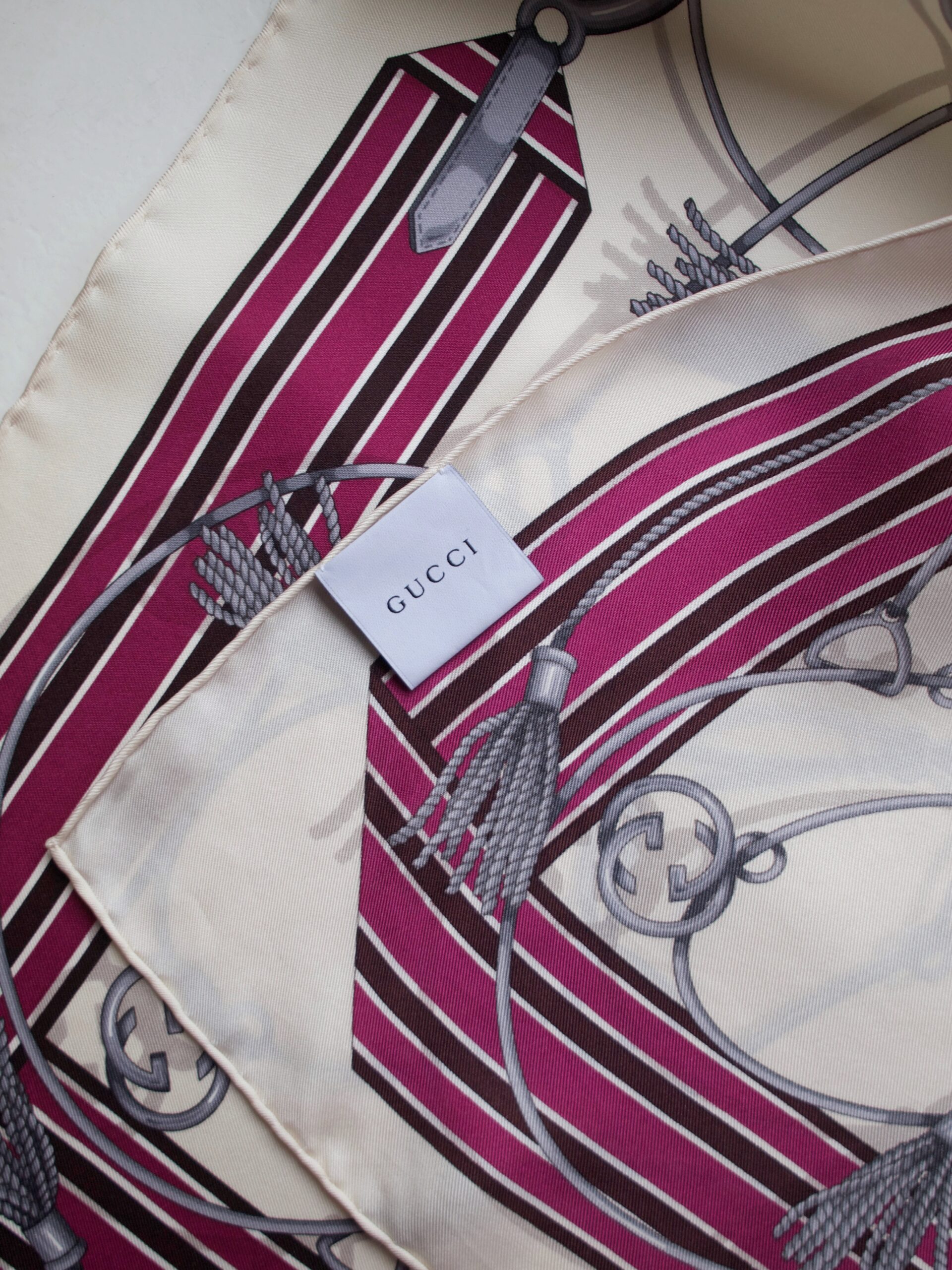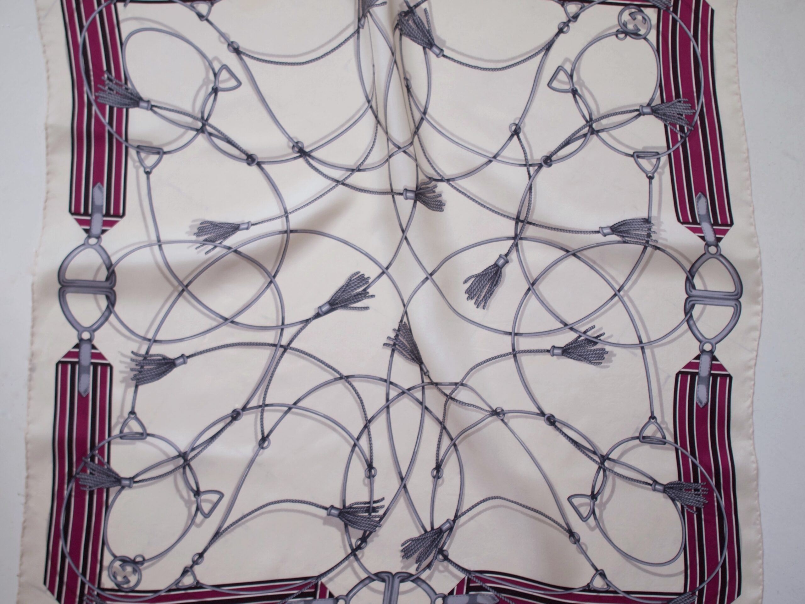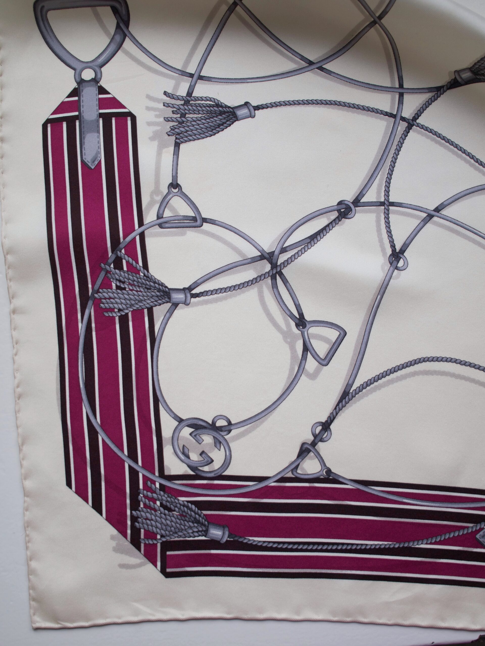 Jedwabna chusta domu mody GUCCI. Wykonana z gęstego jedwabiu w kolorze ecru, ręcznie rolowana. Kolory są soczyste i nie są wyblakłe. Wyprodukowana we Włoszech. Stan idealny.