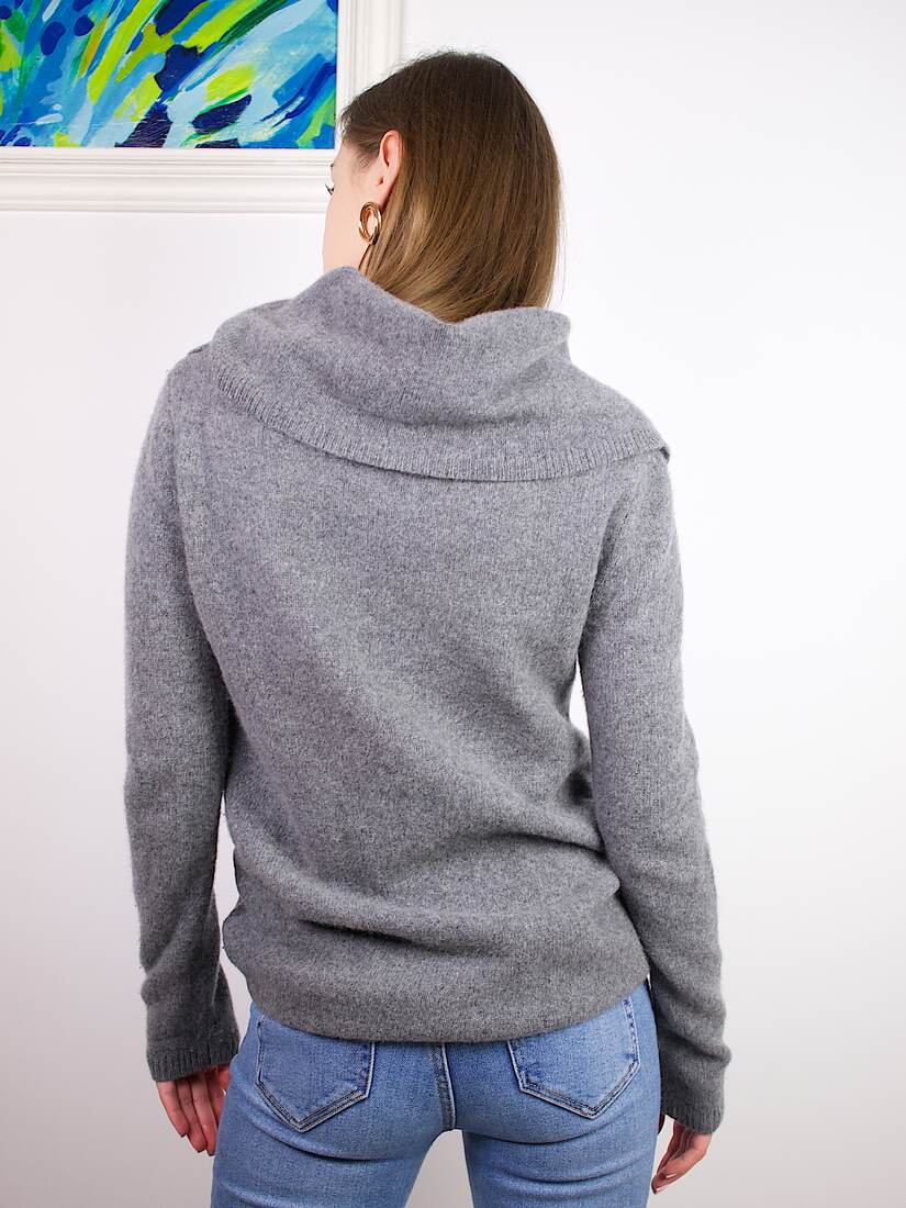 Gruby i puszysty sweter niemieckiej marki Hallhuber. Wykonany z wełny z dodatkiem kaszmiru. Duży golf można nosić na różne sposoby. Rozmiar z metki M, będzie pasować także na S. Modelka ma 165 cm wzrostu i nosi rozmiar XS-S. Bez wad.
