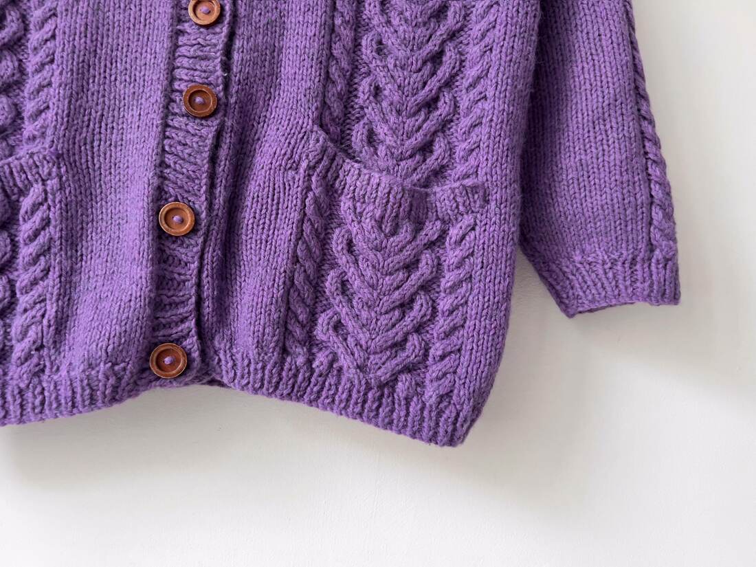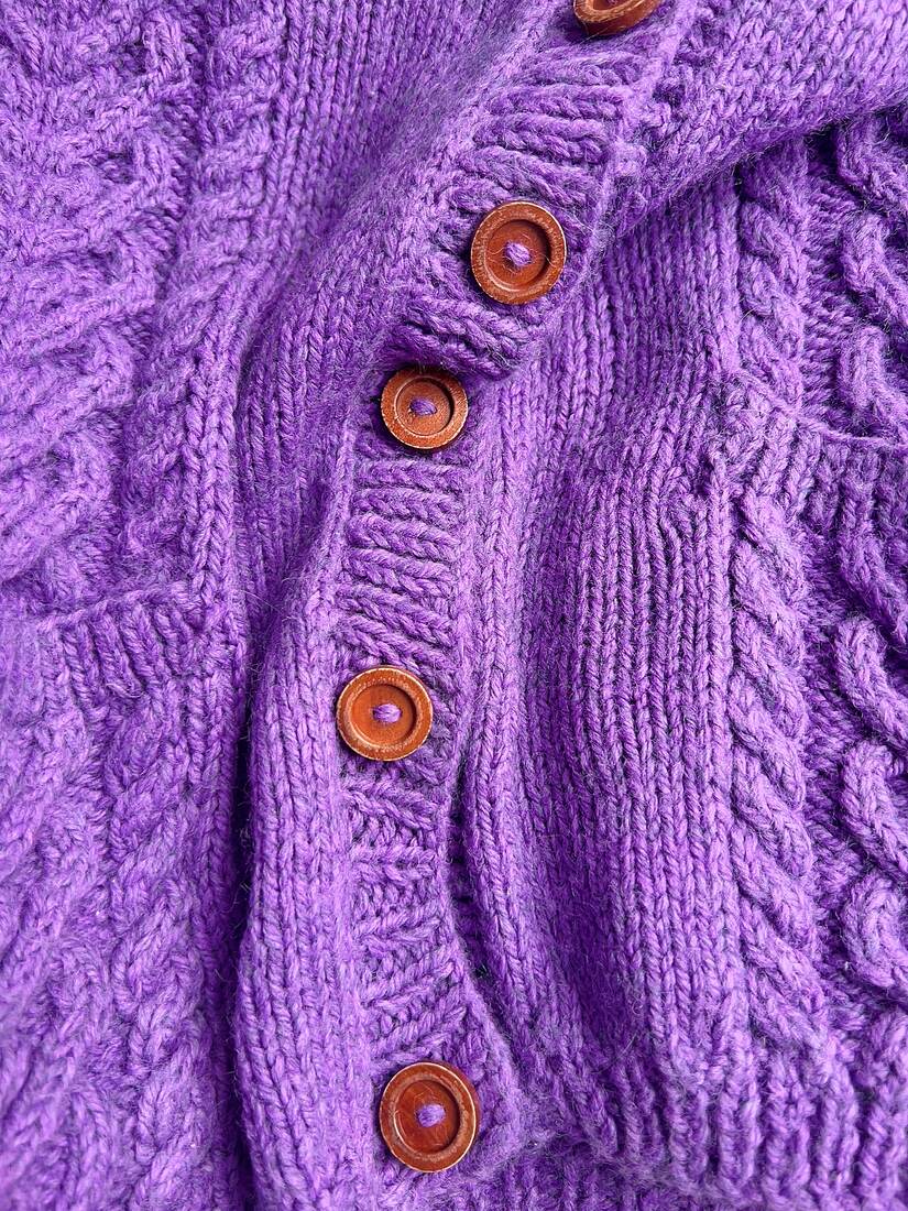 Gruby ręcznie robiony kardigan. Zapinany na drewniane guziki. Brak metki z rozmiarem, dość uniwersalny. Bardzo dobry stan.