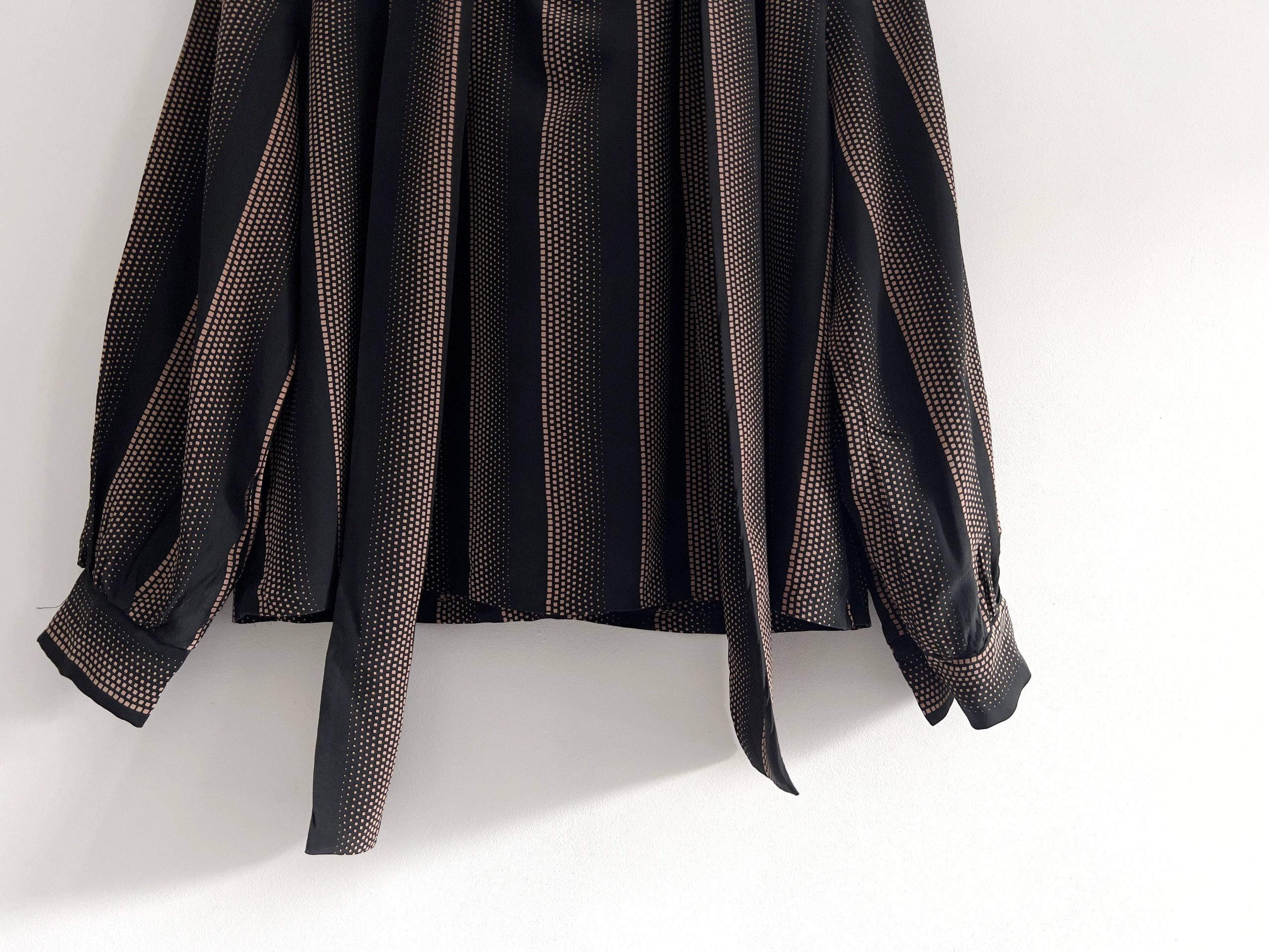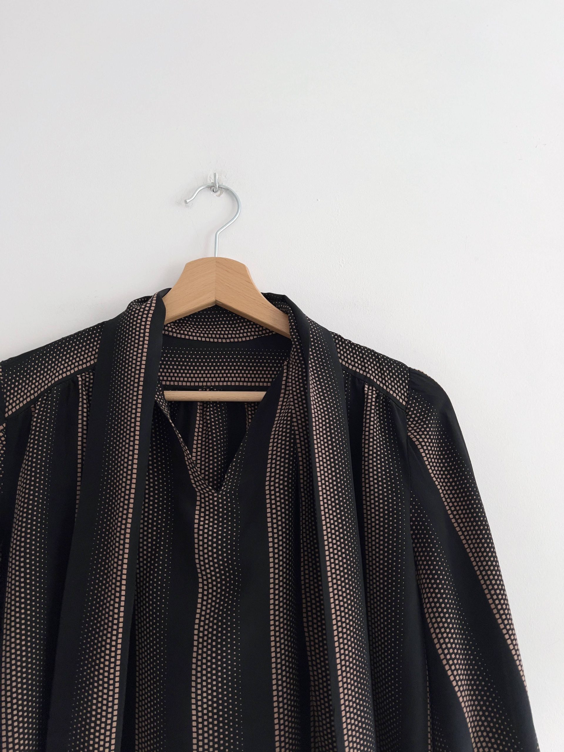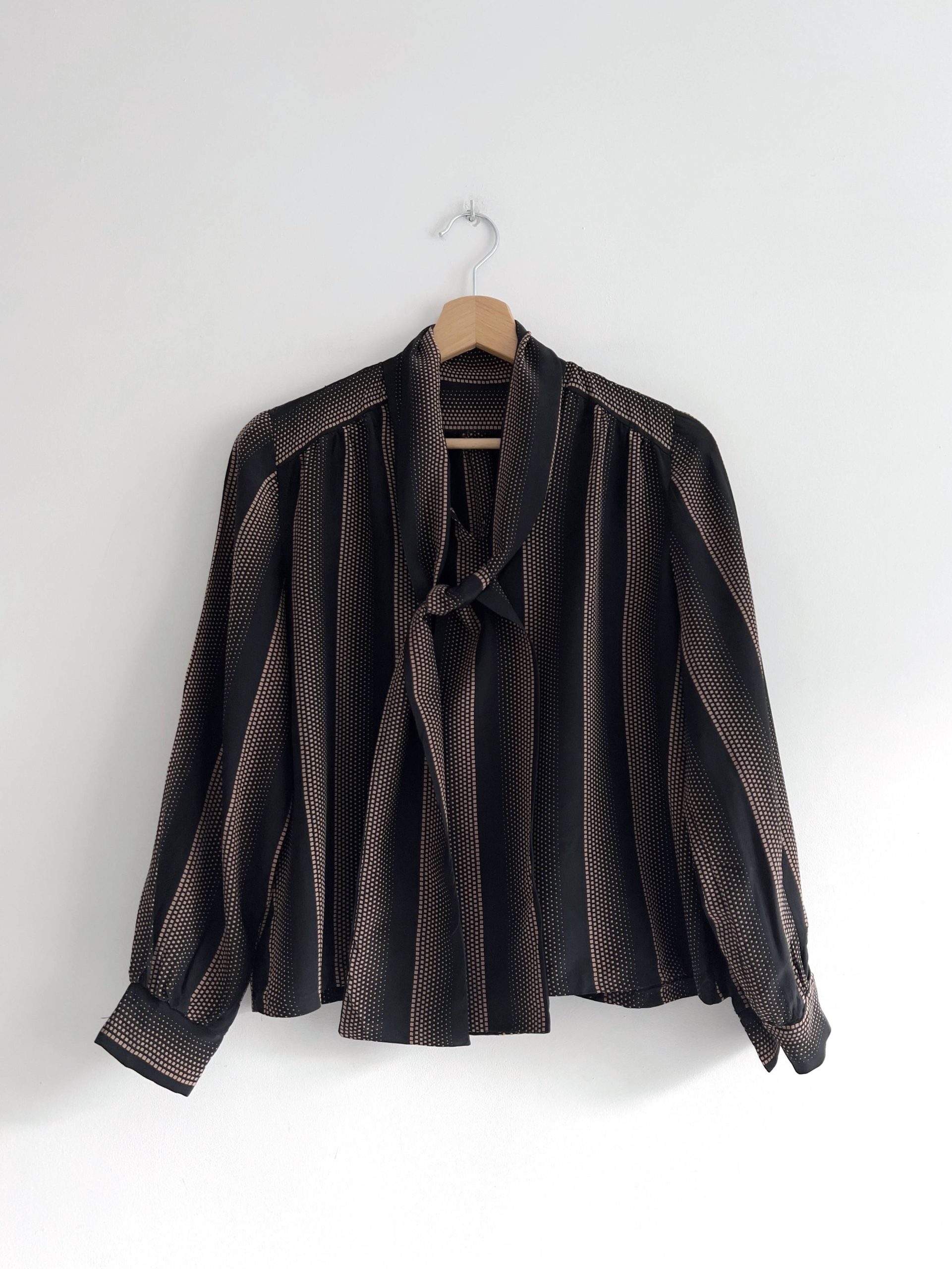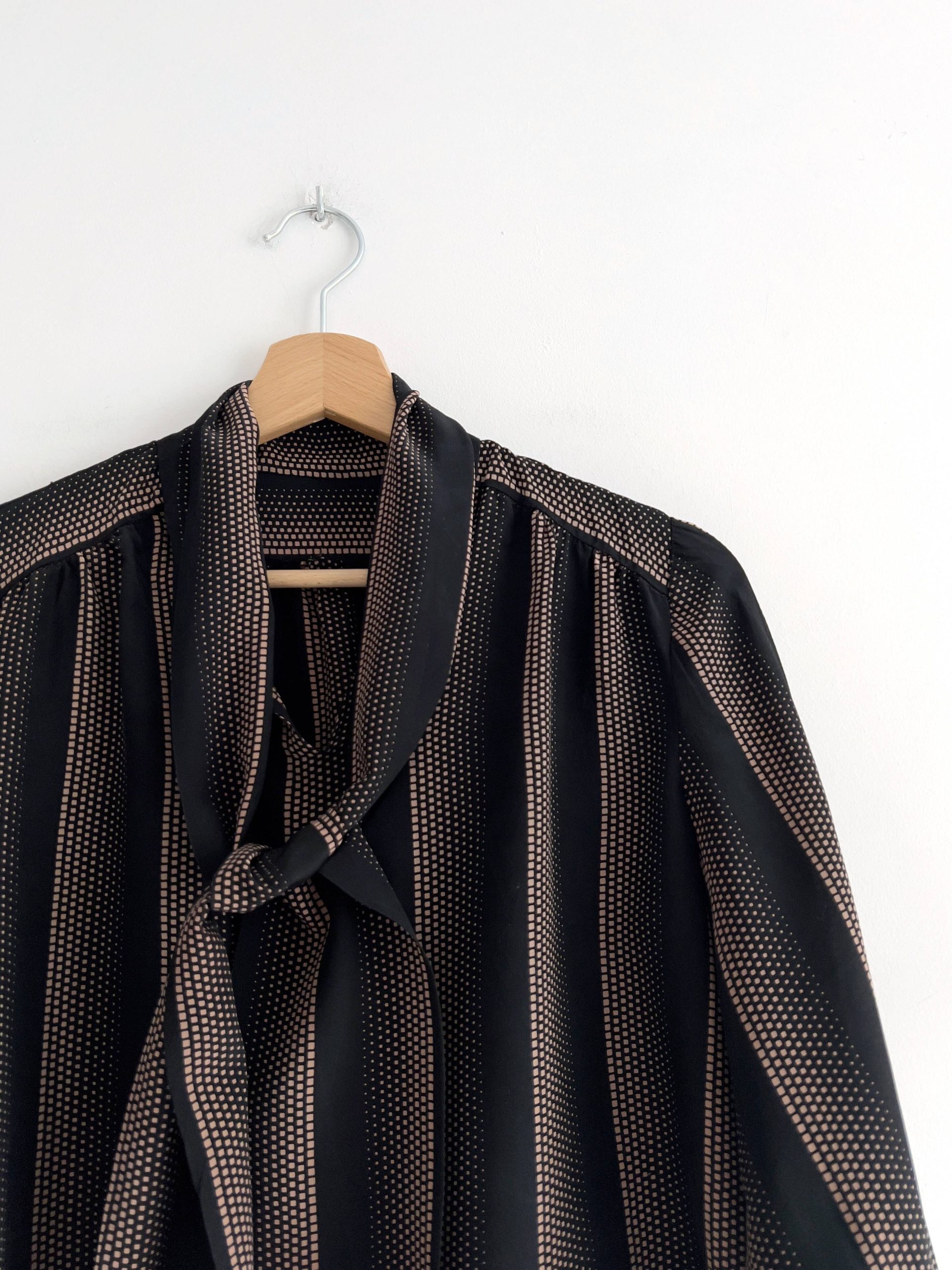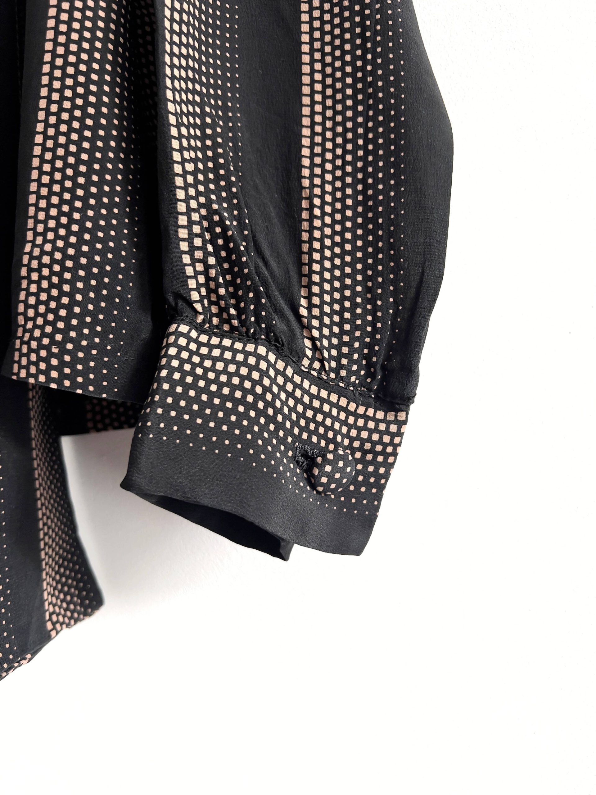 Ręcznie szyta koszula vintage. Brak metki ze składem, na pewno jest to jedwab. Dość uniwersalny fason, zależnie od preferowanego dopasowania polecam na XS-S-M. Bez wad.