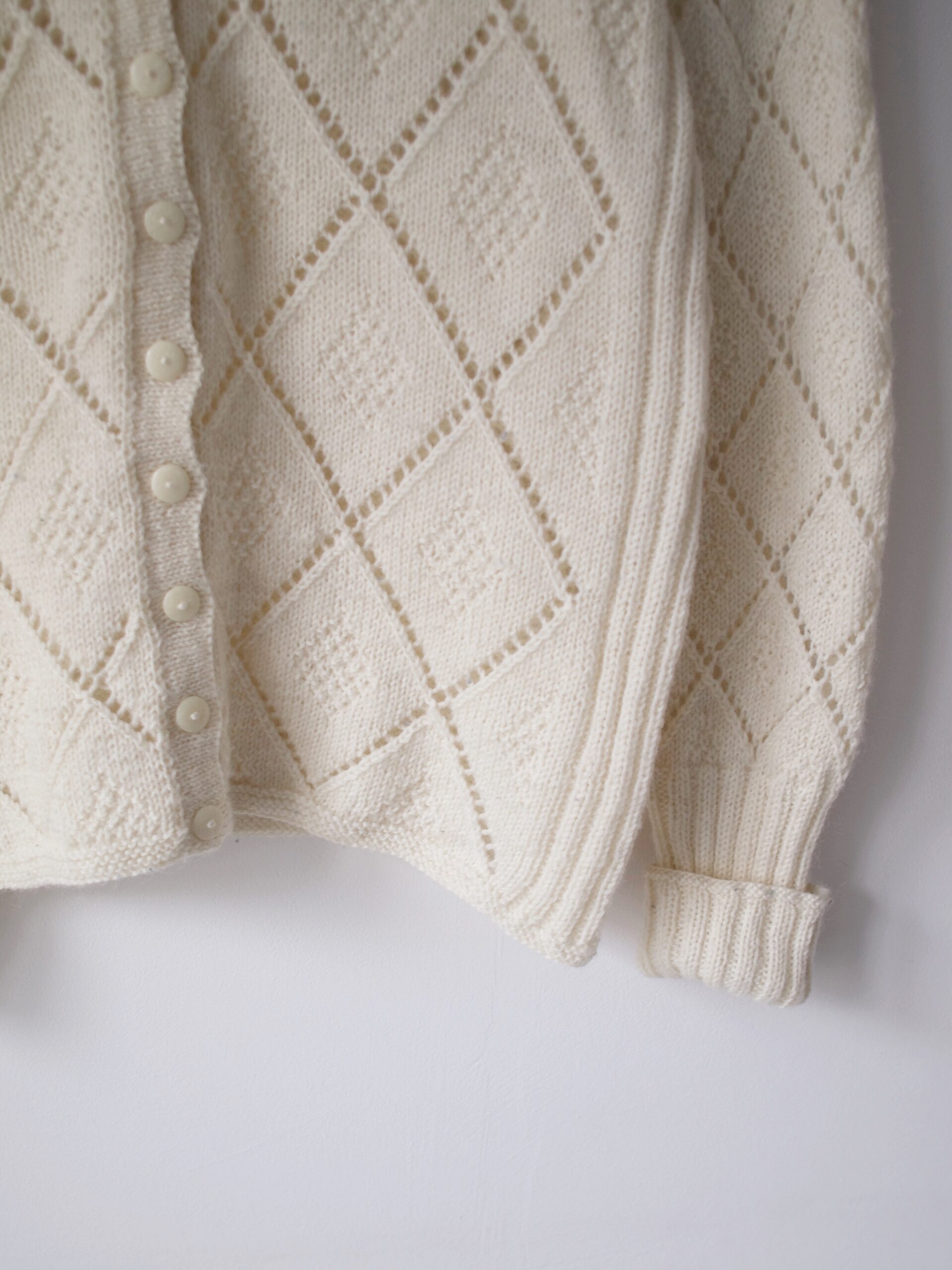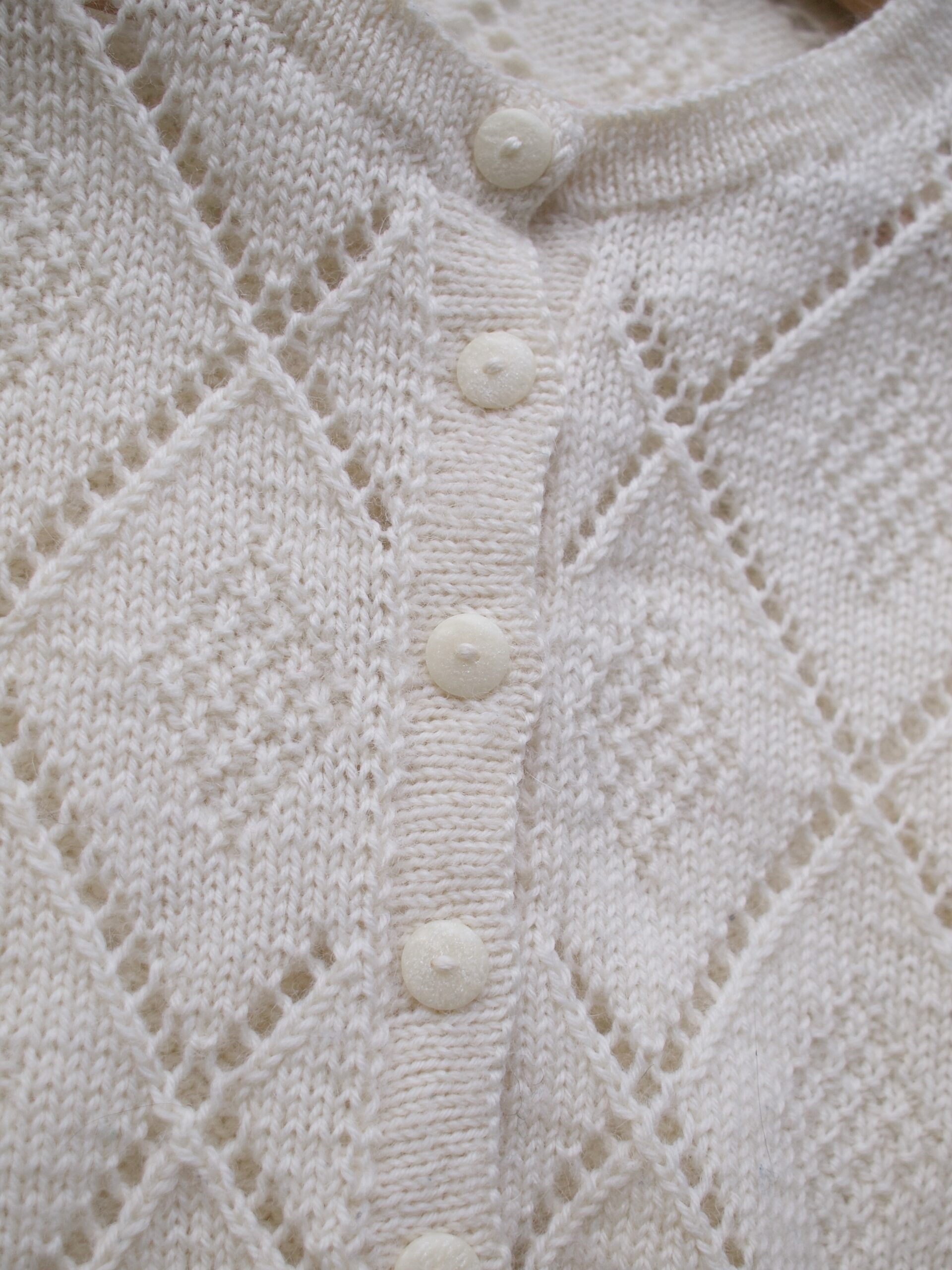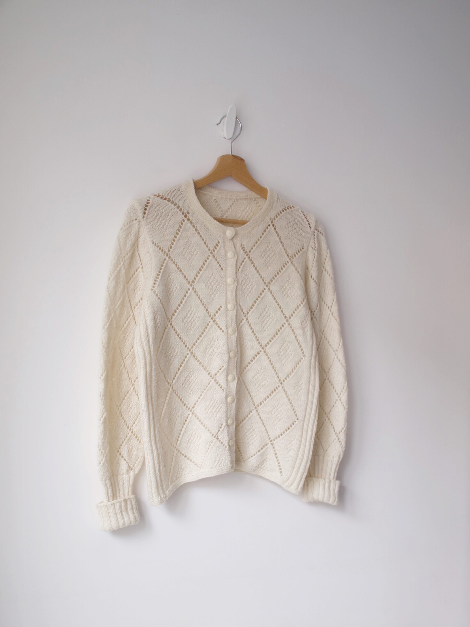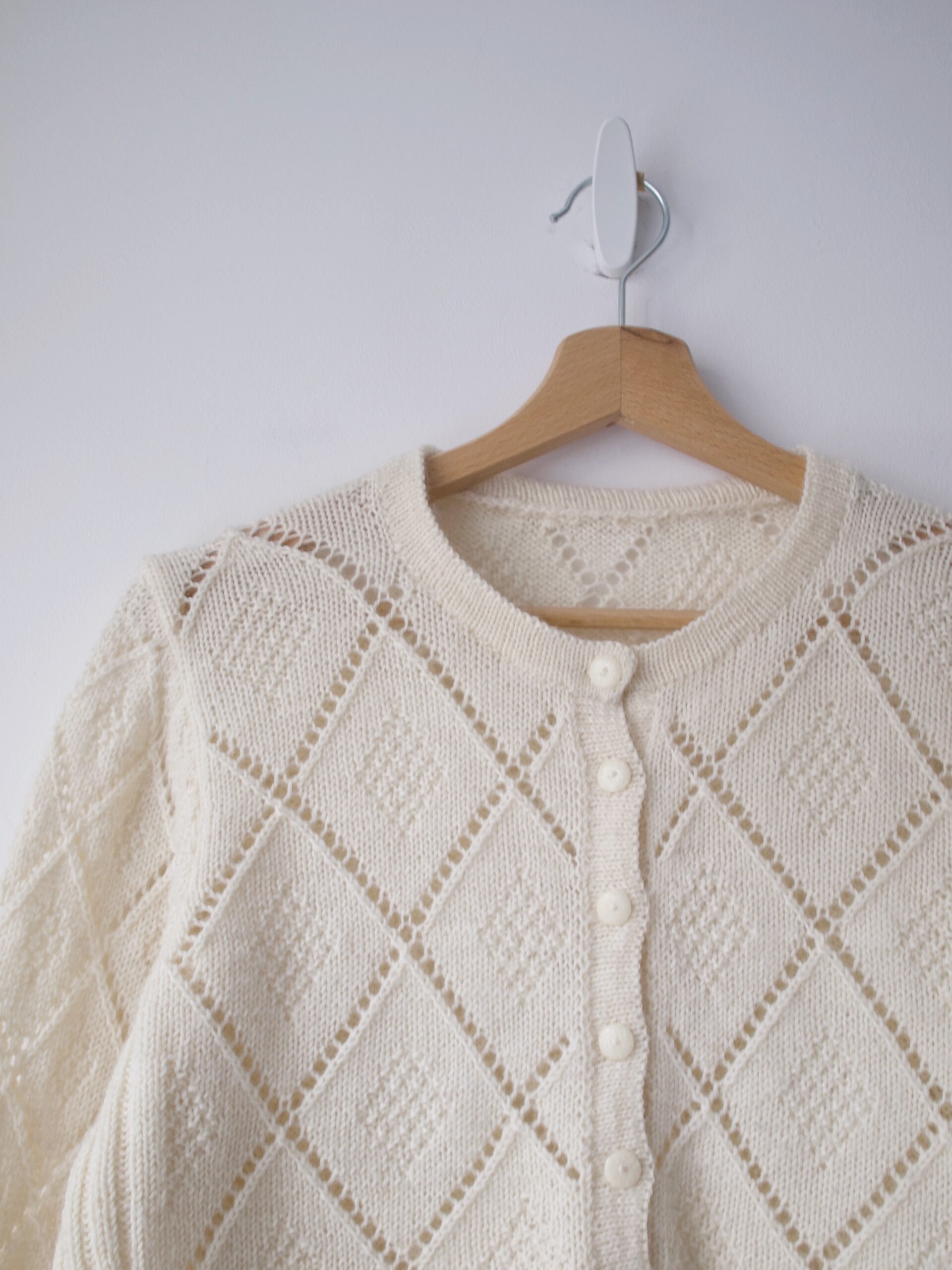Unikatowy ażurowy kardigan hand made. Rozmiar z metki: brak Skład: brak metki, wełna+moher Stan: bez wad Szerokość w klatce 47 cm Długośćcałkowita 56 cm