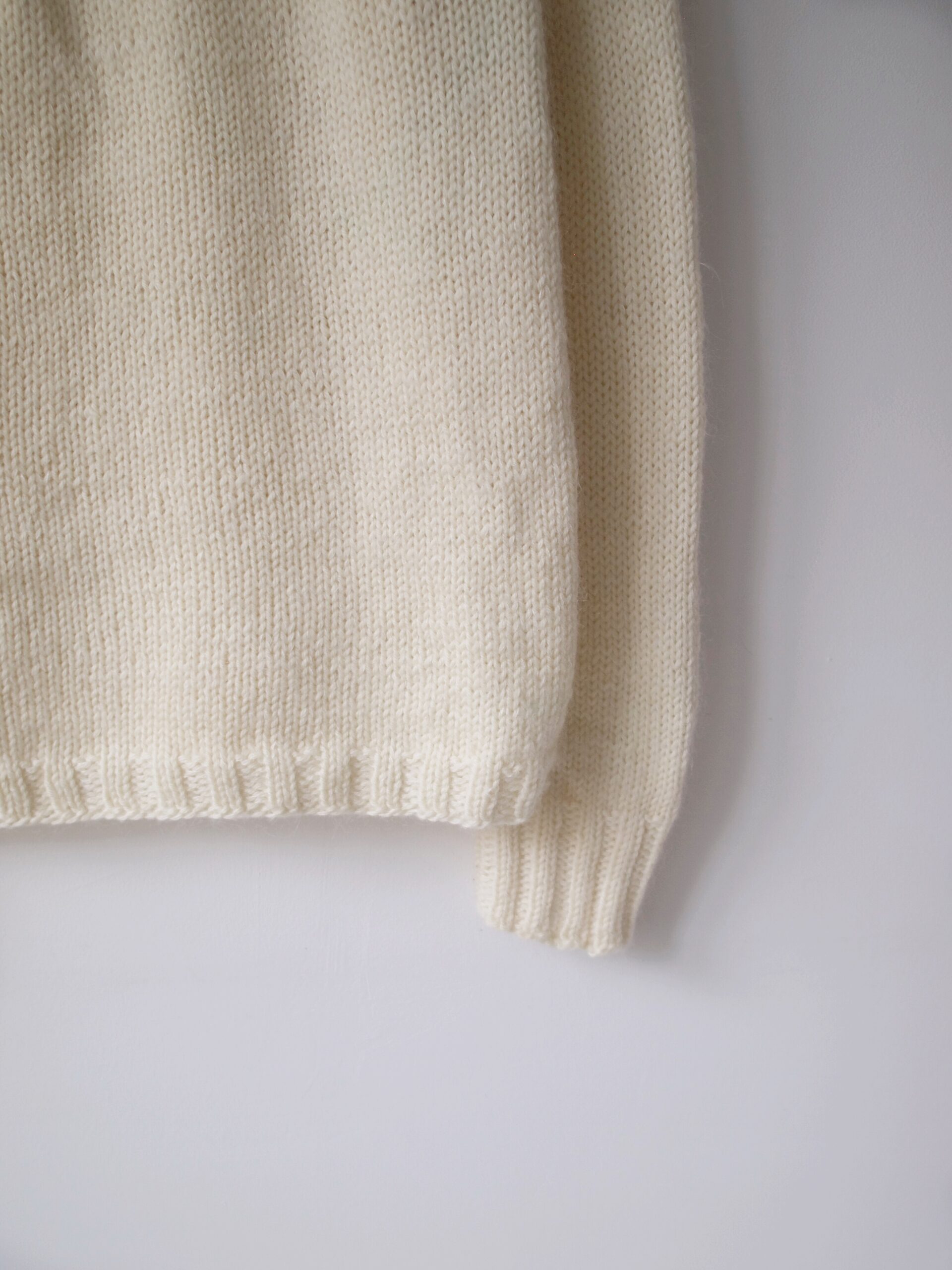 Unikatowy sweter hand made. Rozmiar z metki: brak Skład: brak metki, wełna/moher/poliamid Stan: bez wad Szerokość w klatce 53 cm Długośćcałkowita 60,5 cm